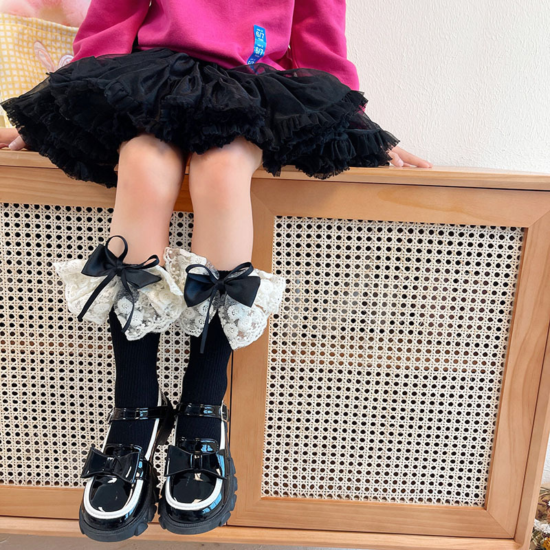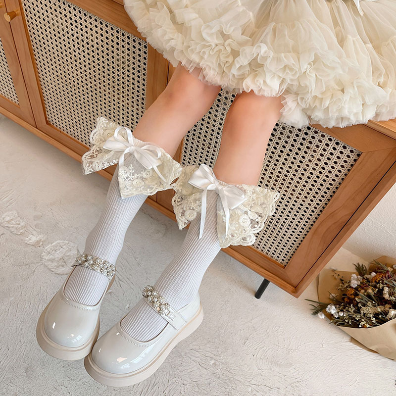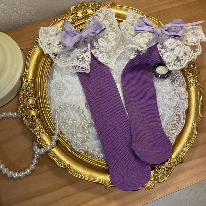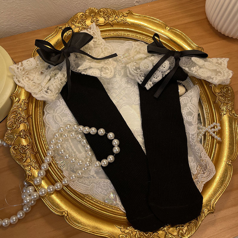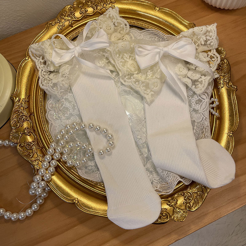 여아용 양말, 가을 겨울 아동용 면 양말, 궁궐 스타일 레이스 큰 리본 공주 양말, 종아리 중간 양말