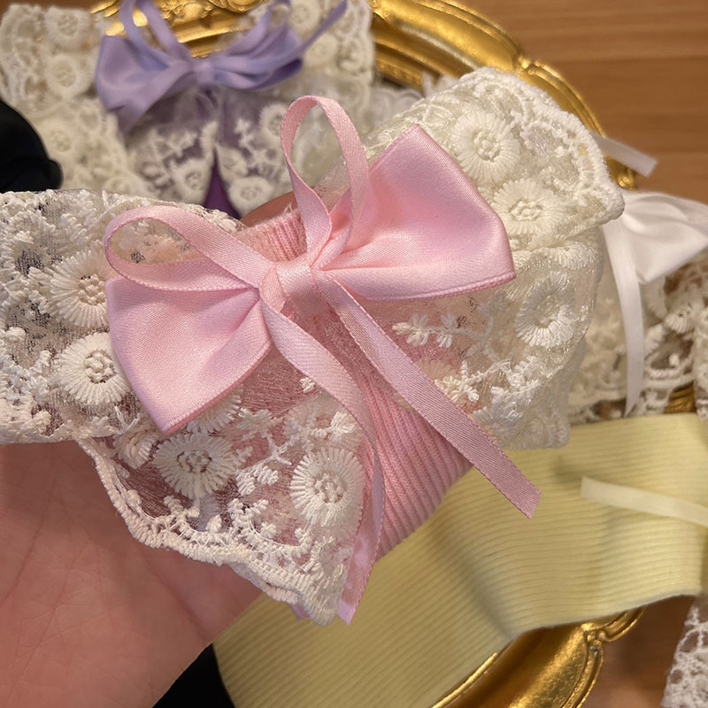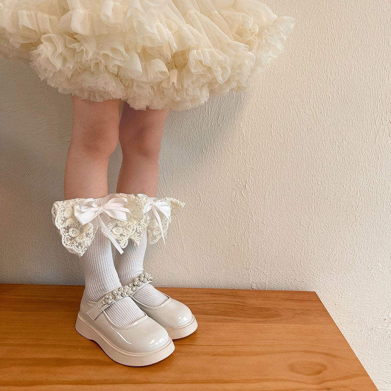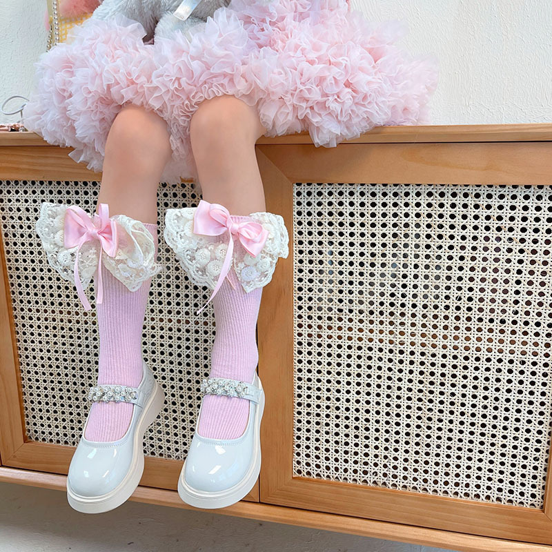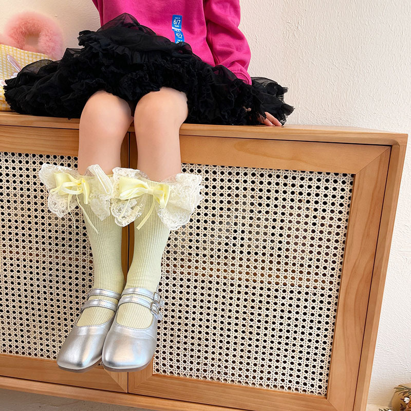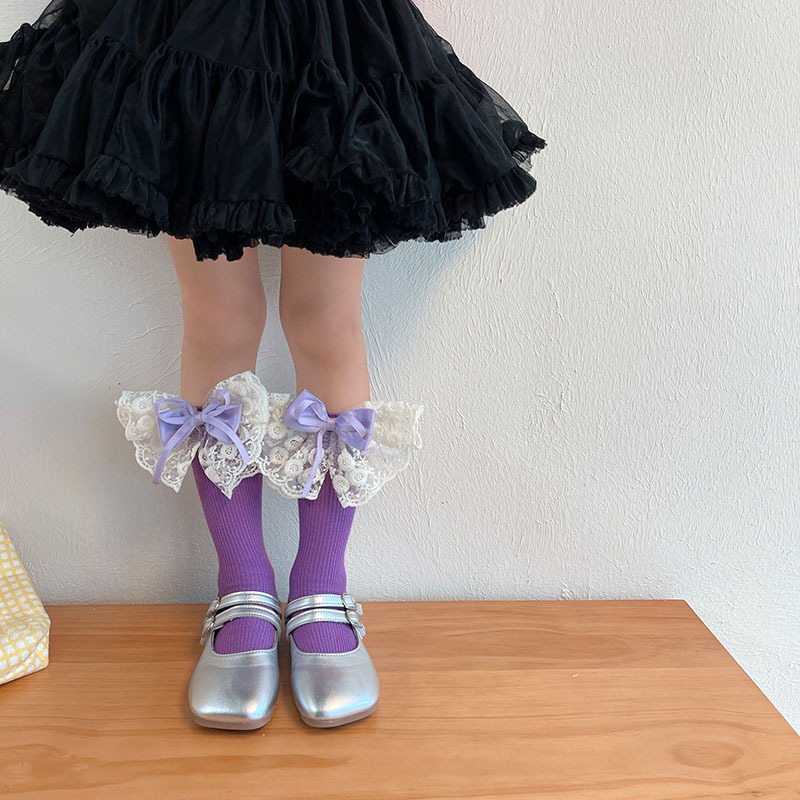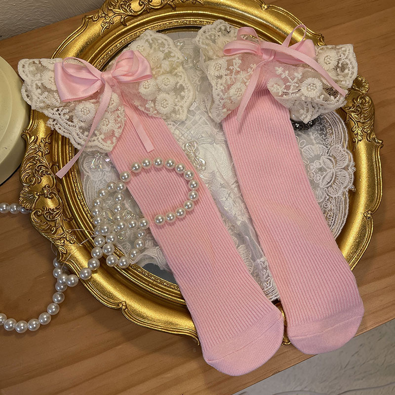 여아용 양말, 가을 겨울 아동용 면 양말, 궁궐 스타일 레이스 큰 리본 공주 양말, 종아리 중간 양말
