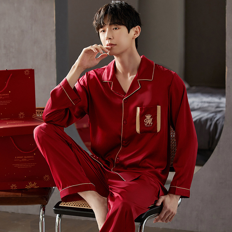 결혼 커플 잠옷 여성용 아이스 실크 레드 드레싱 가운 신부 웨딩 프렌치 스타일 잠옷 남성용 가디건 신혼 축하 세트스토어 가기