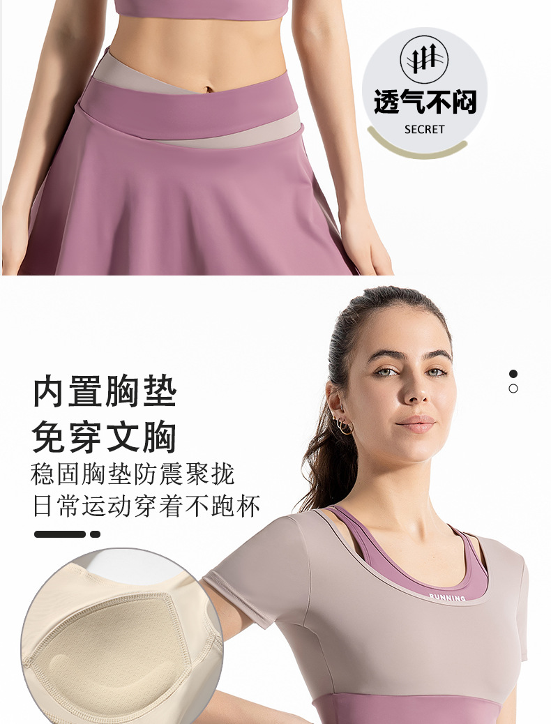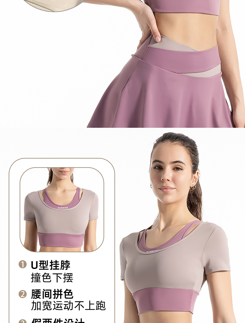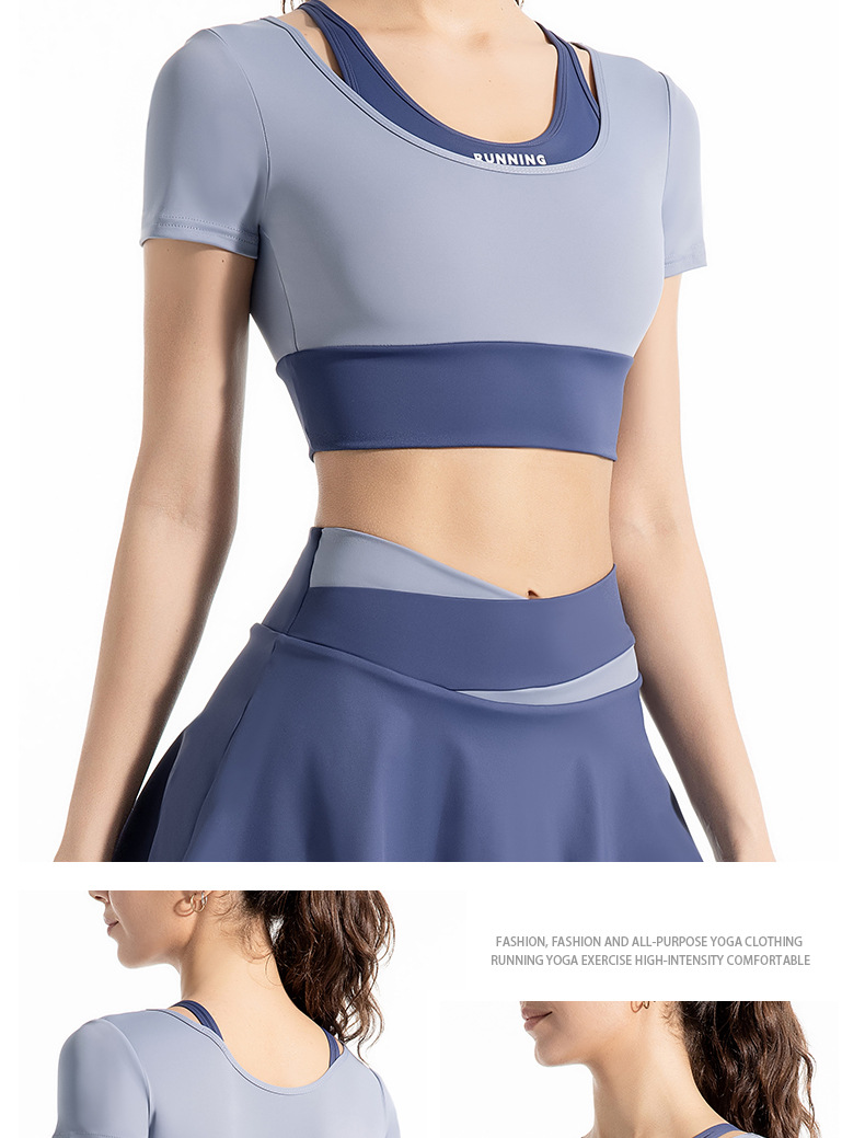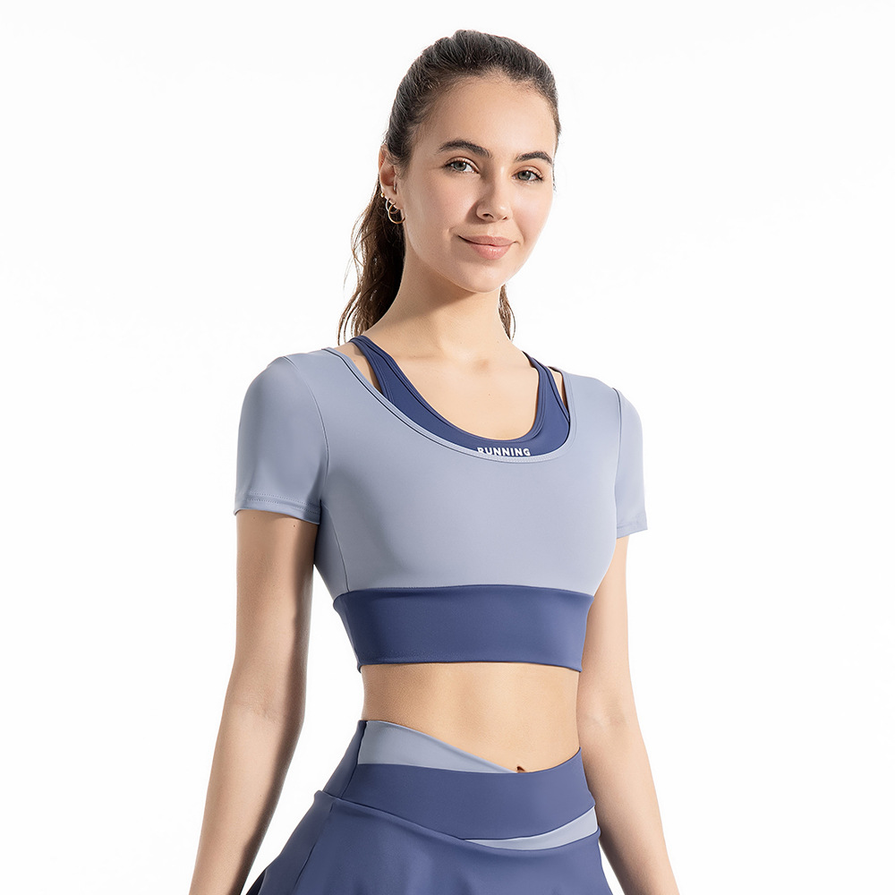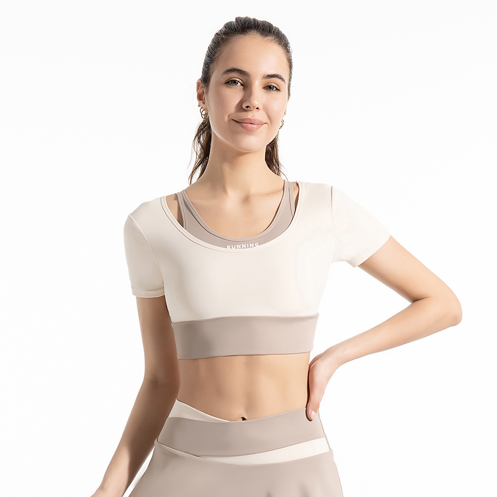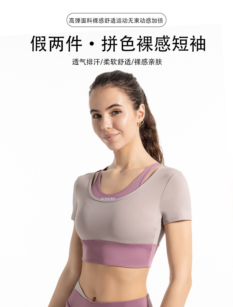 새로운 컬러 매칭 스트랩 아웃도어 웨어 가짜 투피스 스포츠 요가 세트 반팔 착용 프리 브라 고탄력 속건 피트니스 티셔츠스토어 가기