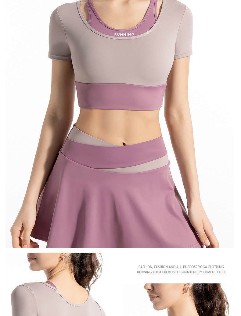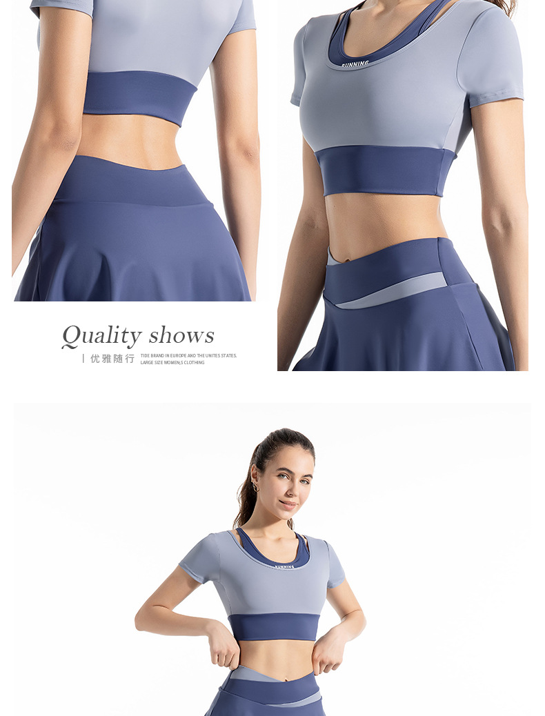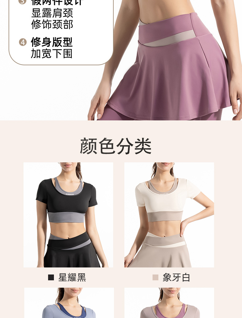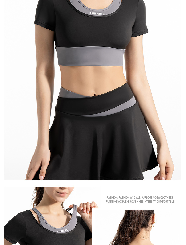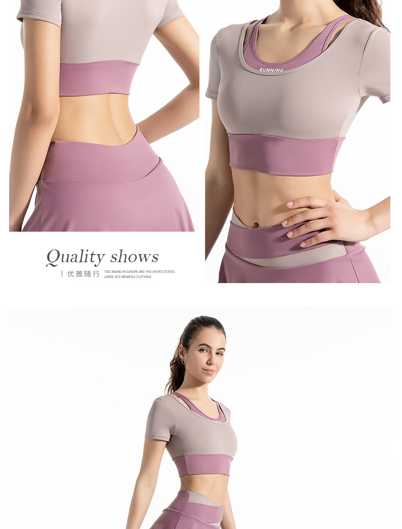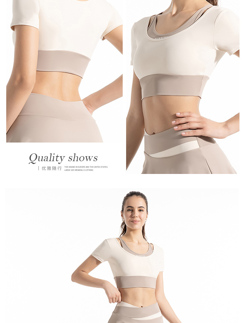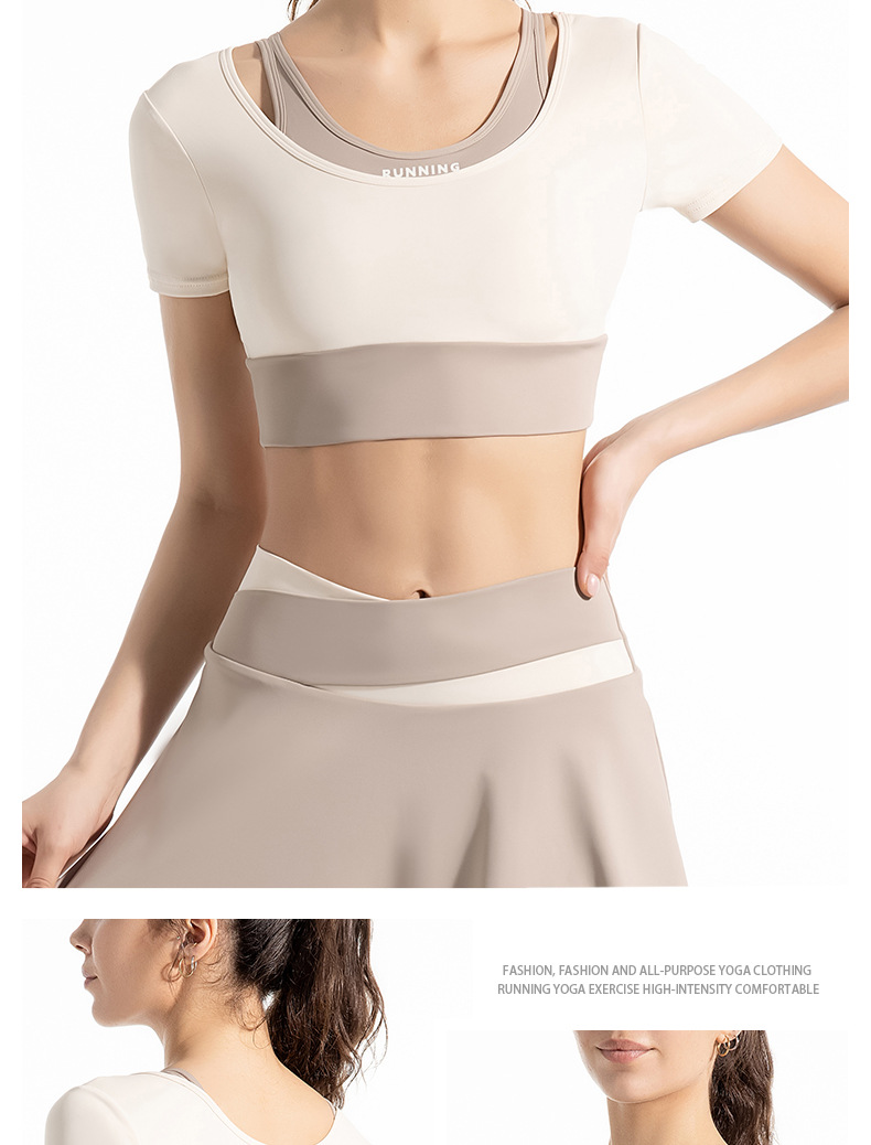 새로운 컬러 매칭 스트랩 아웃도어 웨어 가짜 투피스 스포츠 요가 세트 반팔 착용 프리 브라 고탄력 속건 피트니스 티셔츠스토어 가기