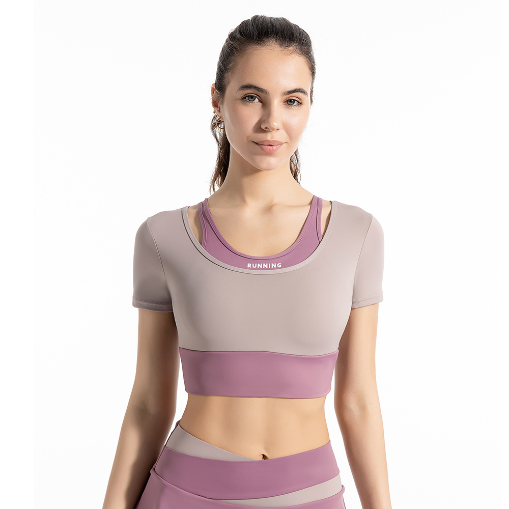 새로운 컬러 매칭 스트랩 아웃도어 웨어 가짜 투피스 스포츠 요가 세트 반팔 착용 프리 브라 고탄력 속건 피트니스 티셔츠
