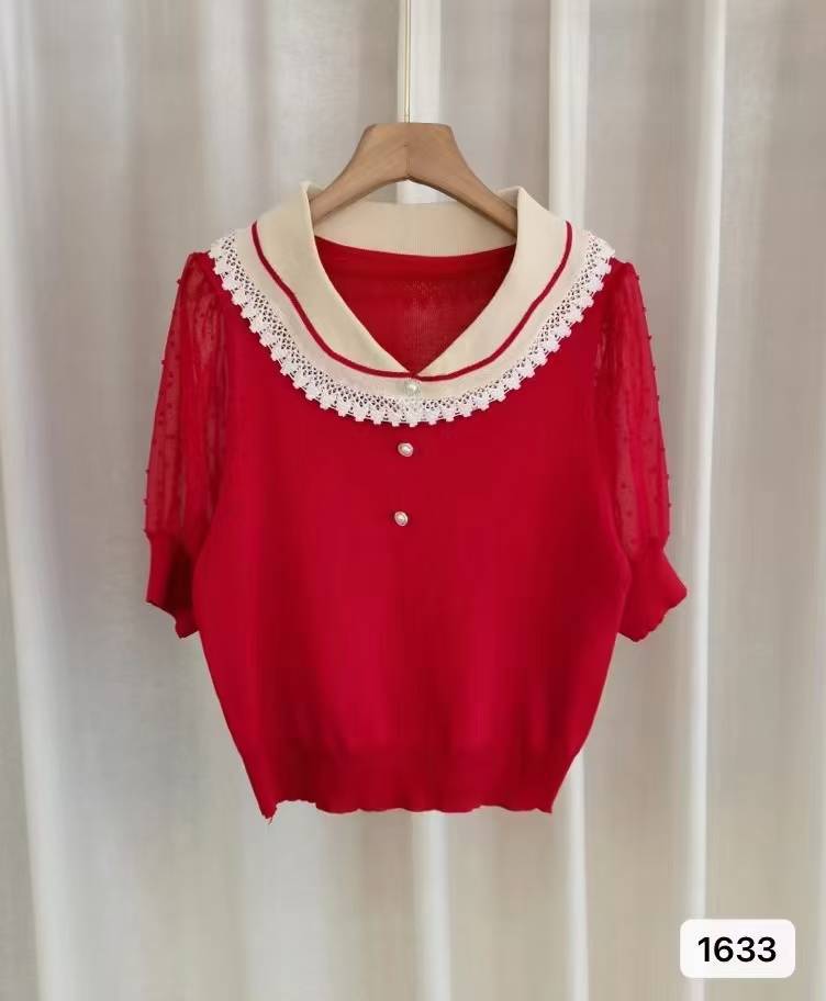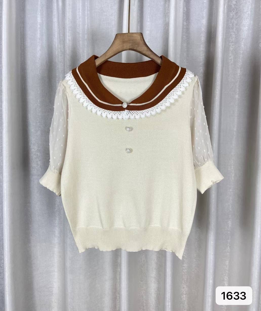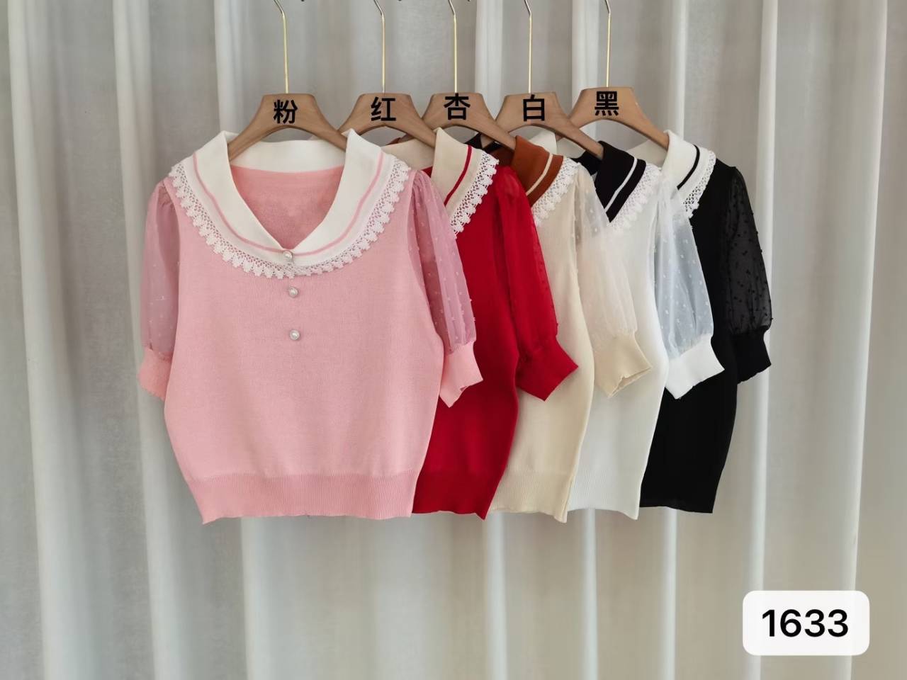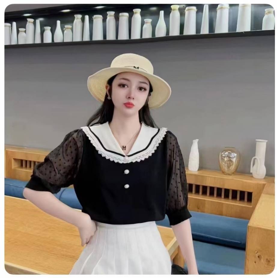 2023夏季新款韩系V领气质薄款冰丝针织小衫甜美减龄雪纺短袖上衣