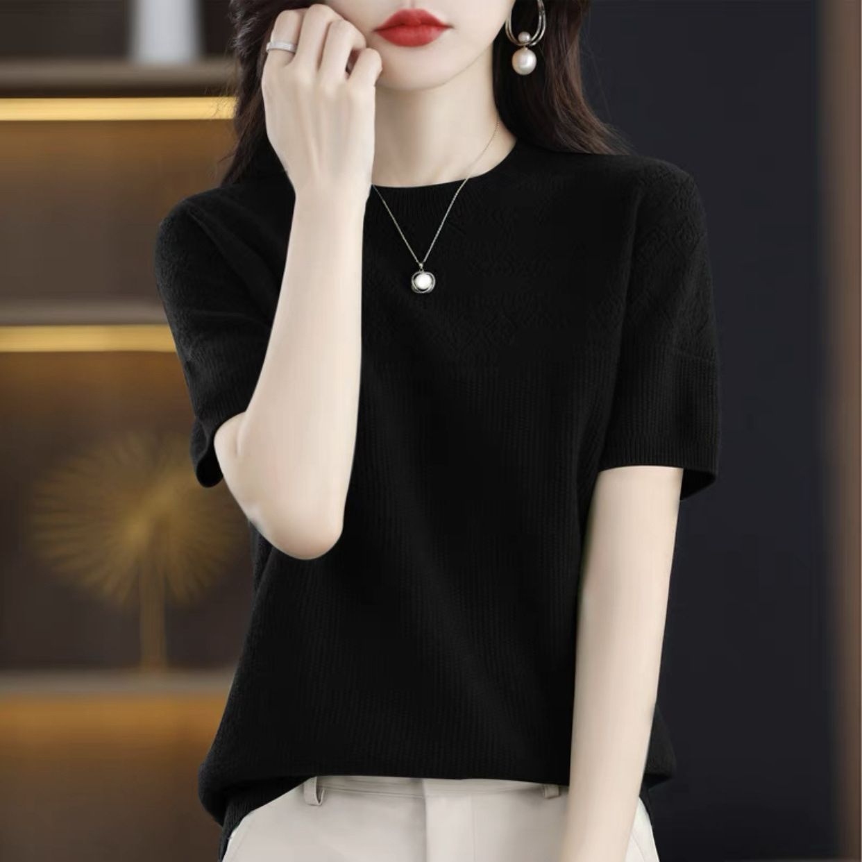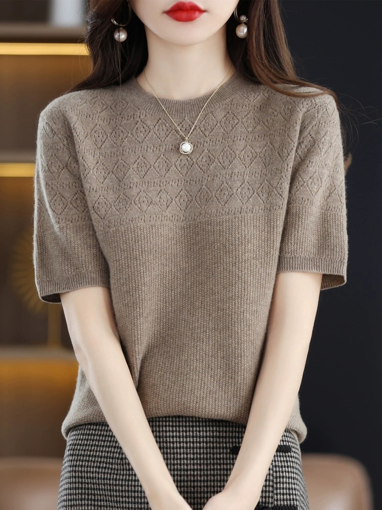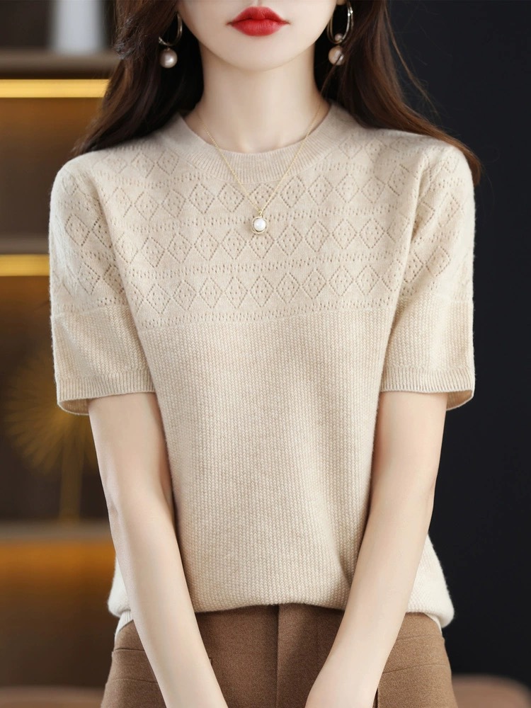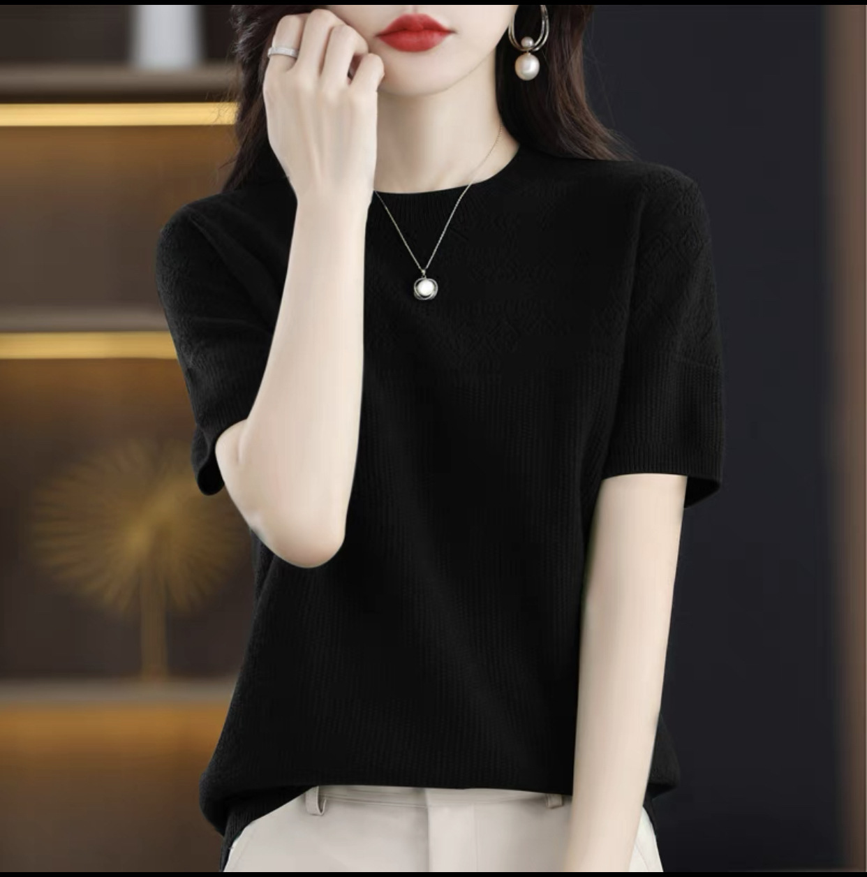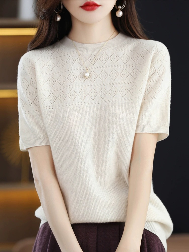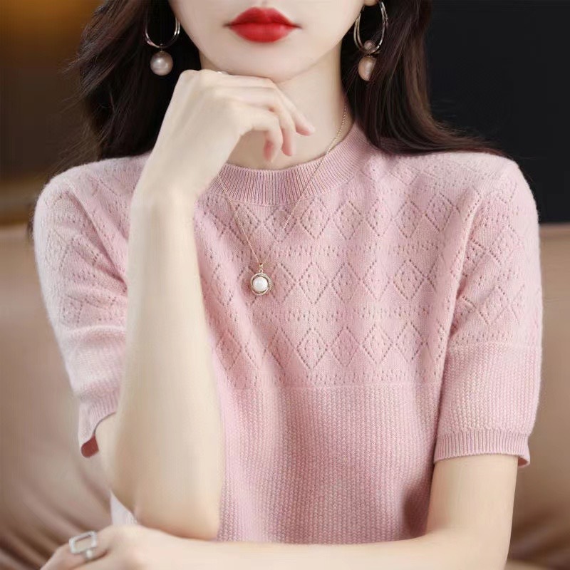 한국판 반팔 티셔츠 여성 여름 2023 새로운 라운드 넥 반팔 얇은 중공 짧은 스웨터 탑 도매스토어 가기