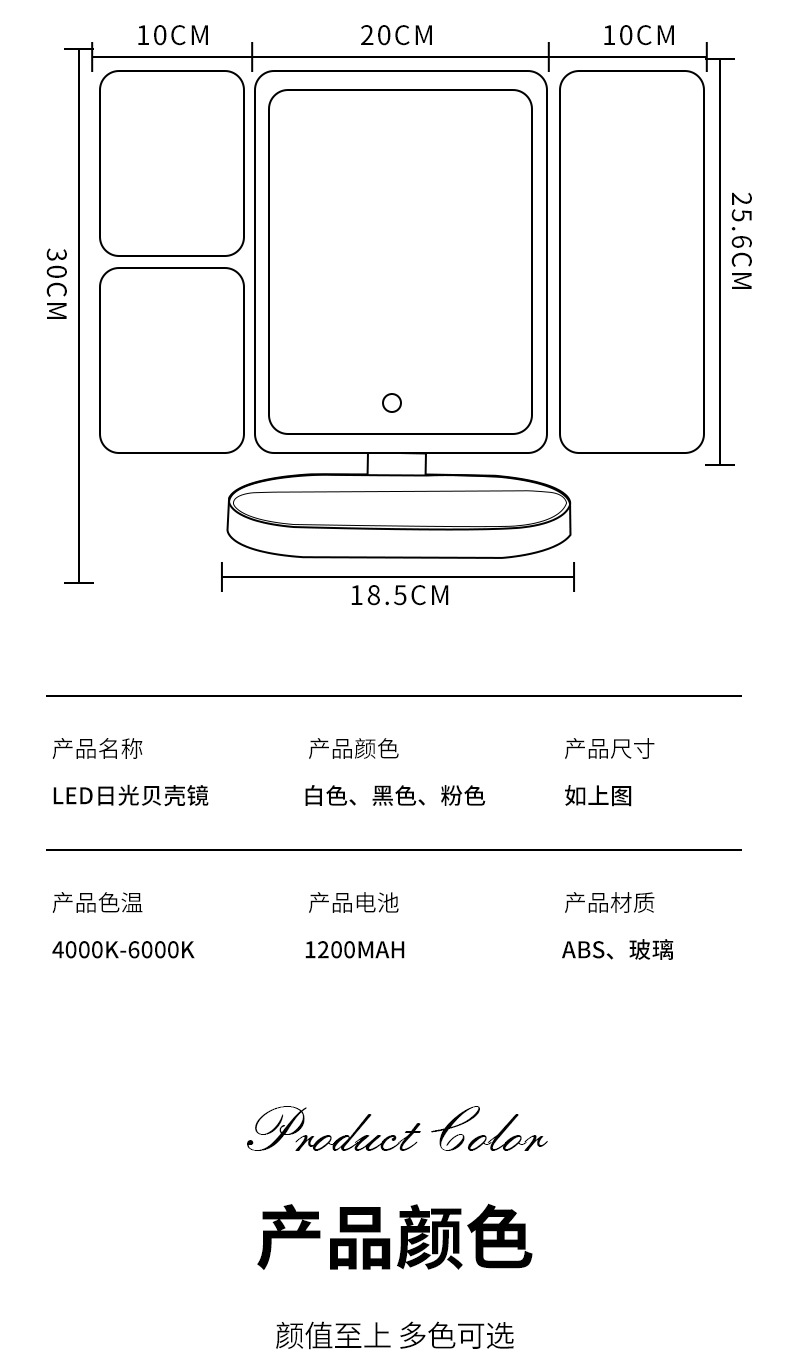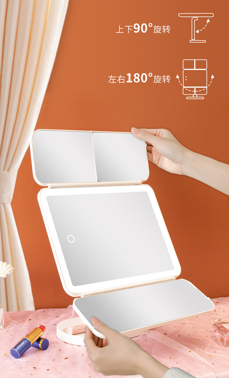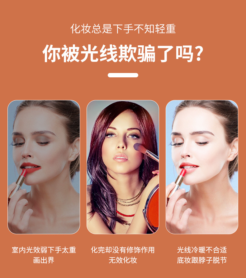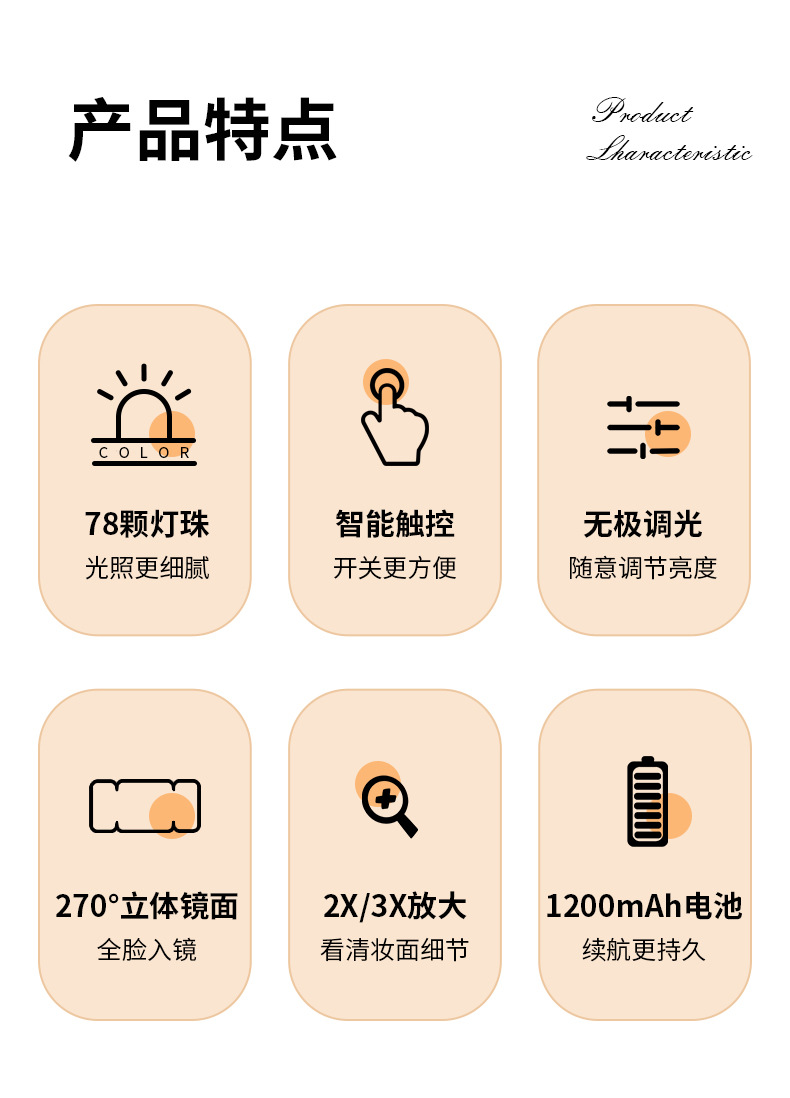 【功 能】三色灯光,智能触摸按键+无极调光,双按键开关控制,充插两用,上下左右可以旋转角度,底座可以拆卸