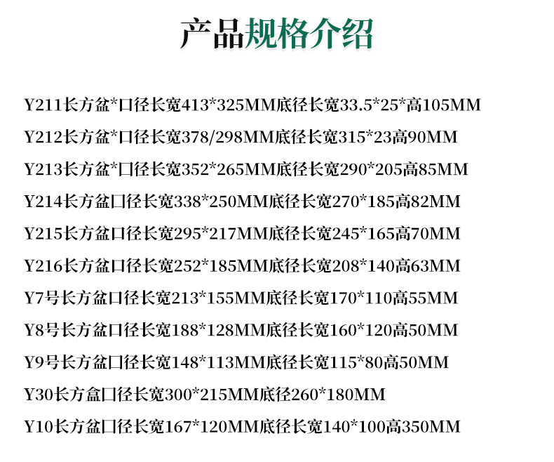 • C211 직사각형 분지 * 구경 길이 및 너비 413*325 * 바닥 직경 길이 및 너비 33.5*25 * 높이 105