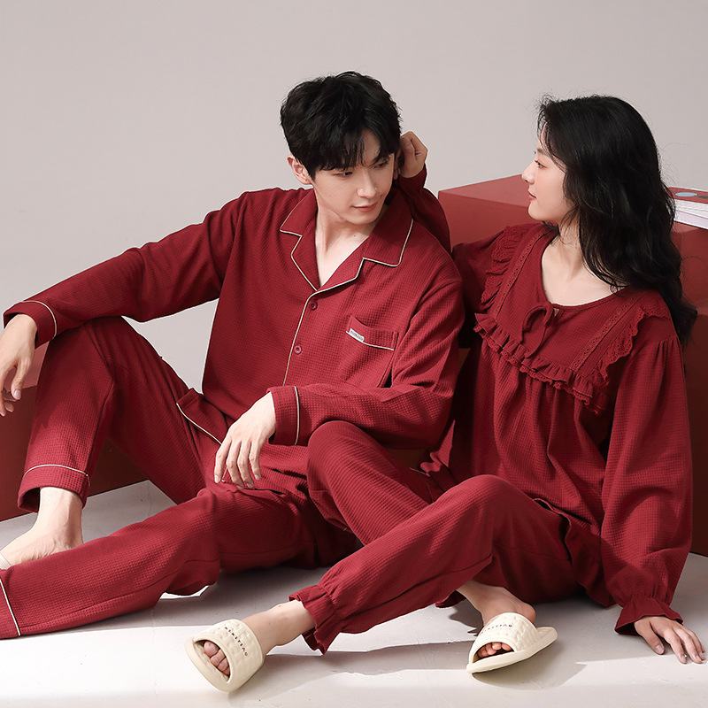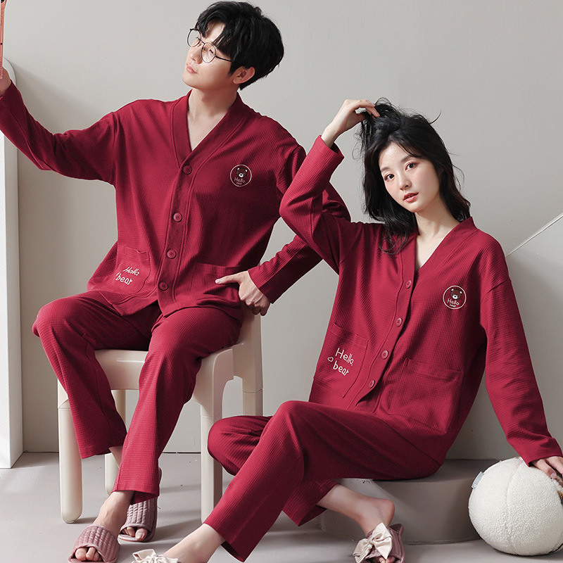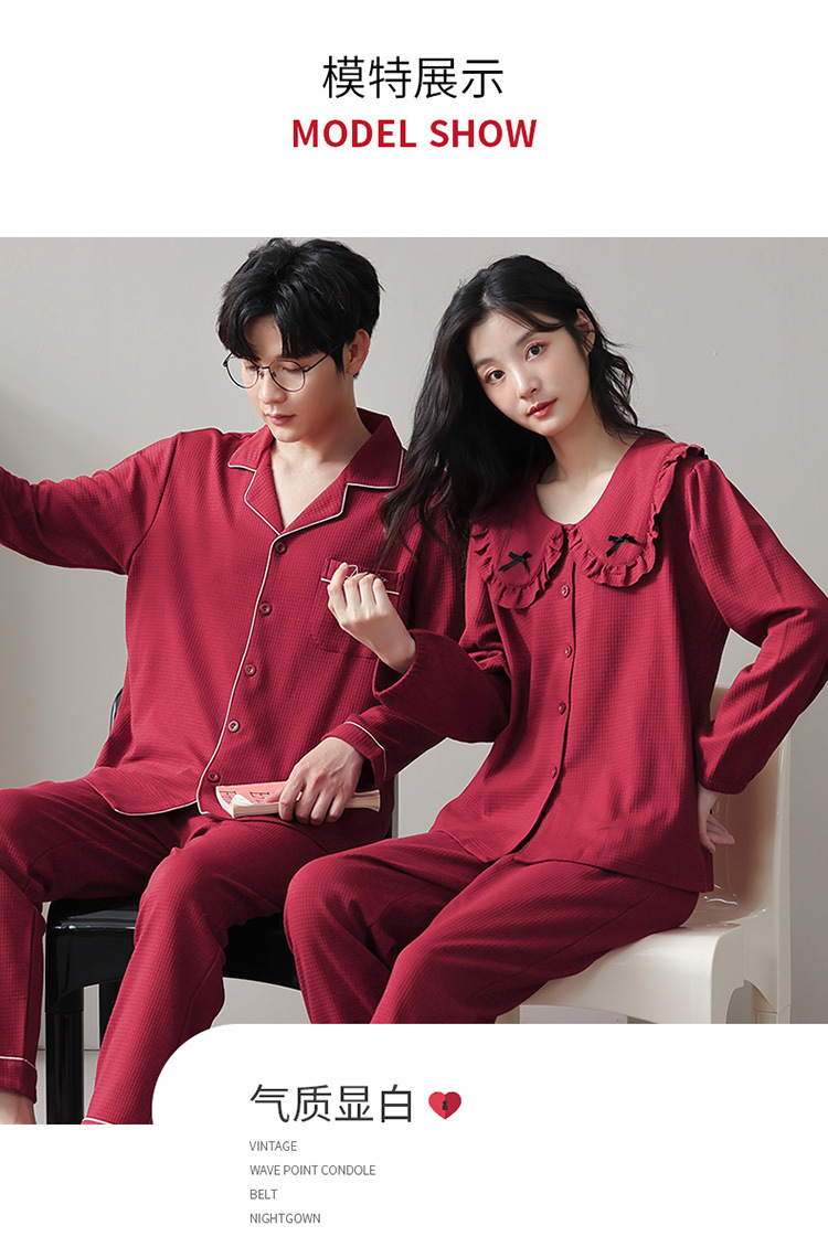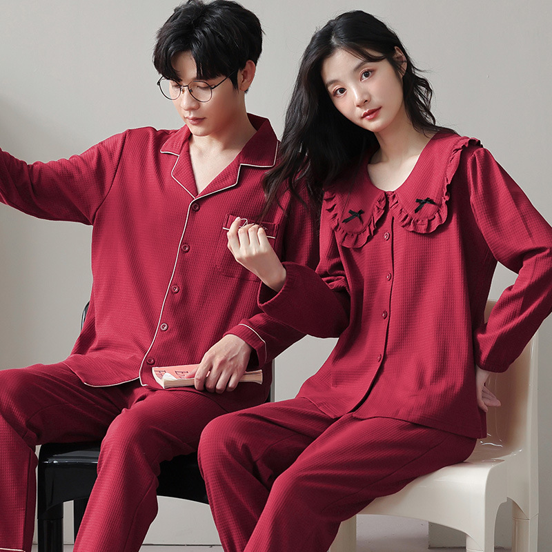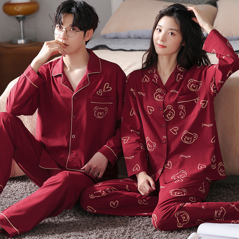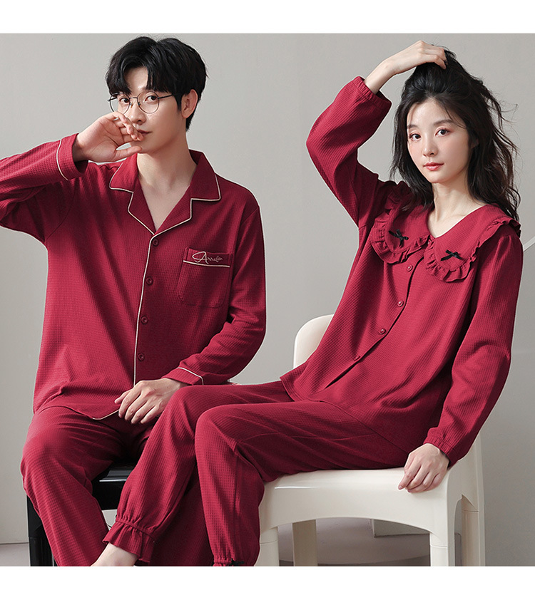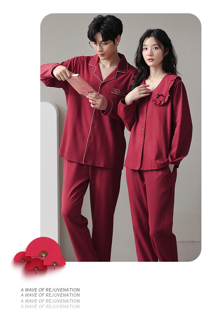 커플 스타일 잠옷 여성 가을, 겨울 순수 코튼 카디건 빅 레드 웨딩 웨딩 남성 전체 홈웨어 세트 웨딩스토어 가기