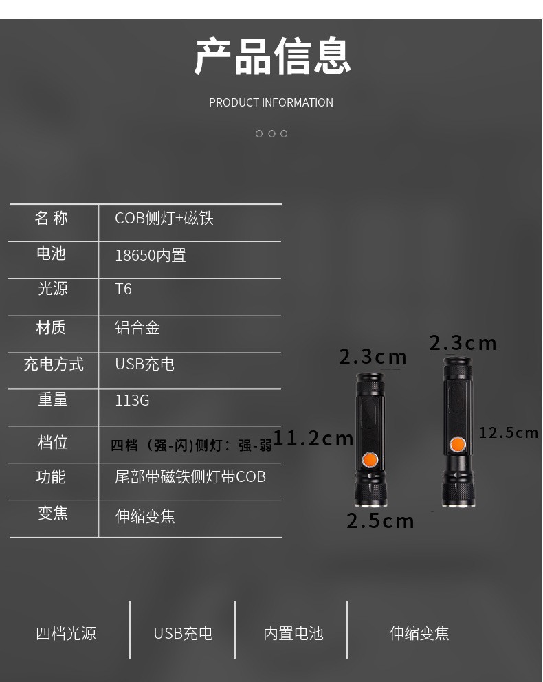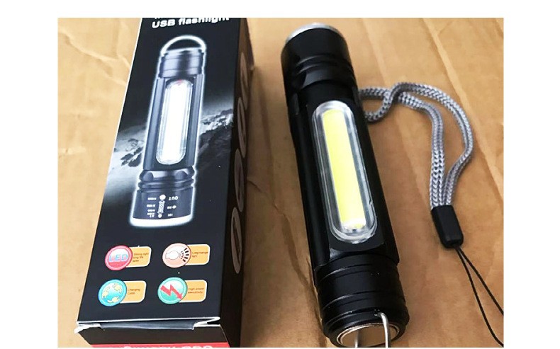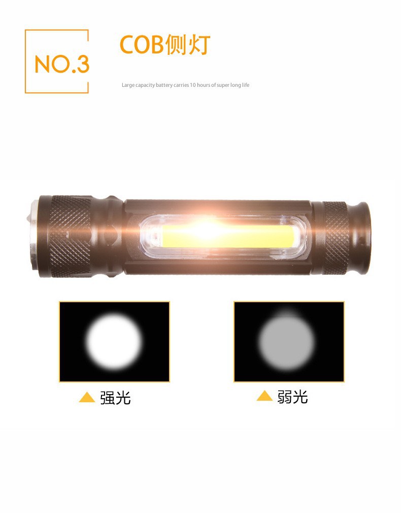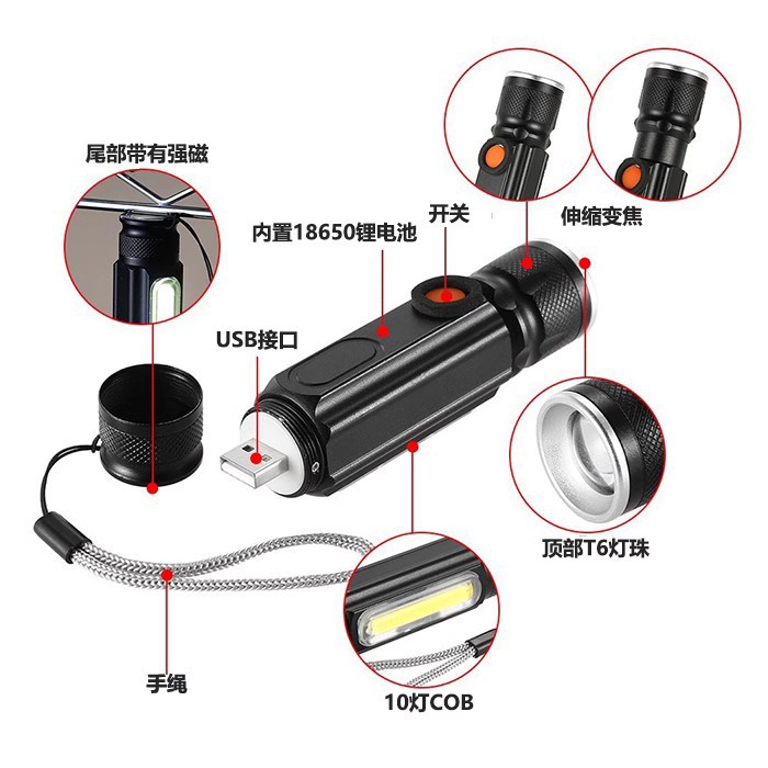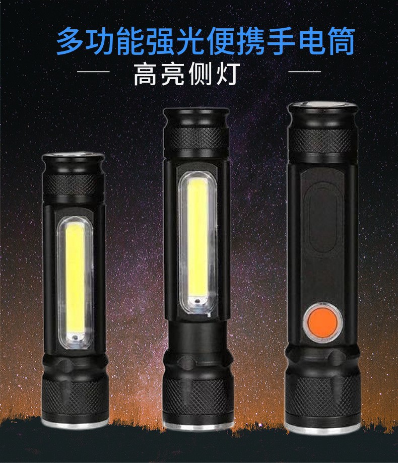 야외 조명 usb 충전식 줌 미니 손전등 다기능 LED 강한 조명 손전등 cob 측면 조명