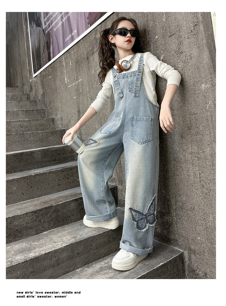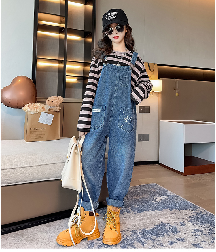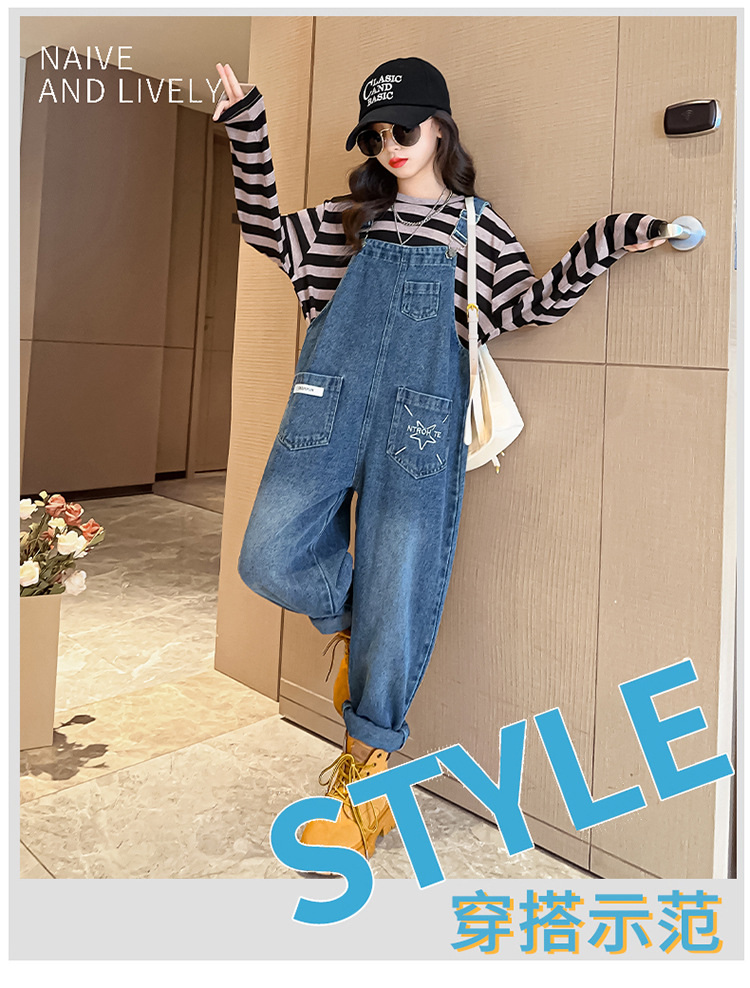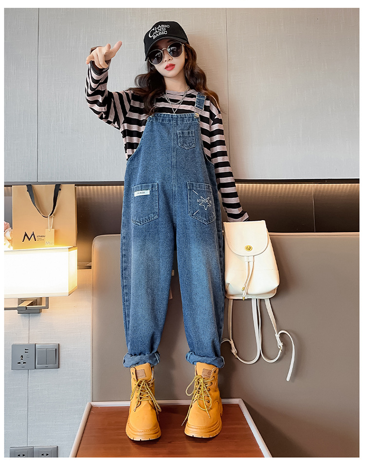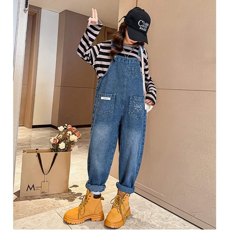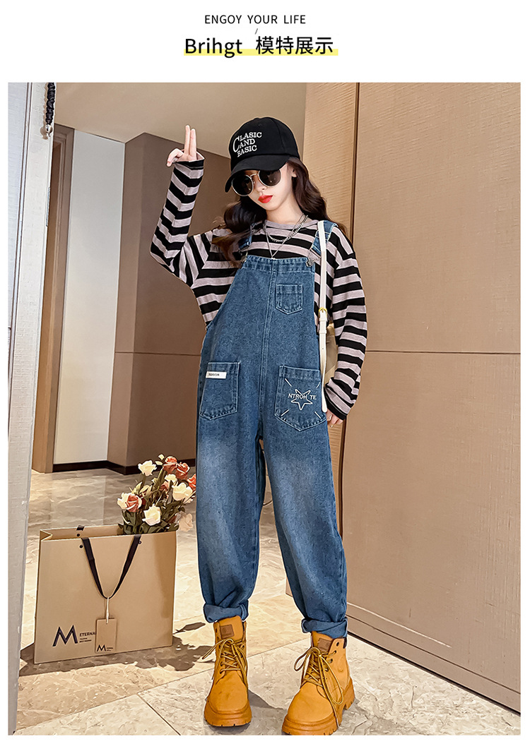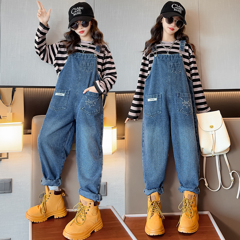 소녀들의 데님 2025 년 봄과 가을 새로운 도착 중년 어린이 인터넷 연예인 느슨한 유행 올매치 데님 오버롤스토어 가기