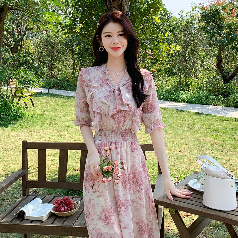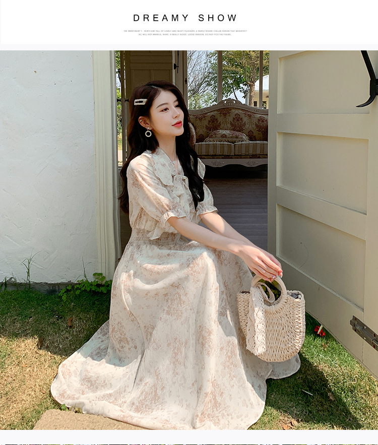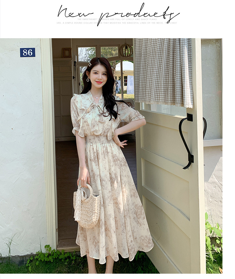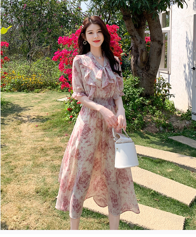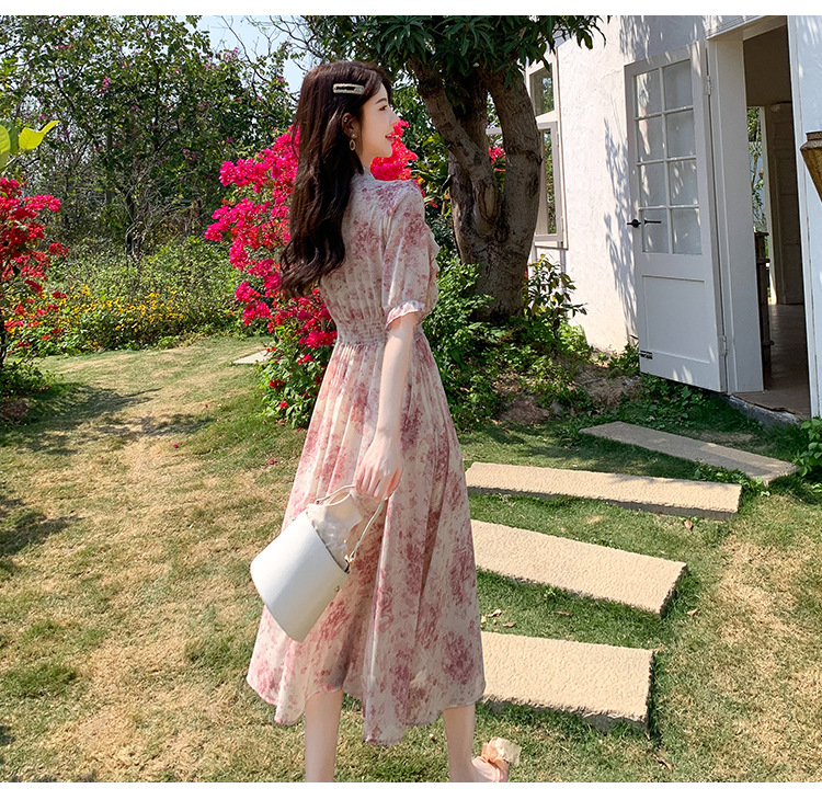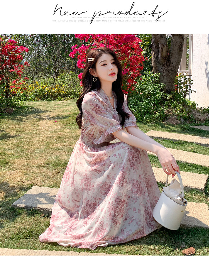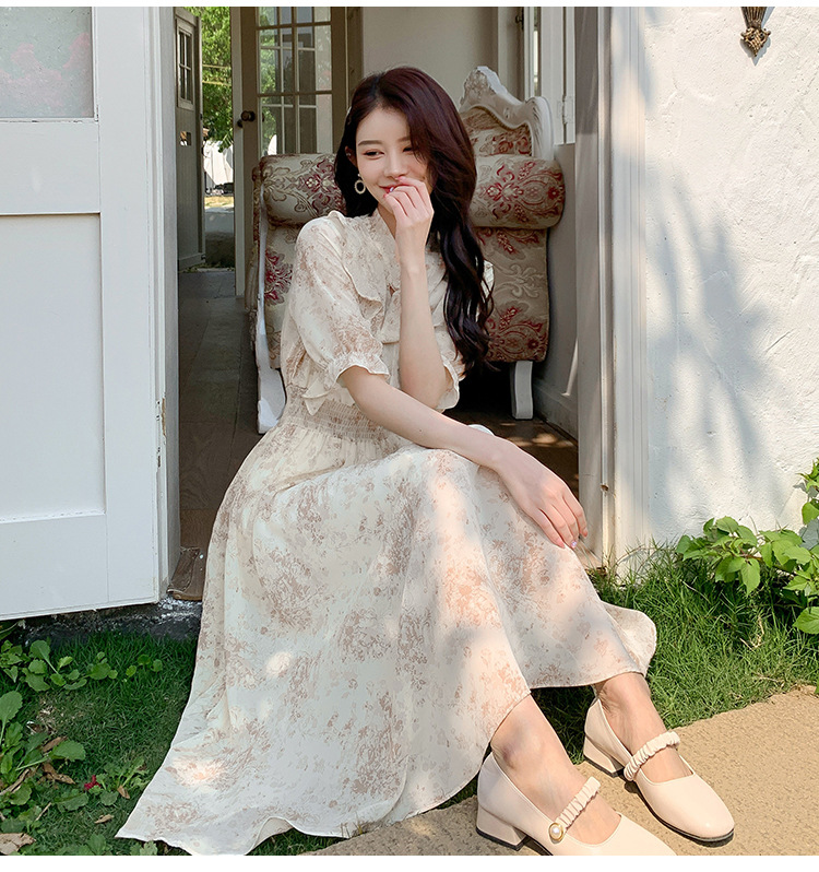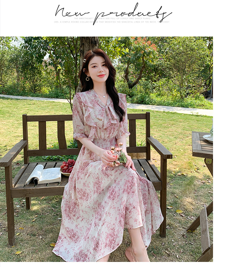 유럽과 미국의 여름 얇은 달콤한 프릴 반팔 꽃 무늬 스커트 여성 쉬폰 느슨한 대형 부드러운 스타일 드레스