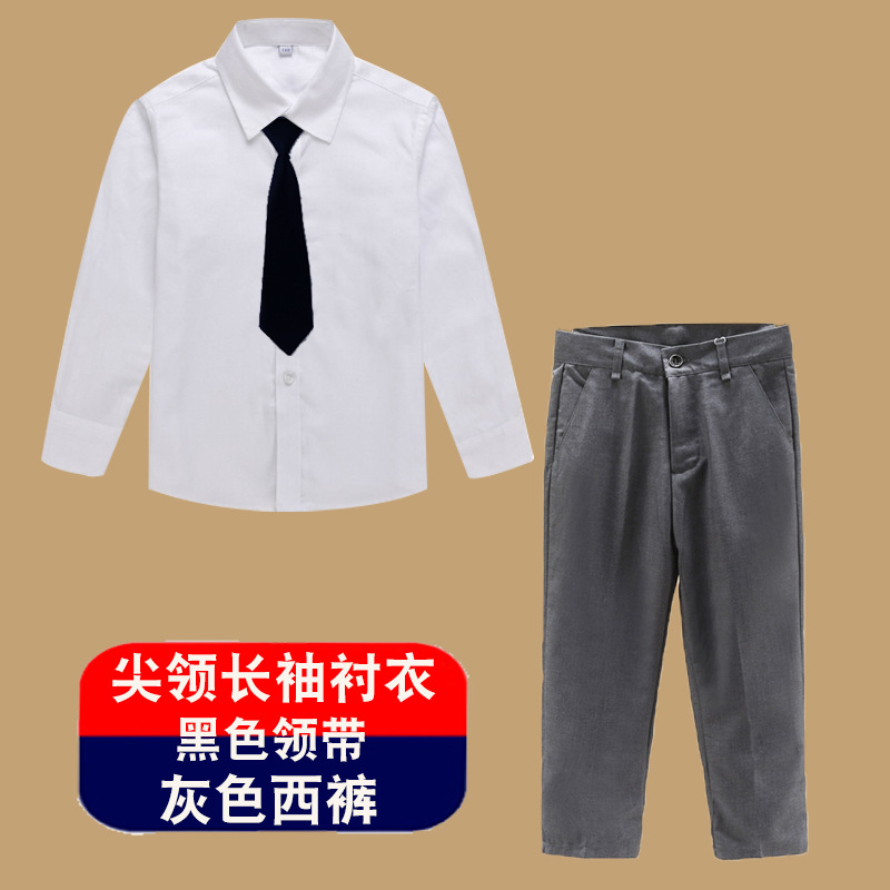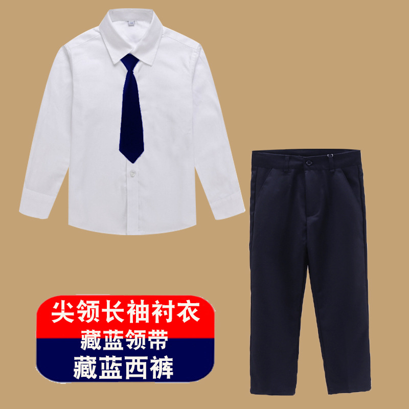 • 네이비 세트 바지 + 뾰족한 칼라 긴 소매 + 파란색 넥타이