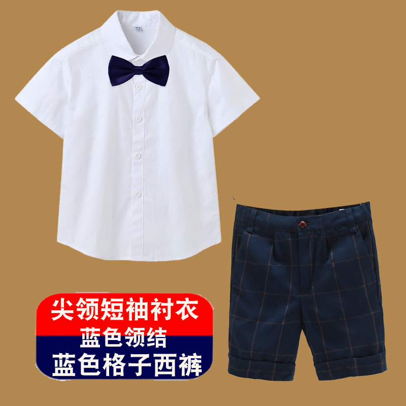 • 뾰족한 칼라 반팔 + 파란색 격자 무늬 반바지 바지 네이비 나비 넥타이