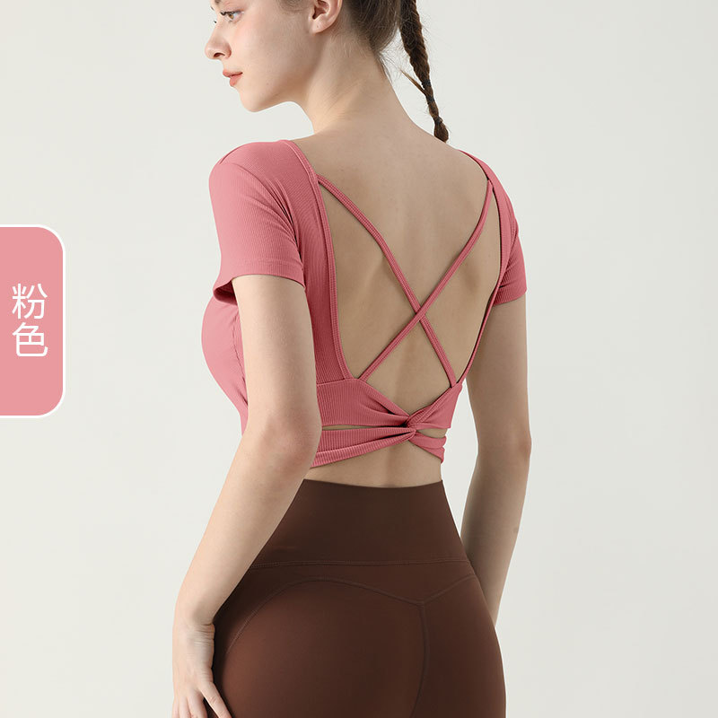 여성용 크로스백 요가복, 여름 가슴 패드, 일체형 스포츠 블라우스, 속건성 피트니스 반팔 요가 필라테스 상의