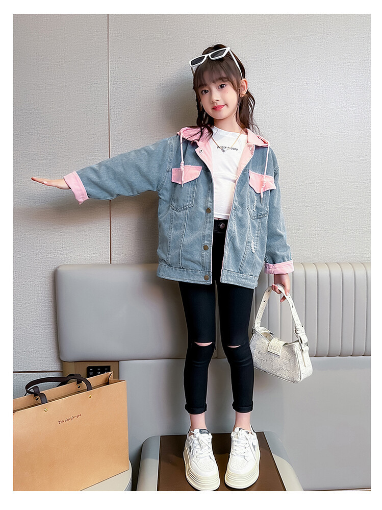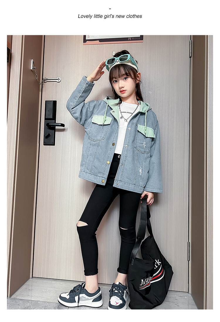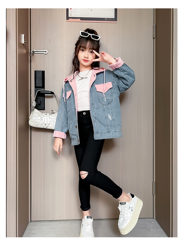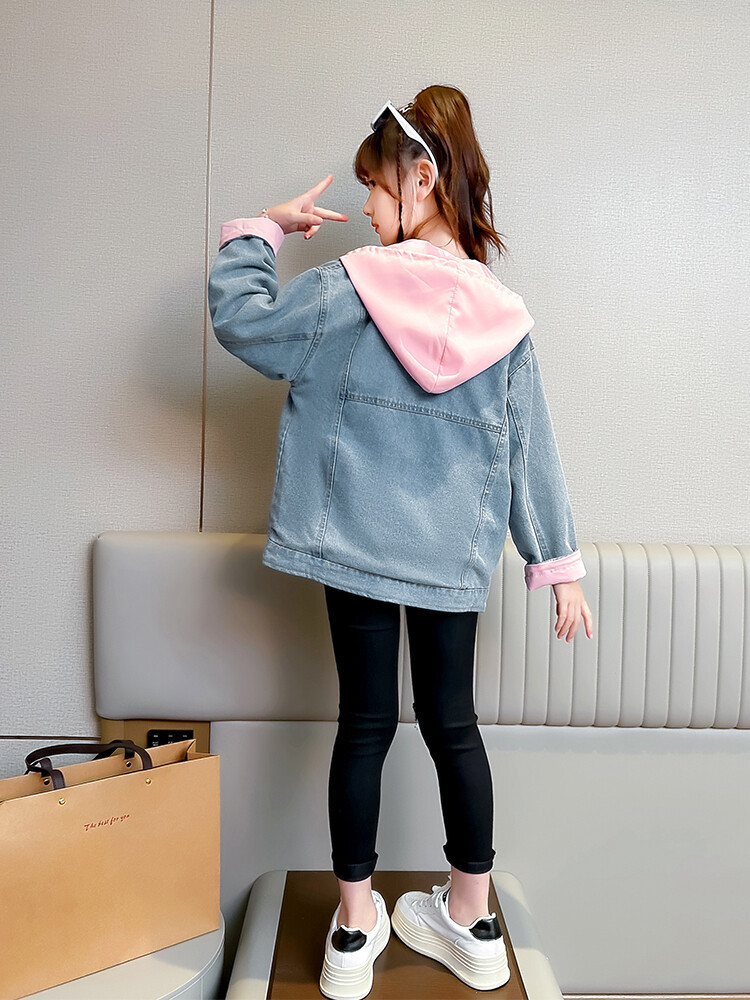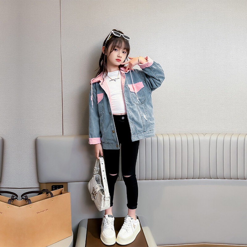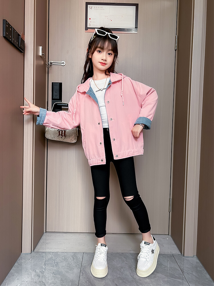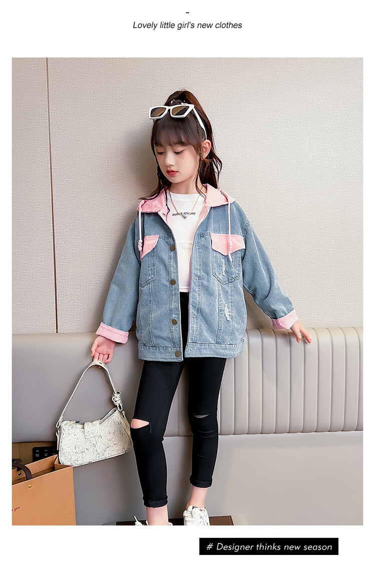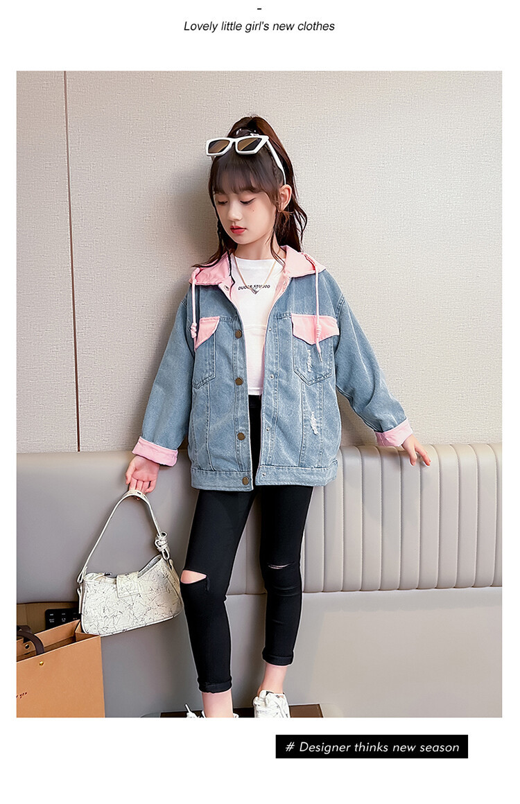 여자 봄과 가을 데님 코트 2023 새로운 어린이 서양 스타일 가을 옷 큰 어린이 소녀와 소녀 양면 착용 데님
