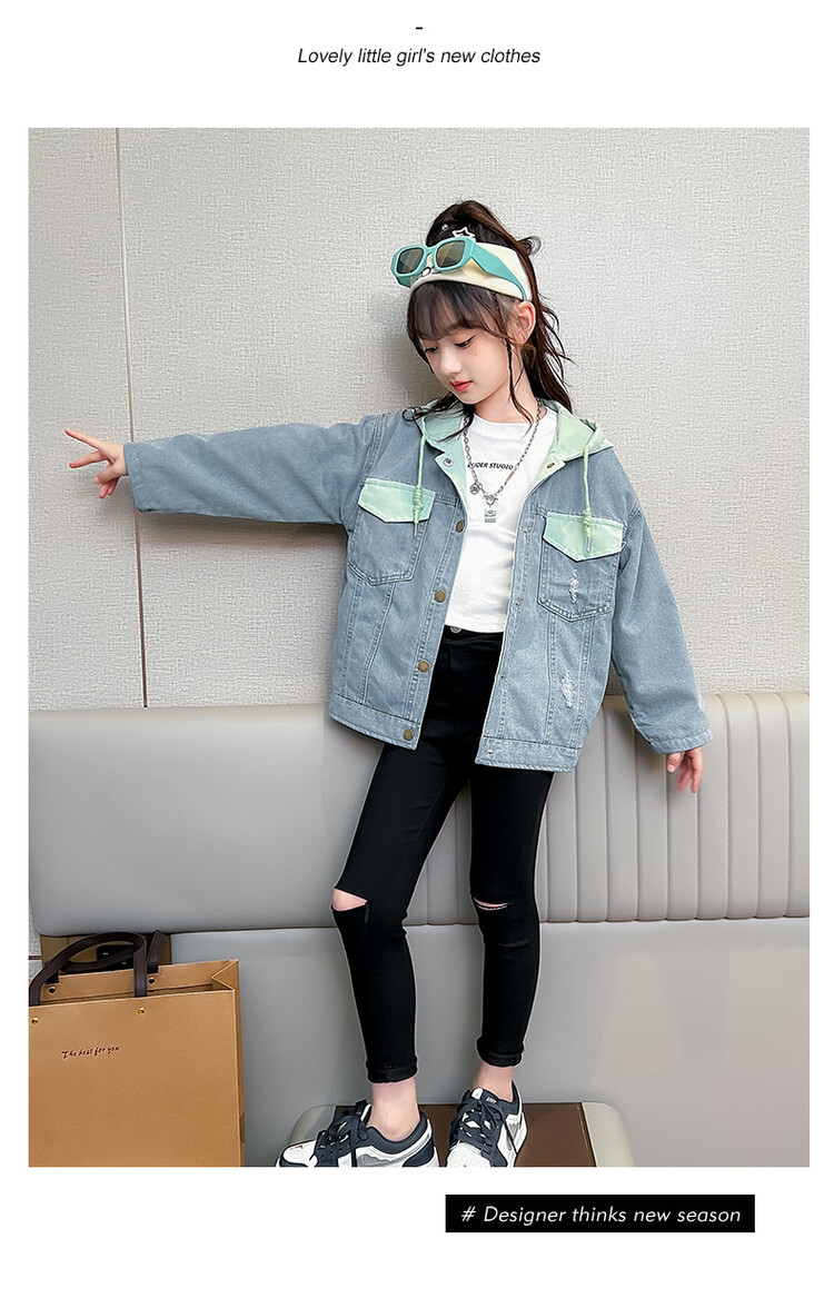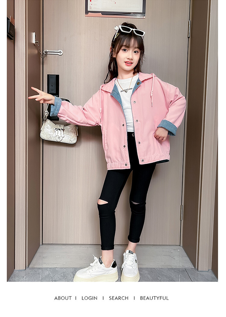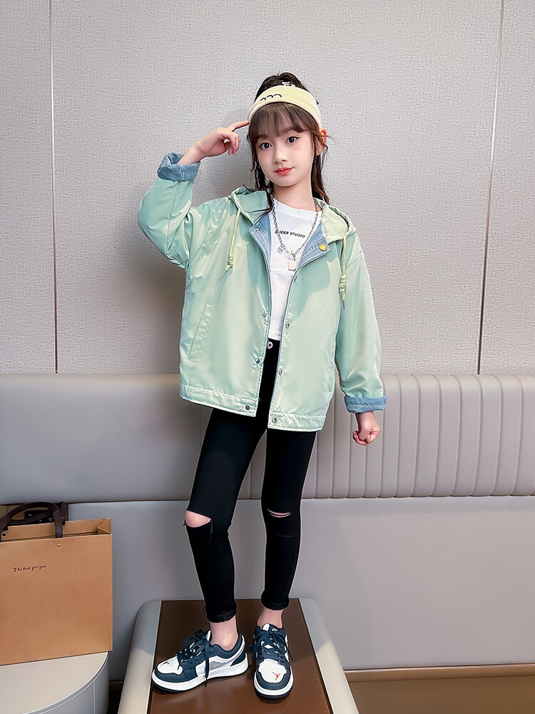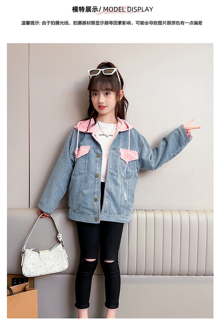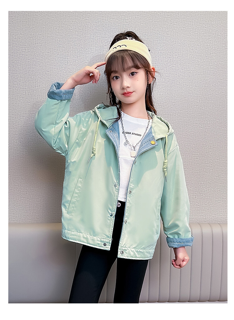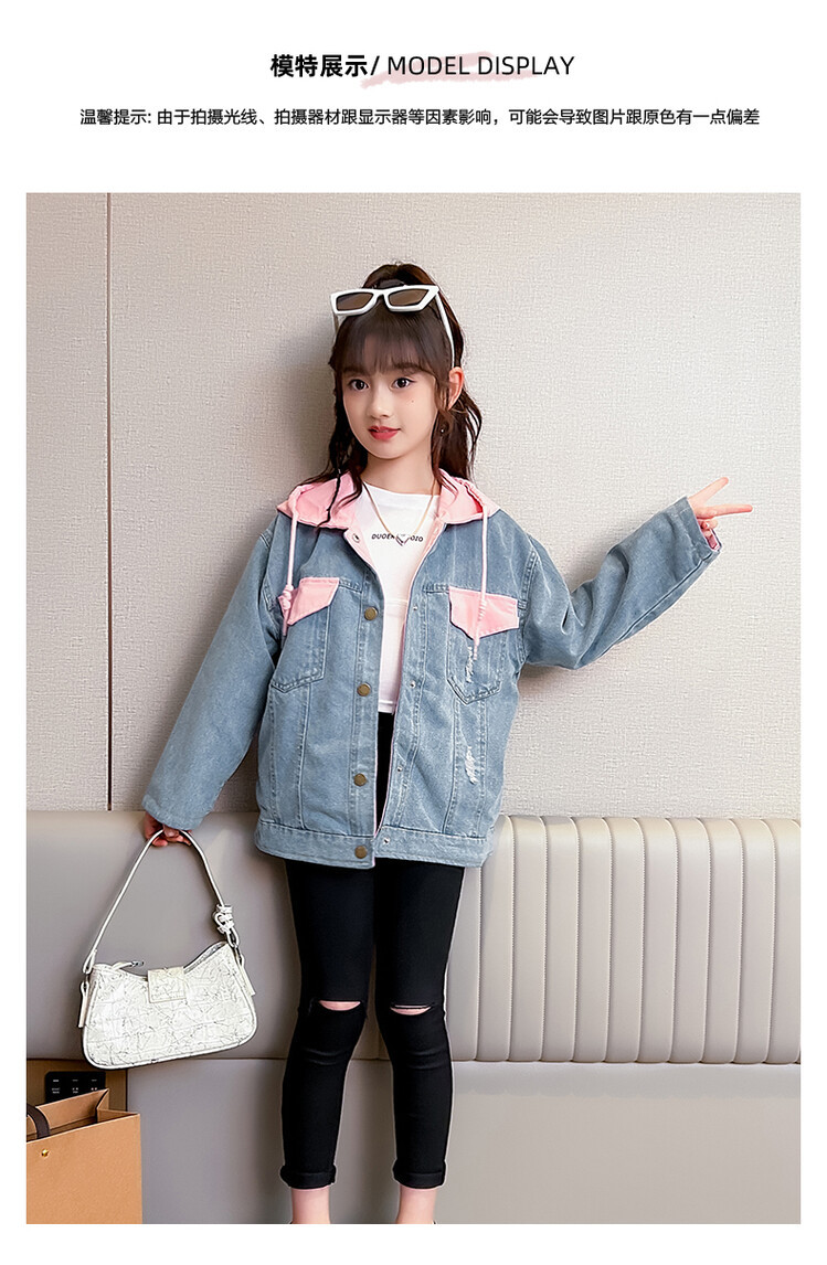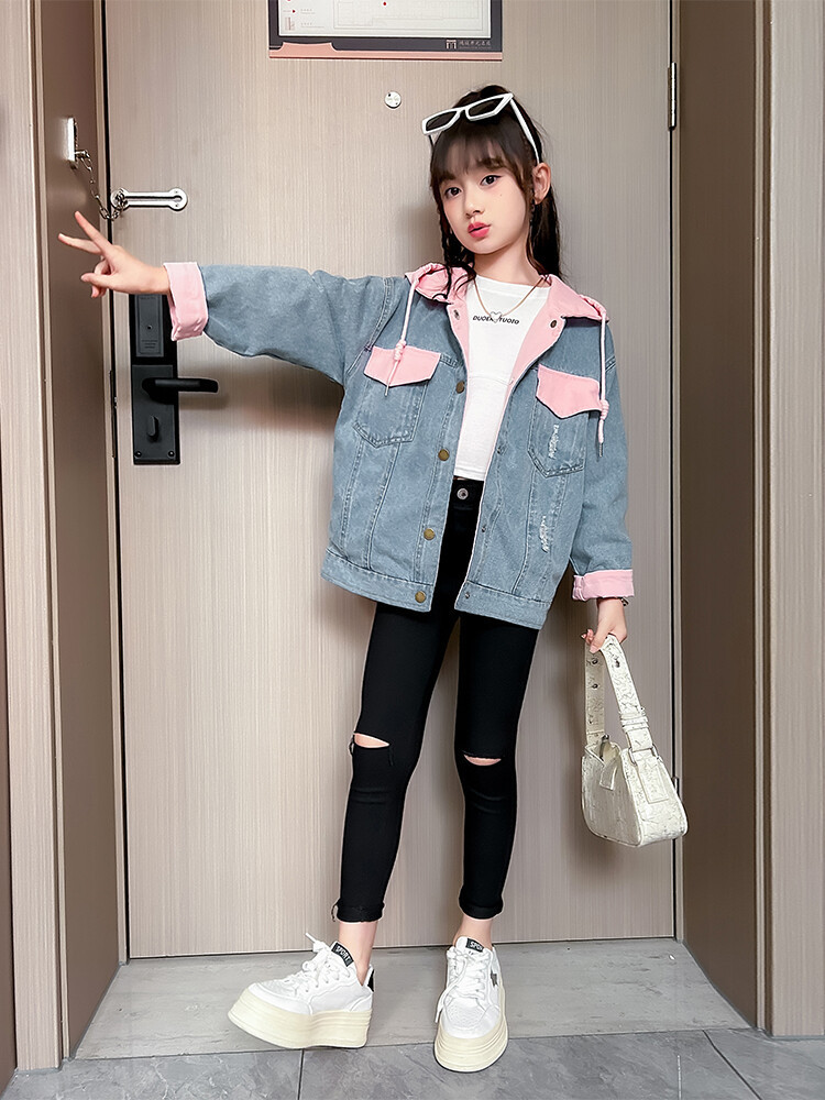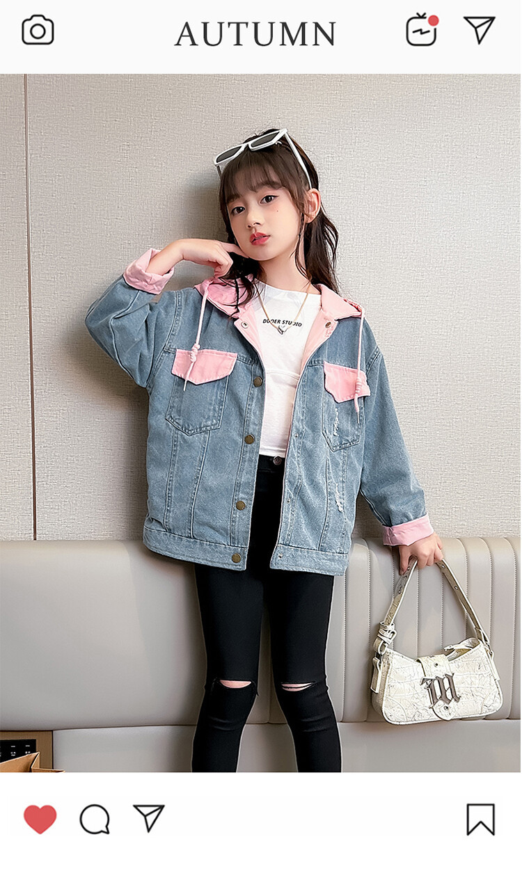 여자 봄과 가을 데님 코트 2023 새로운 어린이 서양 스타일 가을 옷 큰 어린이 소녀와 소녀 양면 착용 데님