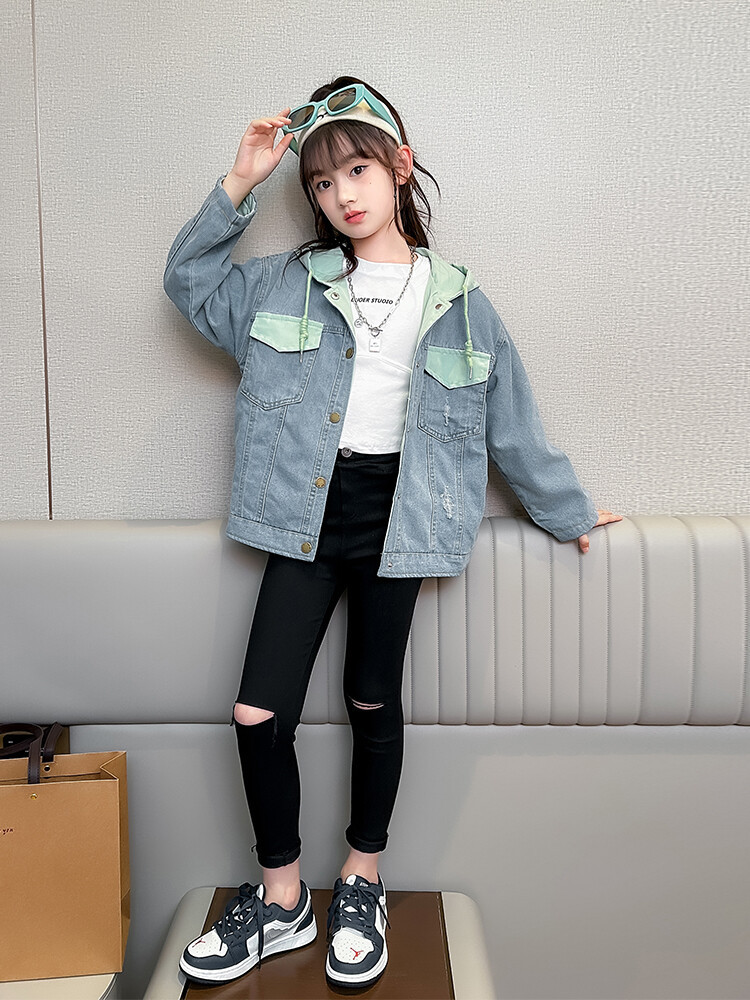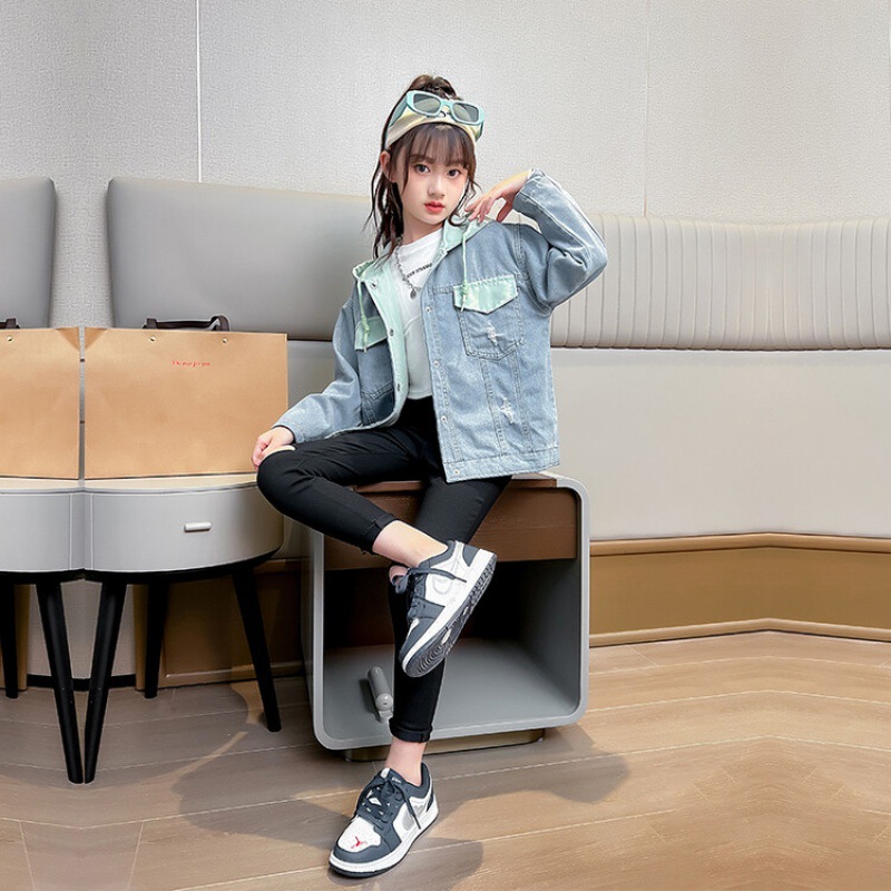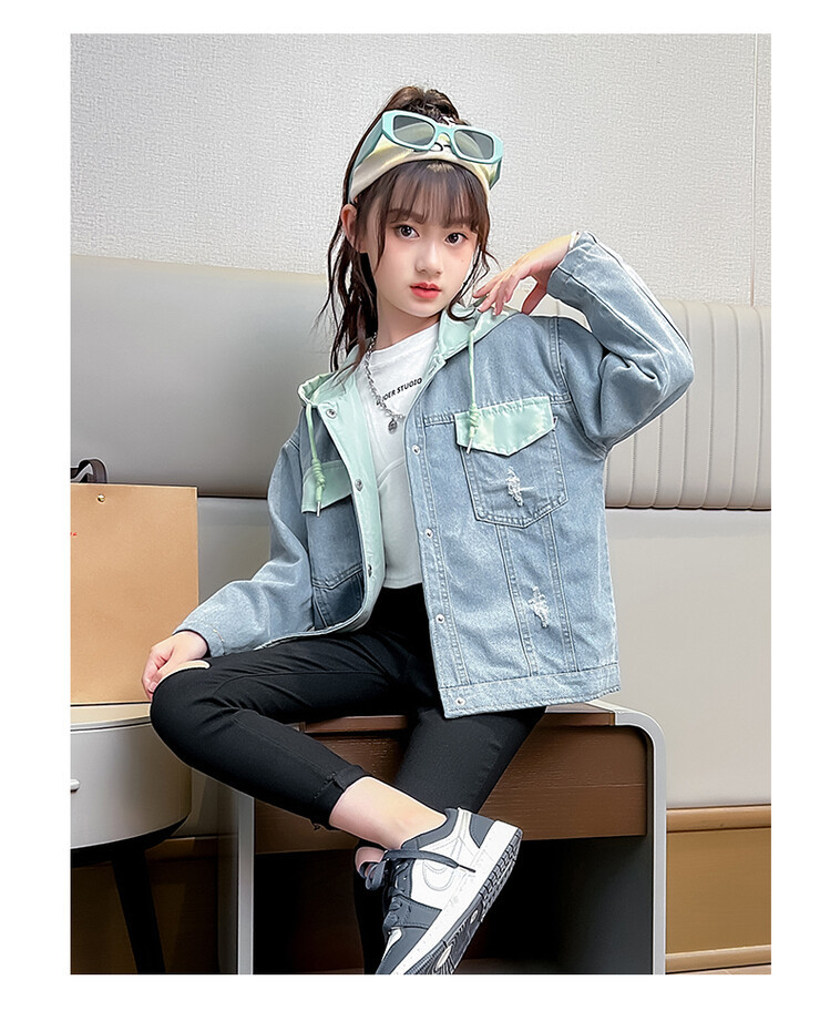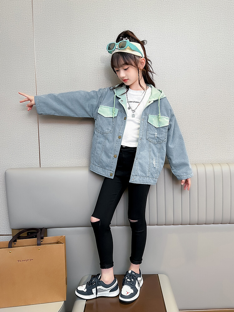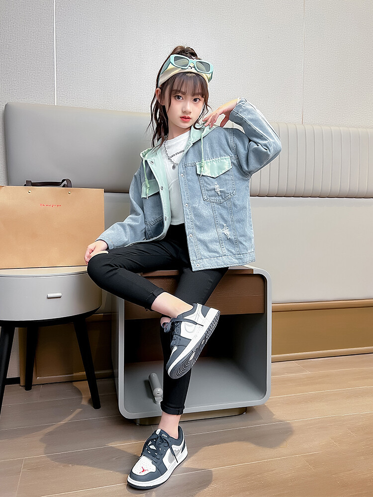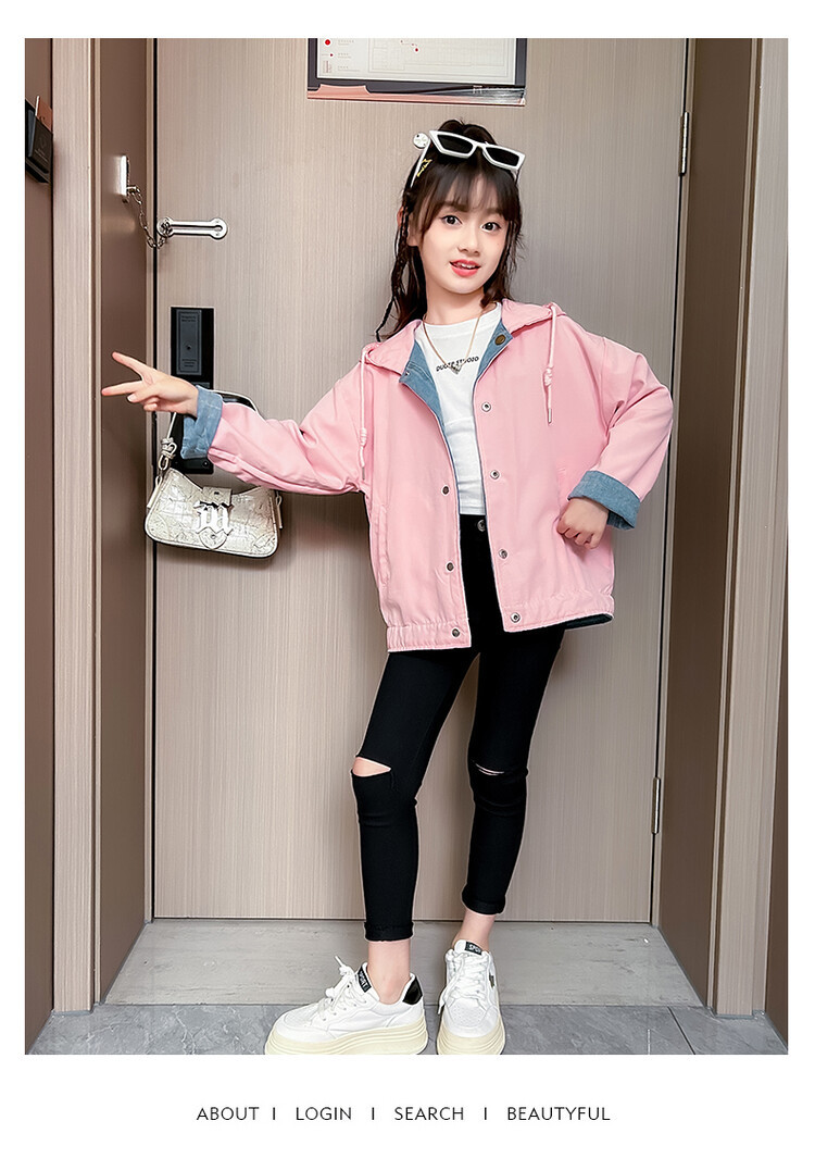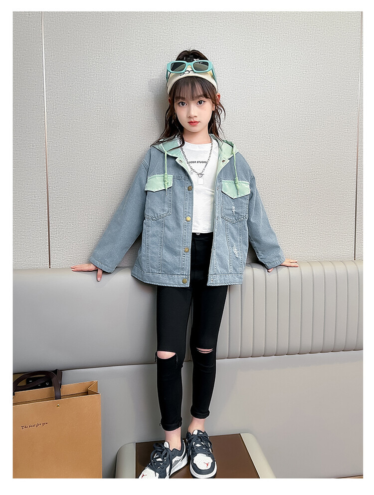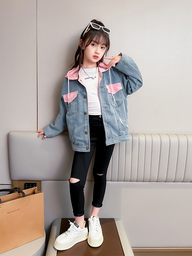 여자 봄과 가을 데님 코트 2023 새로운 어린이 서양 스타일 가을 옷 큰 어린이 소녀와 소녀 양면 착용 데님