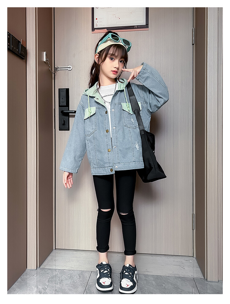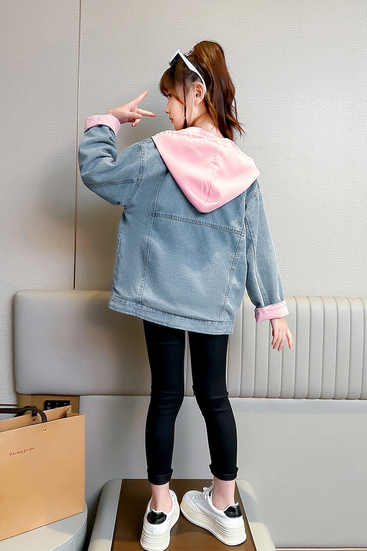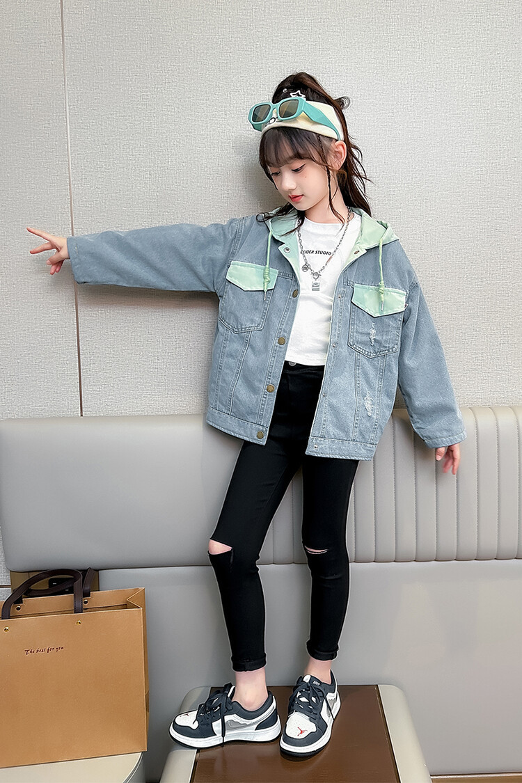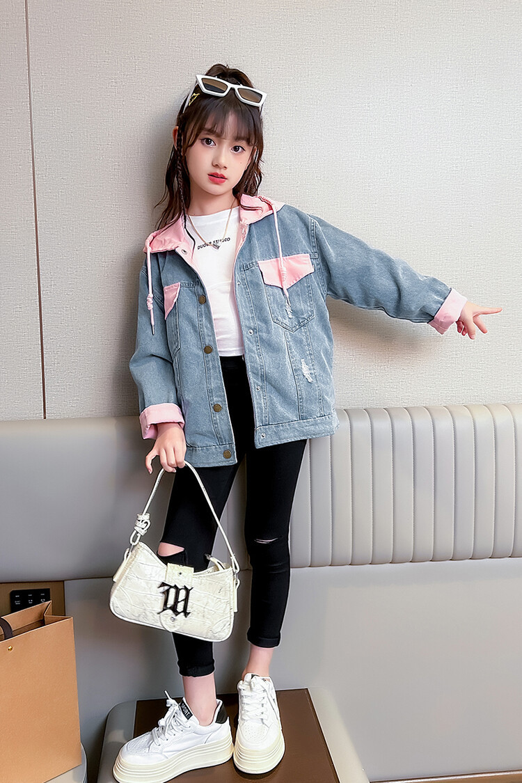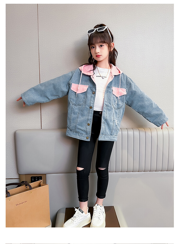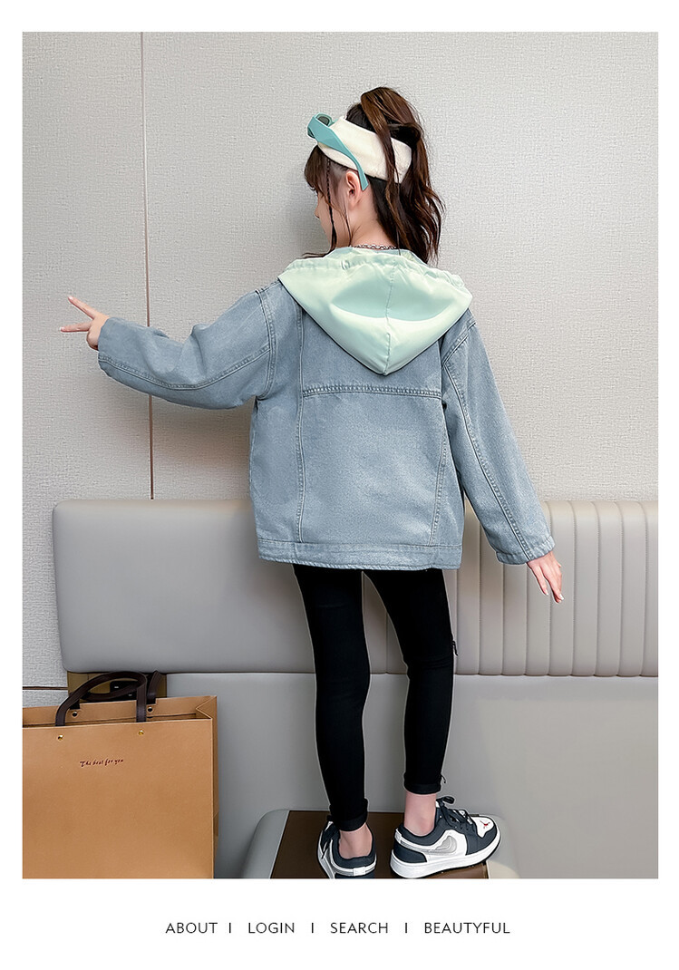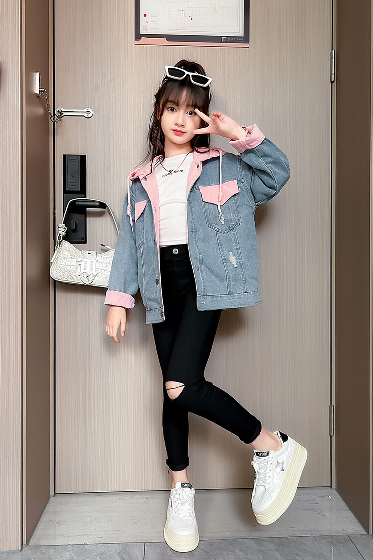 여자 봄과 가을 데님 코트 2023 새로운 어린이 서양 스타일 가을 옷 큰 어린이 소녀와 소녀 양면 착용 데님