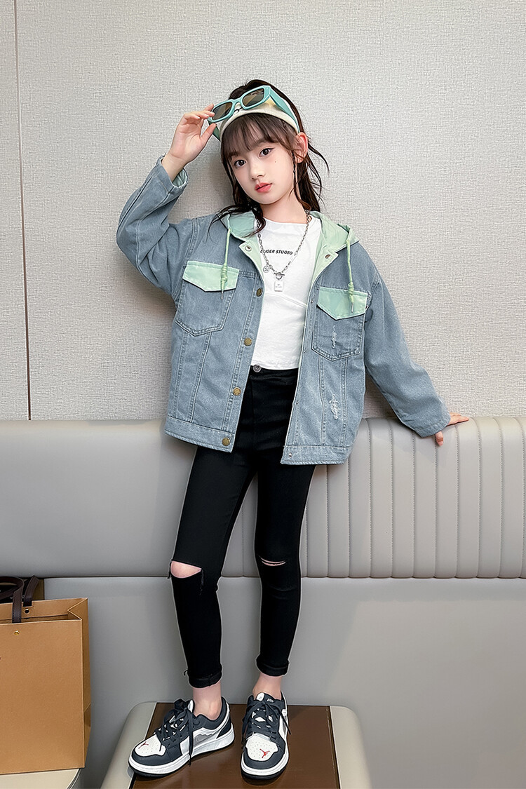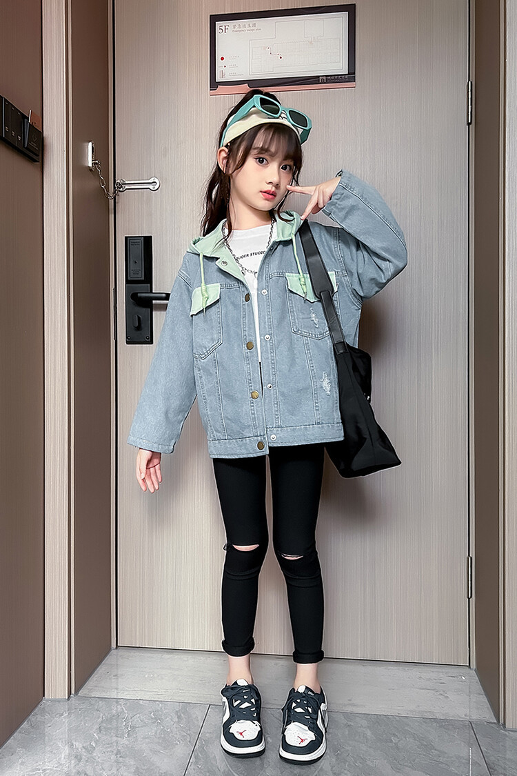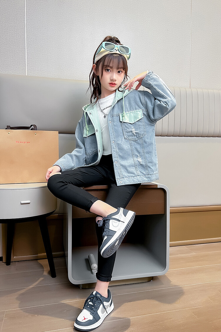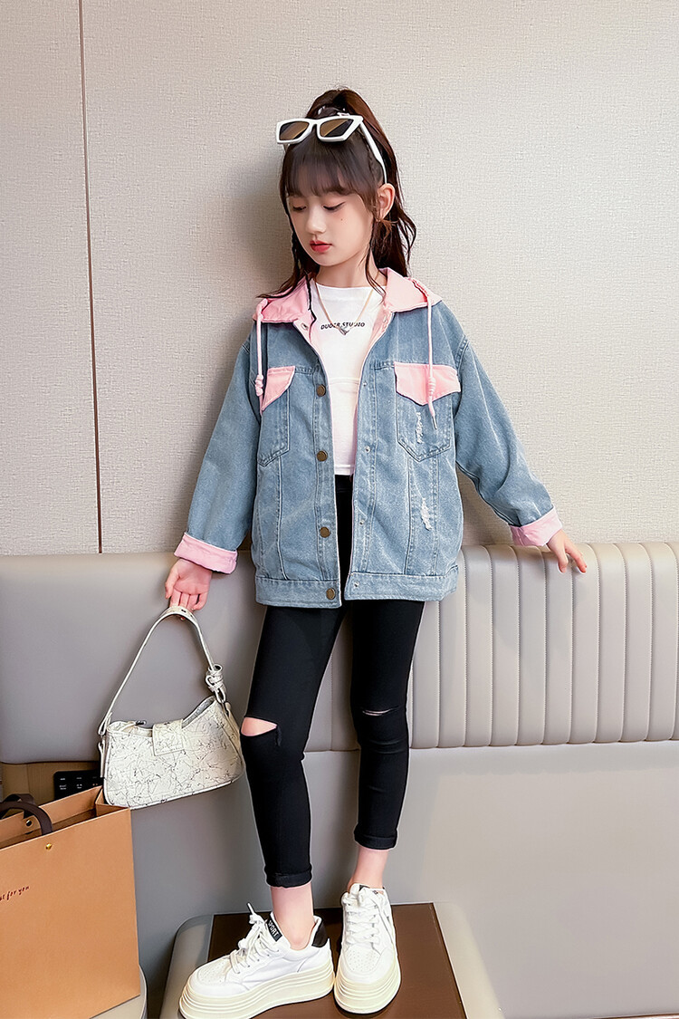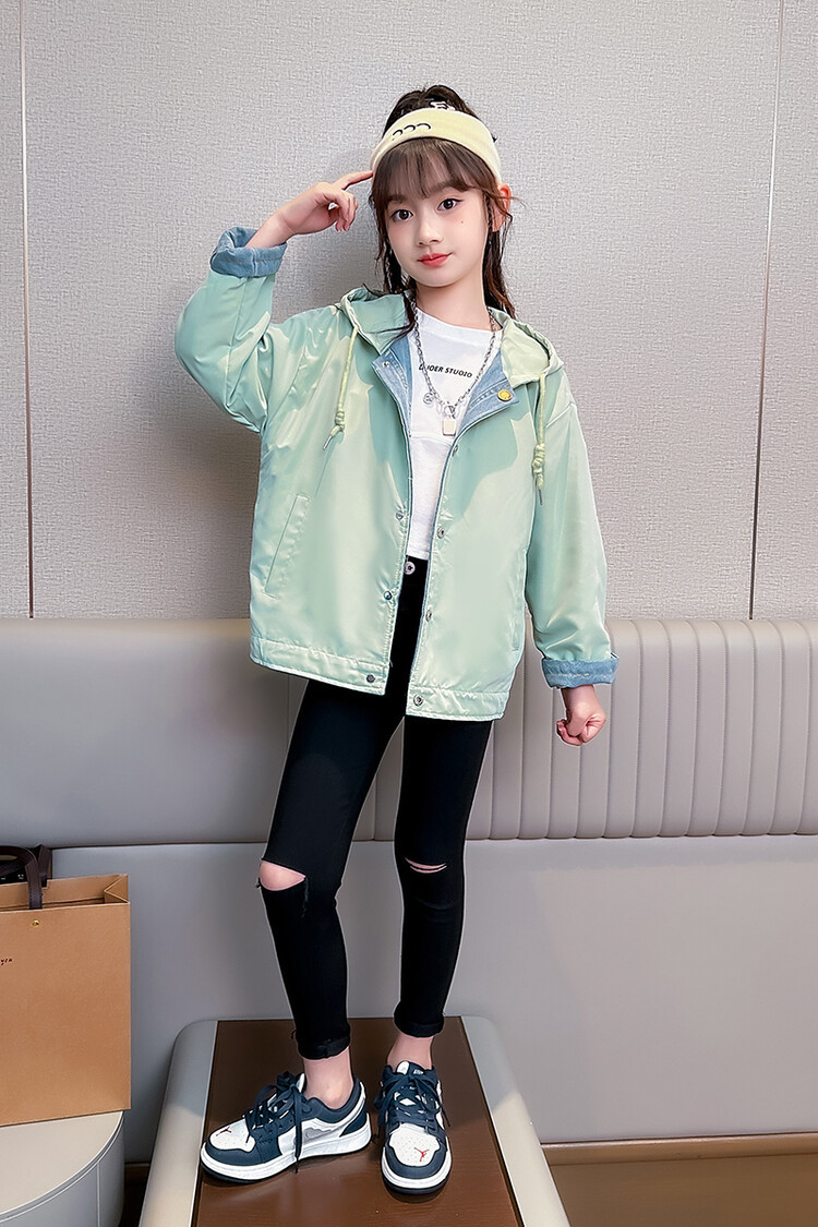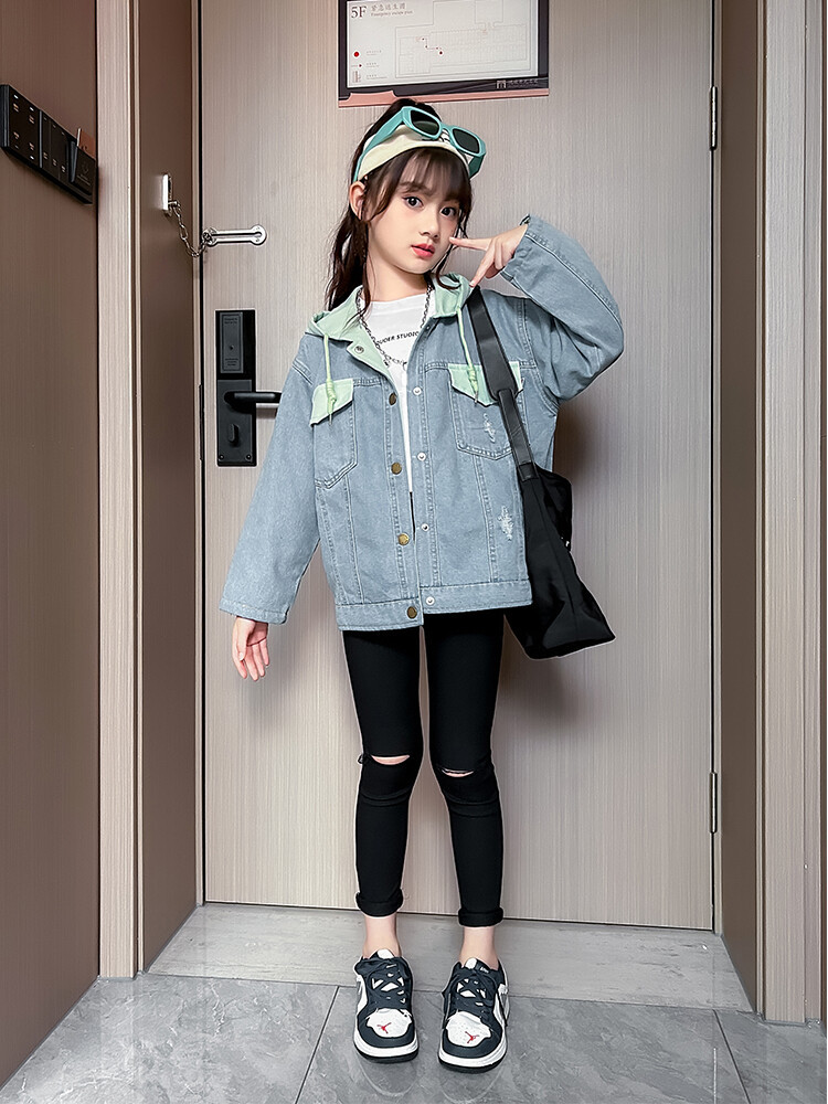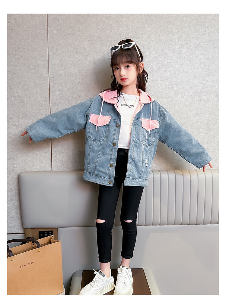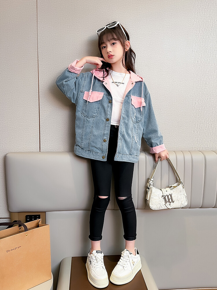 여자 봄과 가을 데님 코트 2023 새로운 어린이 서양 스타일 가을 옷 큰 어린이 소녀와 소녀 양면 착용 데님