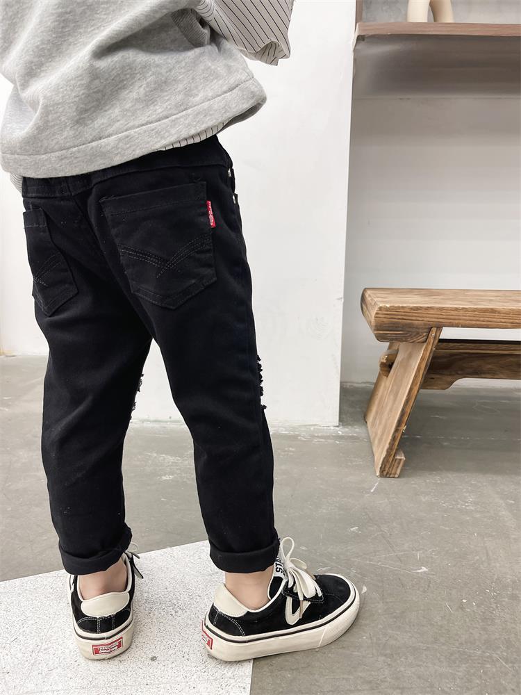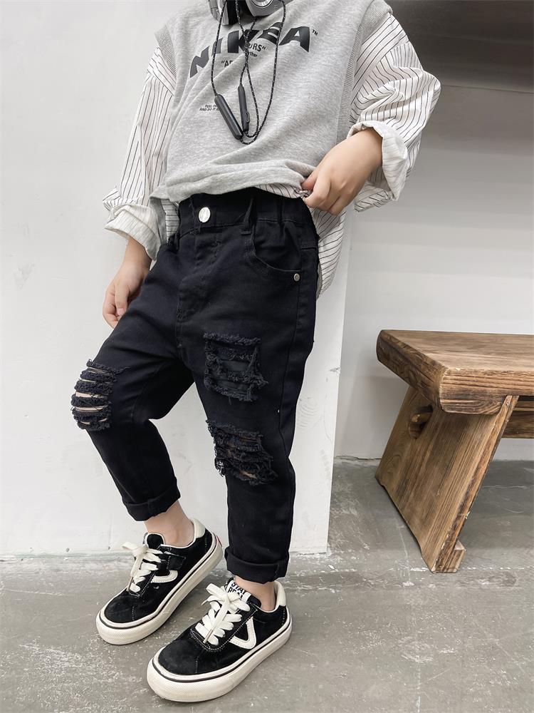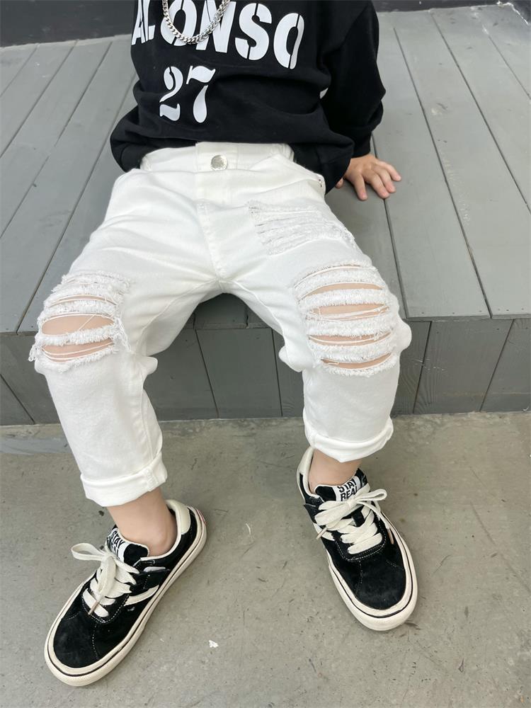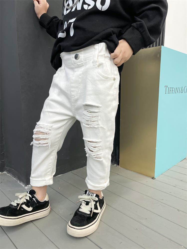 어린이 바지 새로운 흑백 바지 아기복 슬림핏 찢어진 트렌디 한 웨스턴 스타일 바지 스택 면 청바지 9515스토어 가기