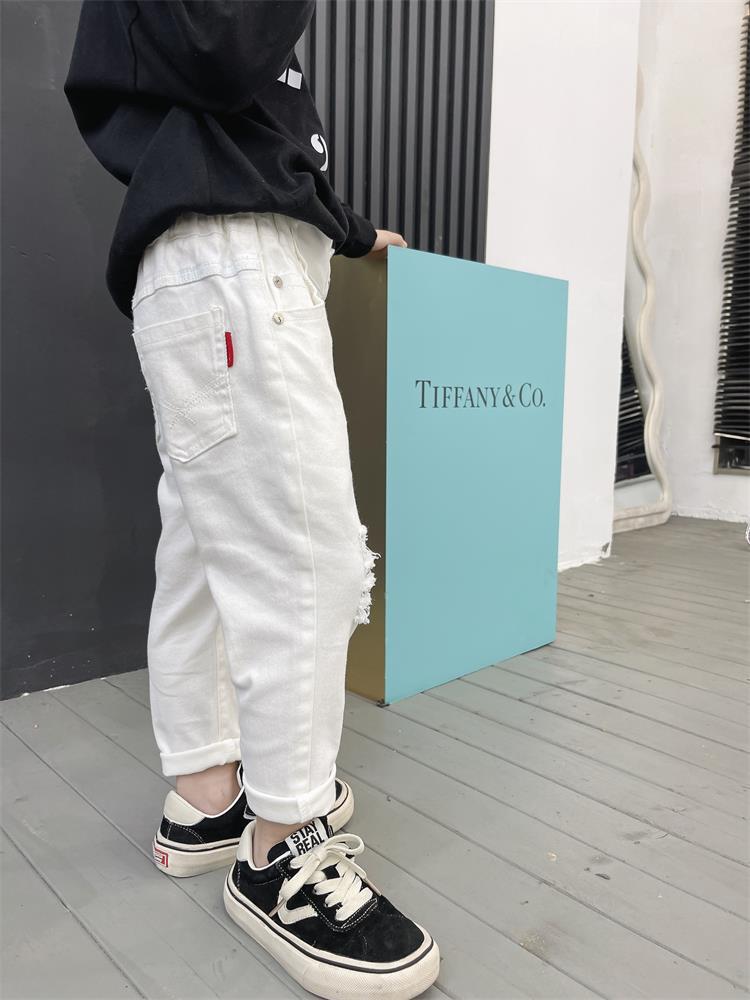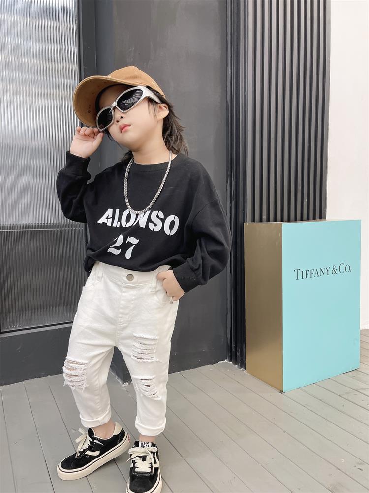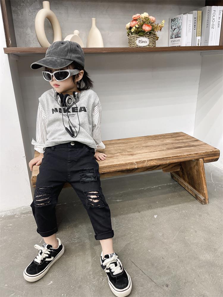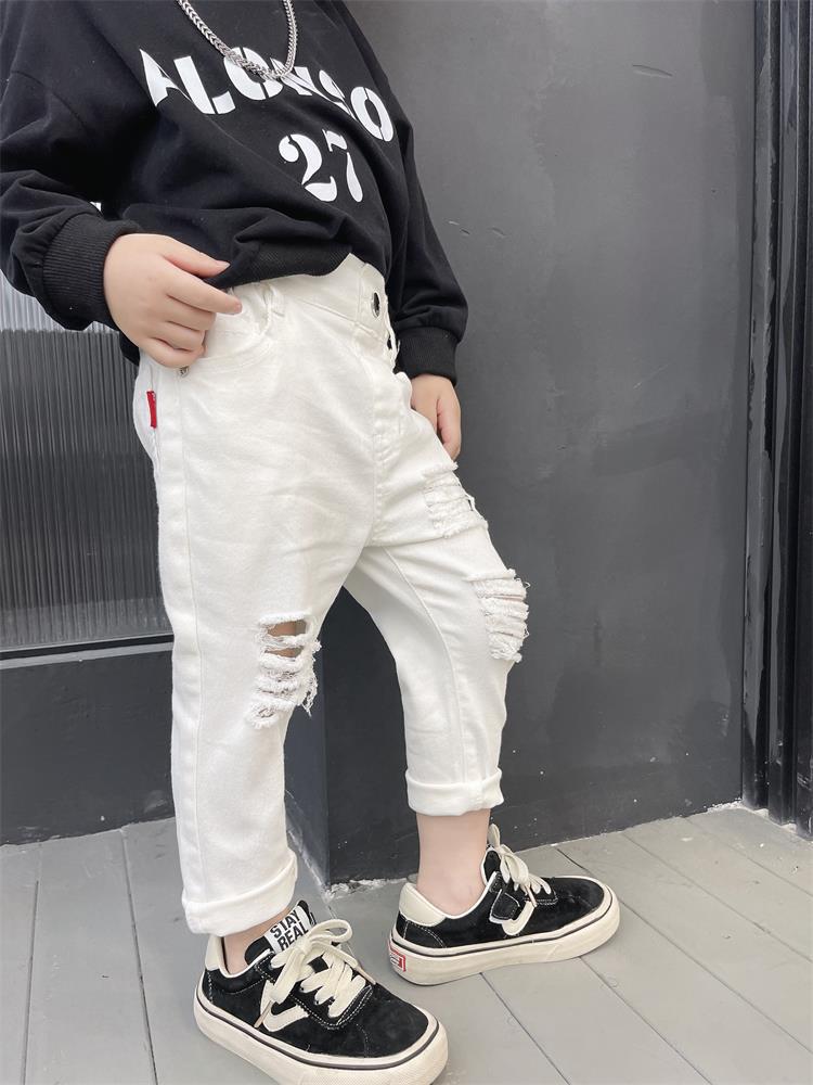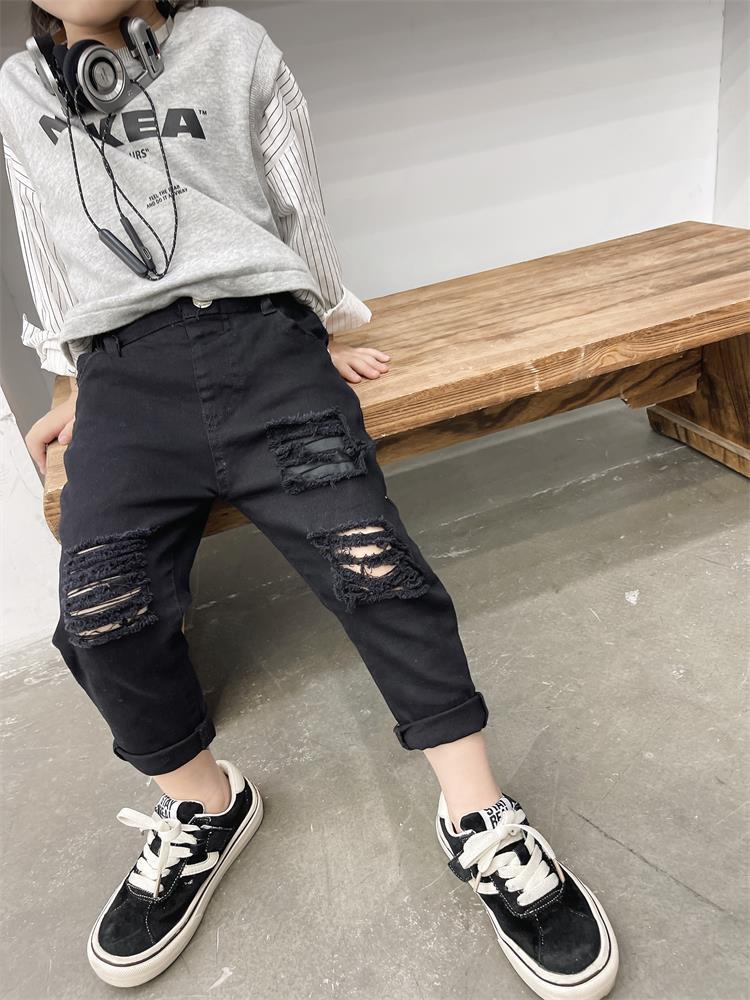 어린이 바지 새로운 흑백 바지 아기복 슬림핏 찢어진 트렌디 한 웨스턴 스타일 바지 스택 면 청바지 9515스토어 가기