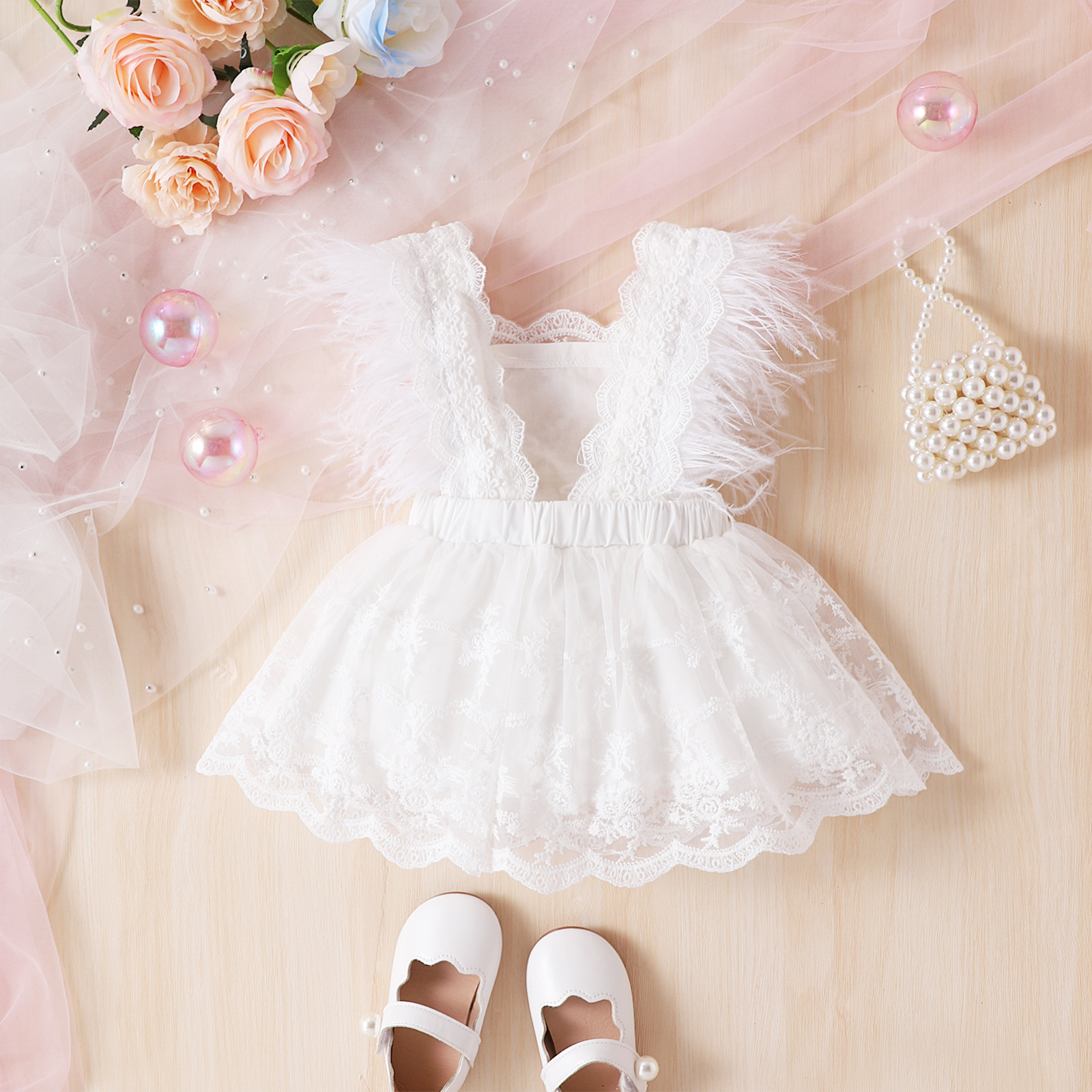 유럽과 미국의 국경 뜨거운 판매 소녀 2023 여름 슈퍼 요정 레이스 비행 소매 깃털 원피스 공주 원피스