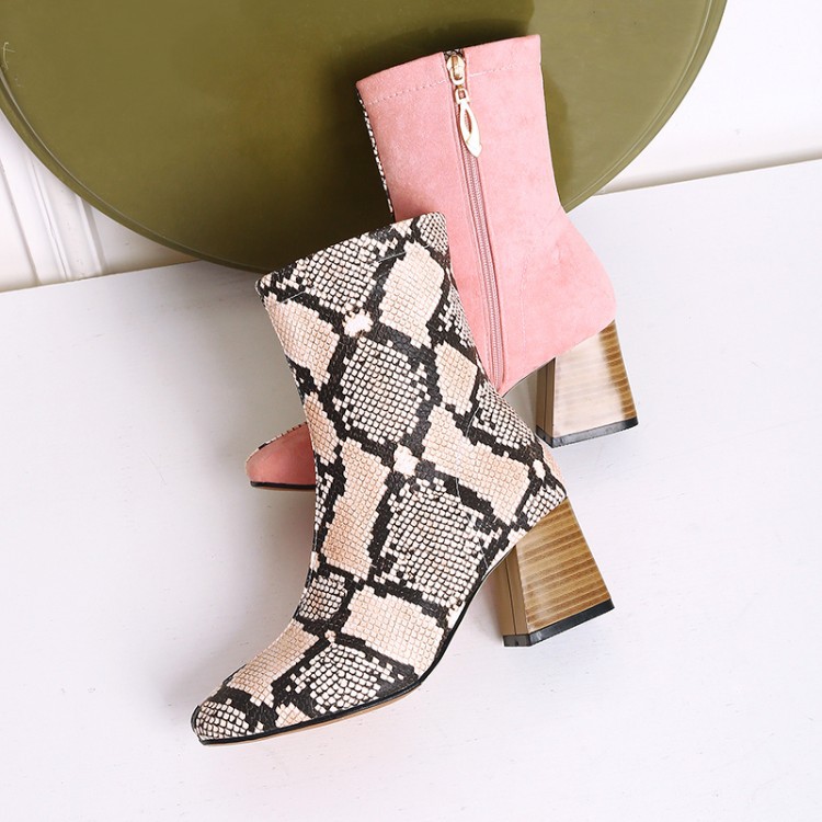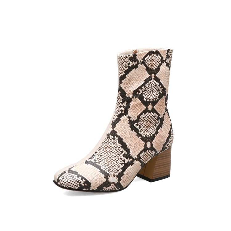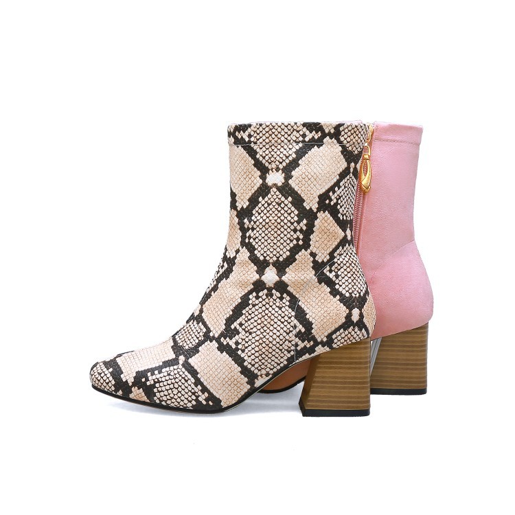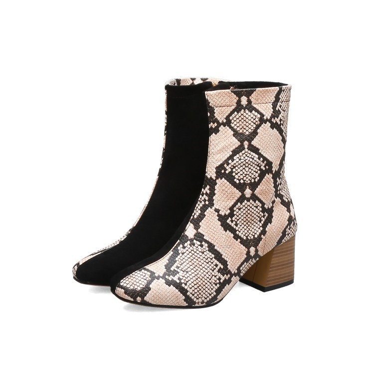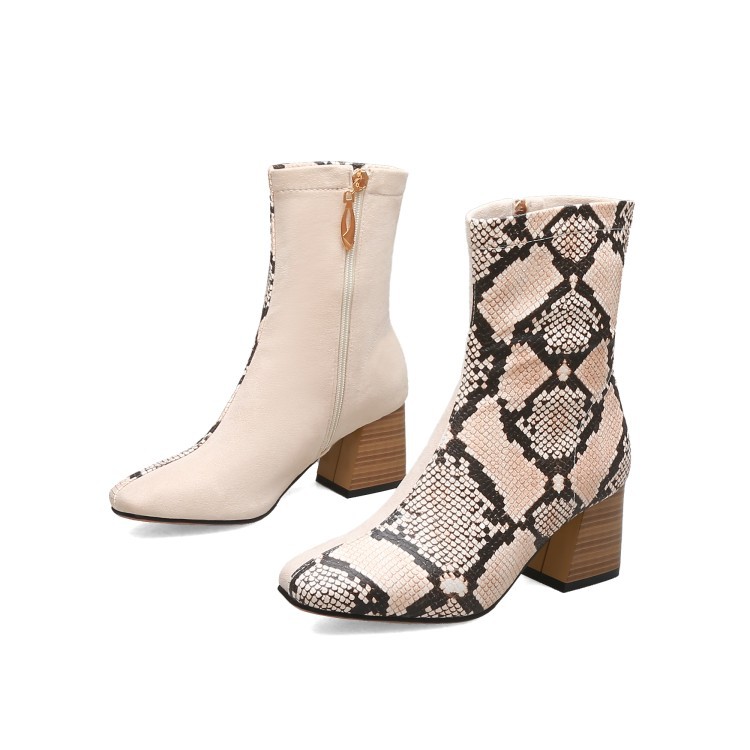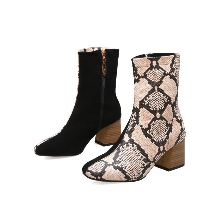 가을 두꺼운 뒤꿈치 미드 힐 부츠 여성 부츠 스퀘어 발가락 측면 지퍼 컬러 매칭 인쇄 가죽 신발 플러스 사이즈 40-48