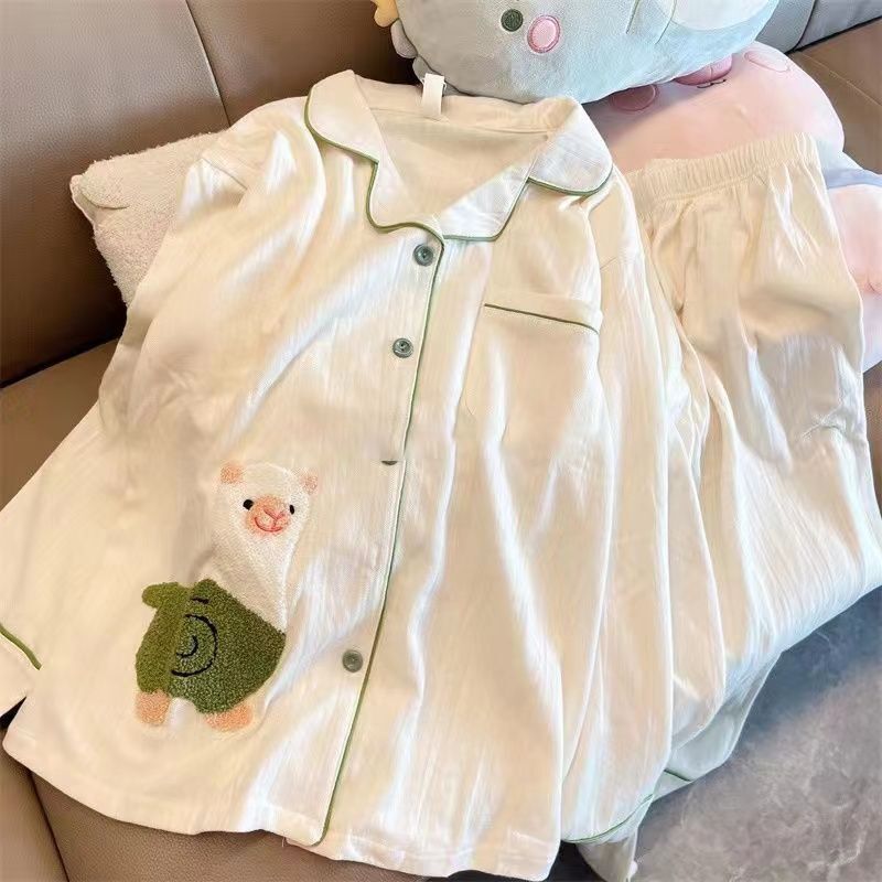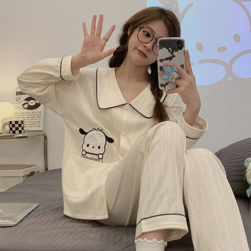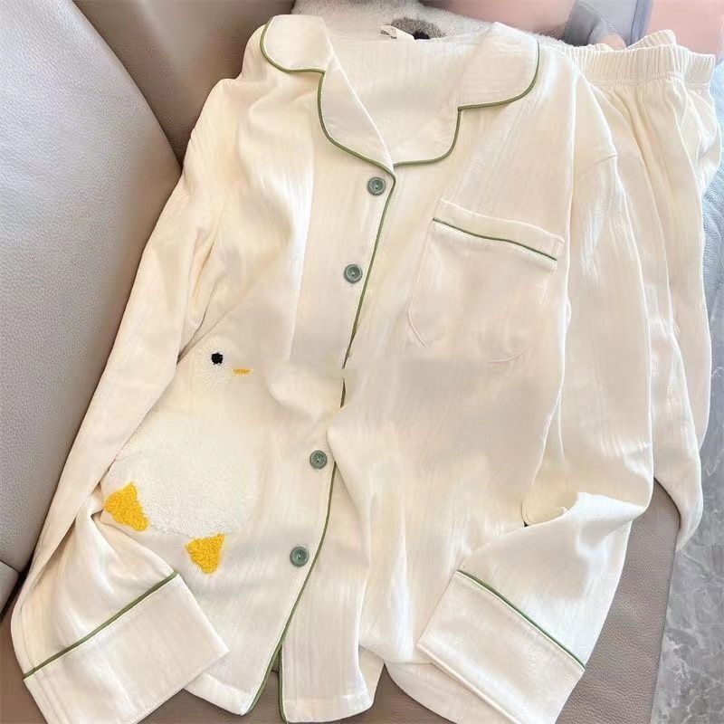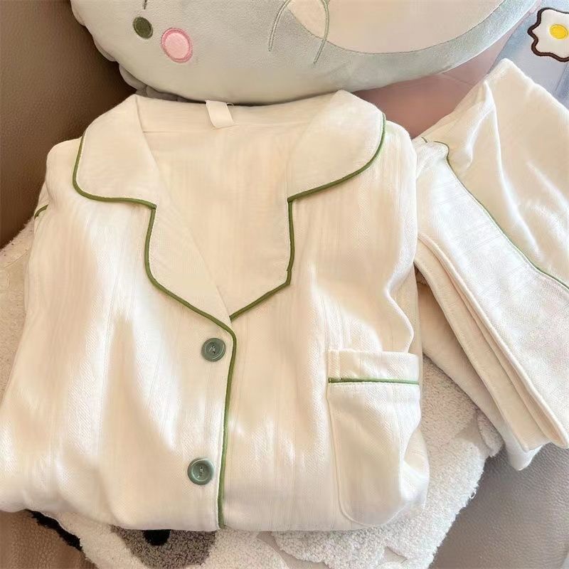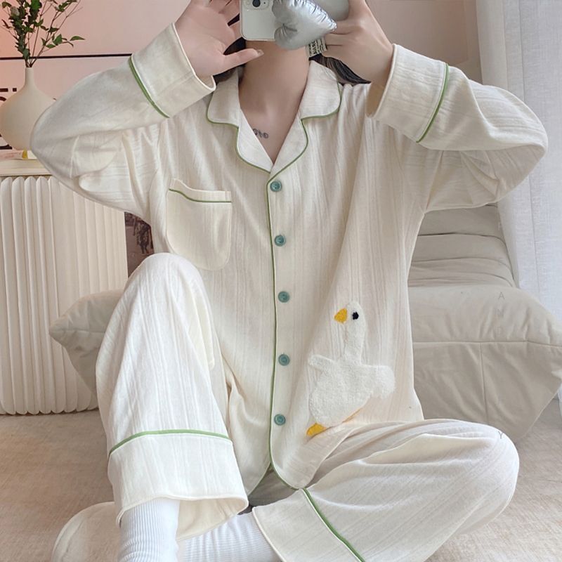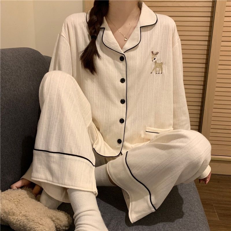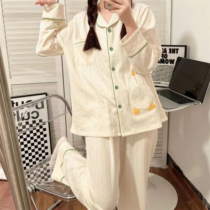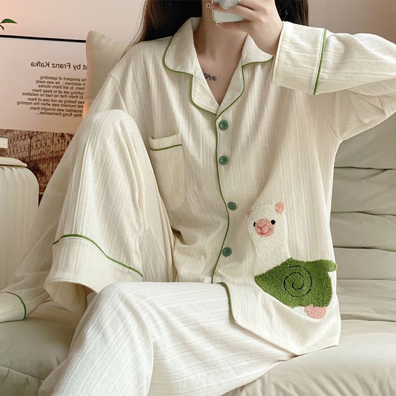 모조 면 잠옷 여자의 봄과 가을 새로운 긴팔 알파카 단색 겉옷을 입고 TikTok 라이브 폭발 가정 옷 세트스토어 가기