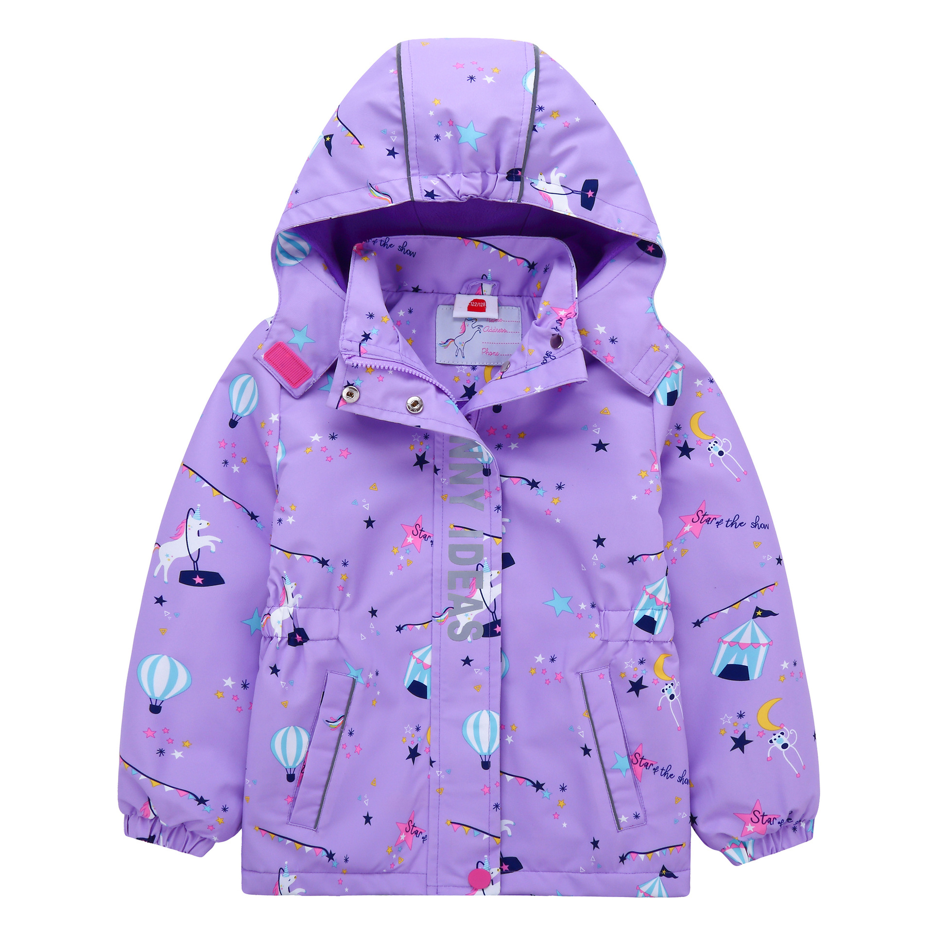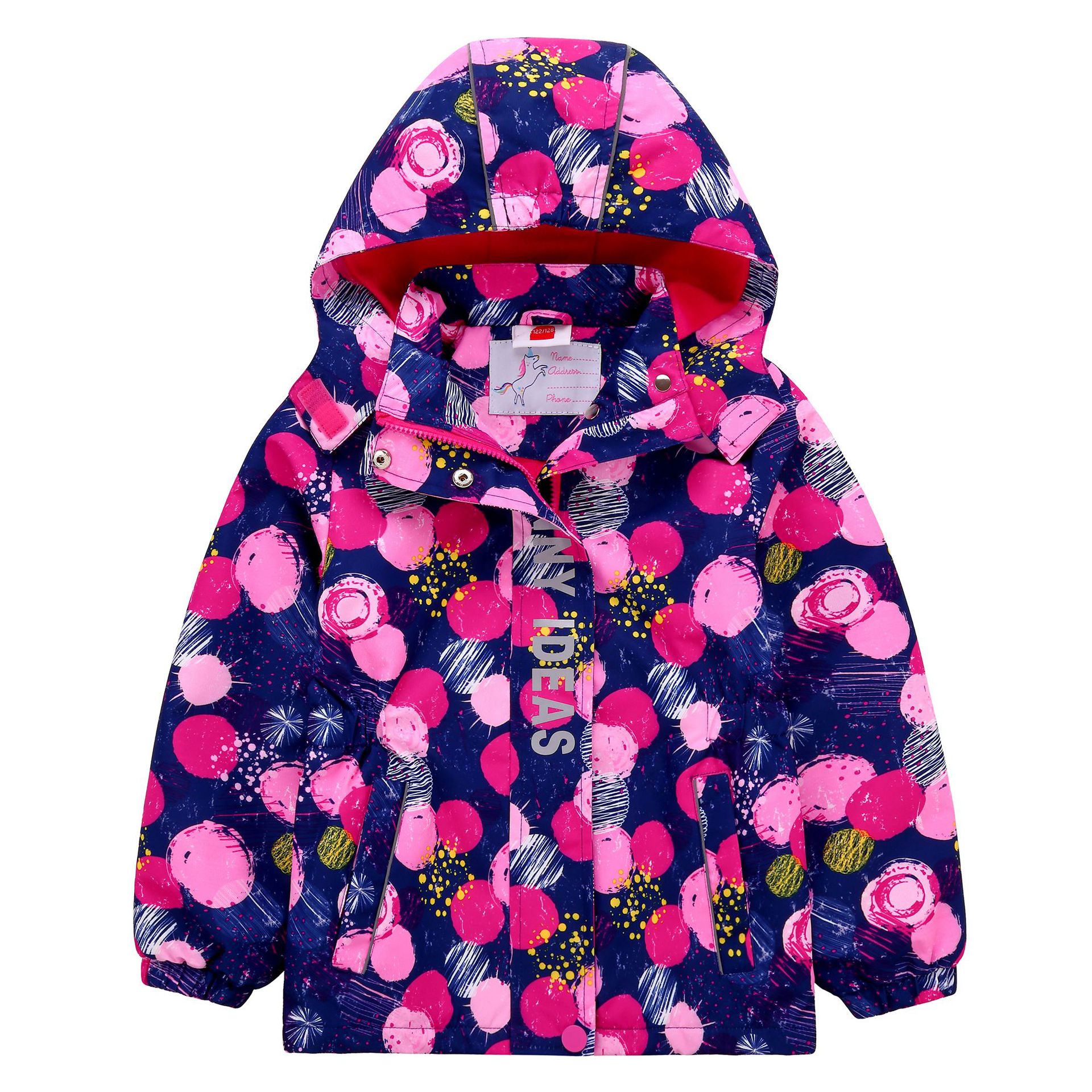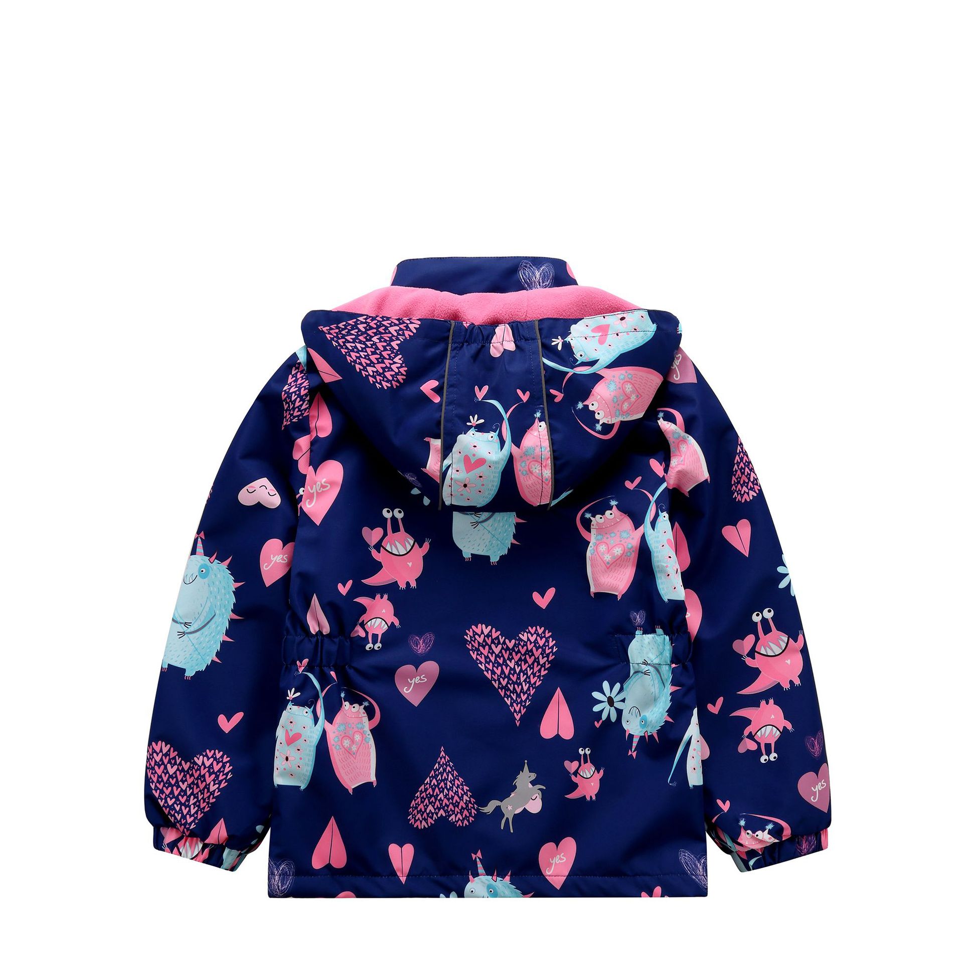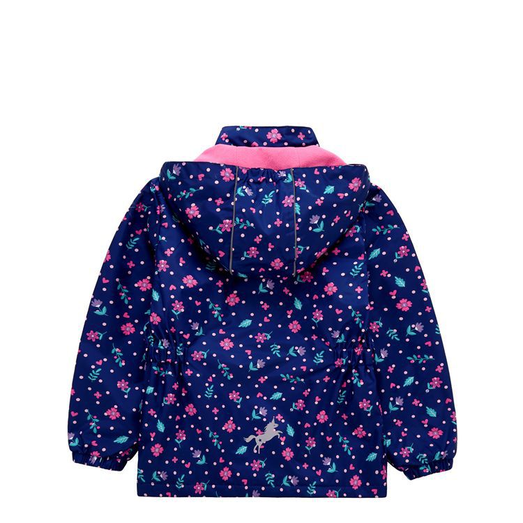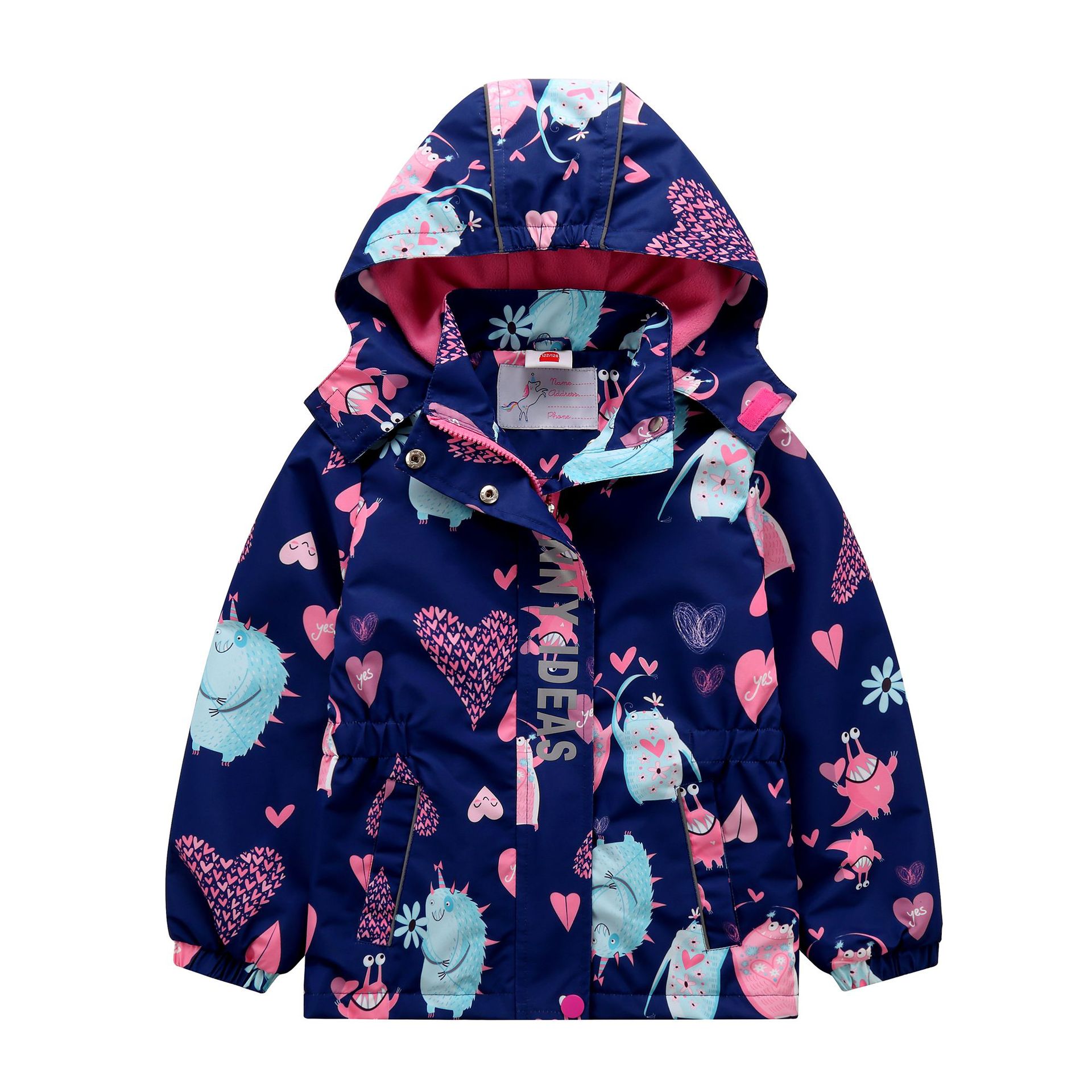 面料欧美外贸标准的防风防水厚实中带点柔软,不起球,易清洗。细节增加了很多亮点,后片是可以反光的可爱的小马,门襟是扣子和魔术贴相结合,美观又实用。门襟的英文字母也是可以反光的,衣身亮银色反光条。这些都能给宝宝在夜晚增加安全系数。女童稍微收腰。本厂都是做外贸出口订单的老工人,有着十几年的制衣经验,所以质量请放心。关键是价格是实惠,建议零售价169以上。尺寸是国内标准的,模特1.25米,穿的是122-128码。