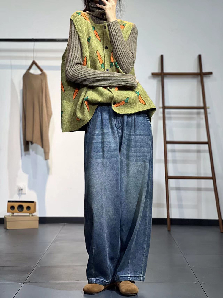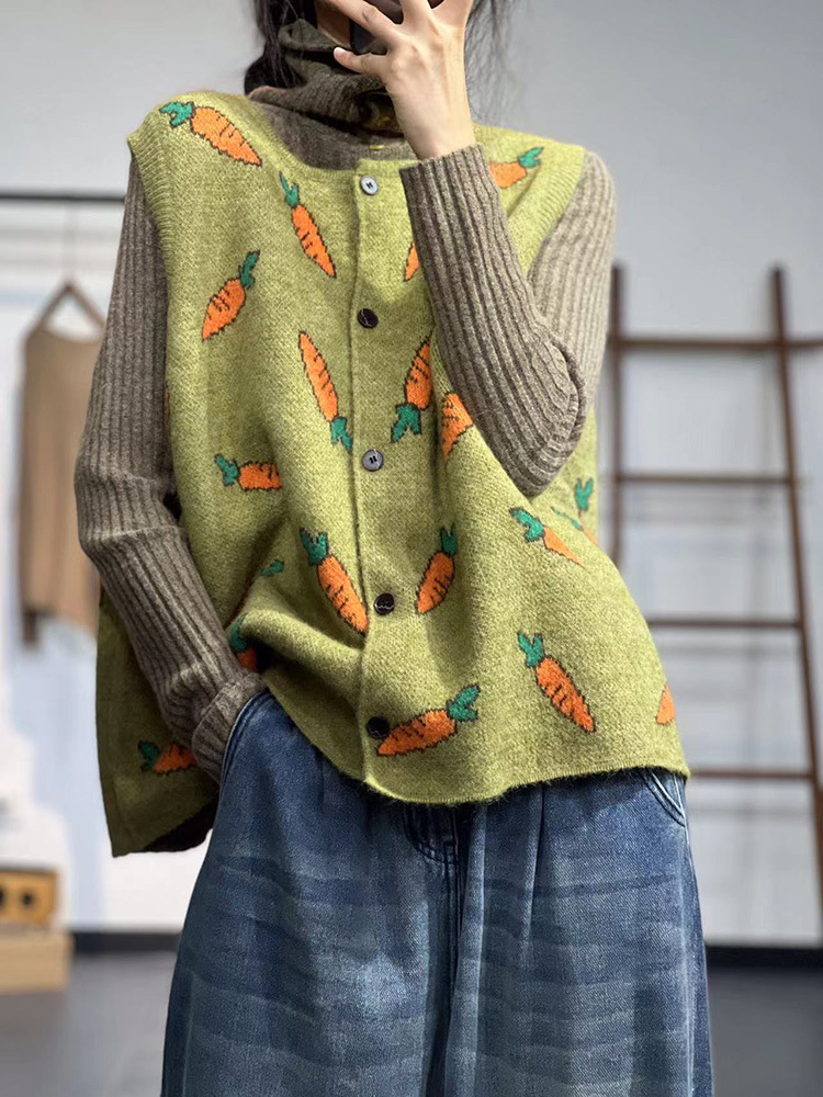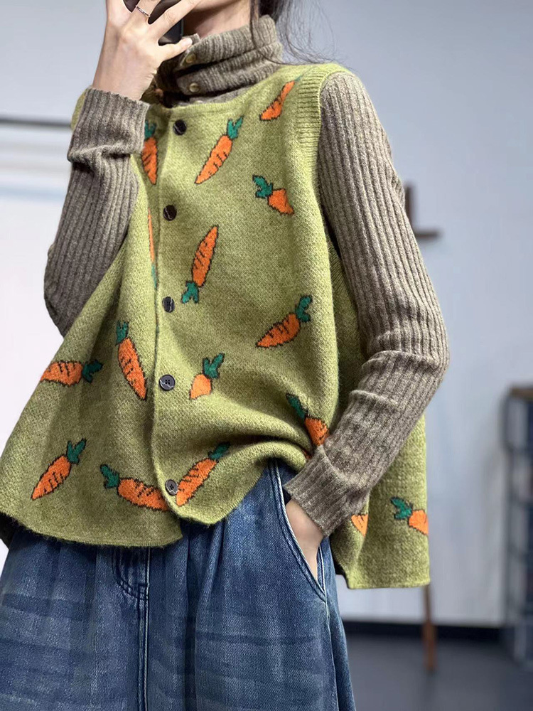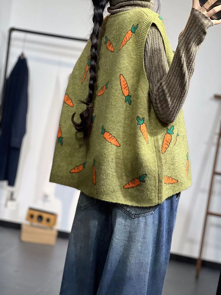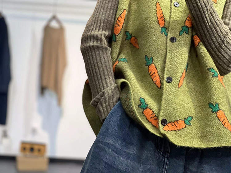 한국 스타일 싱글 브레스트 당근 자수 니트 조끼 여성용 2023 이른 봄 새로운 느슨한 모든 매치 민소매 스웨터 조끼