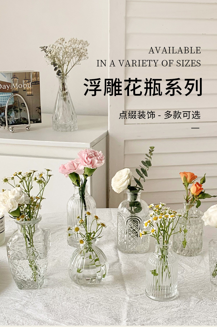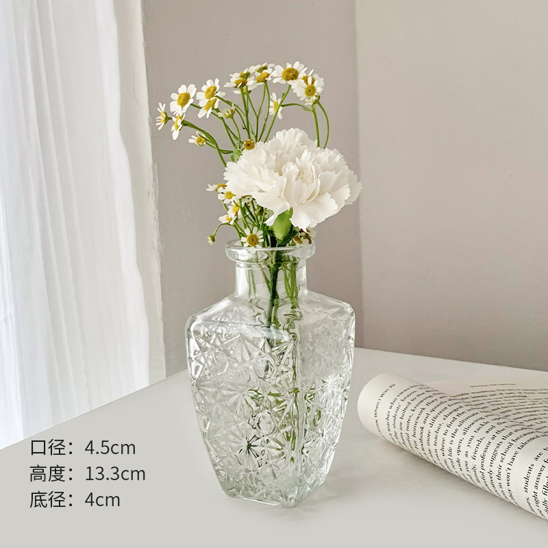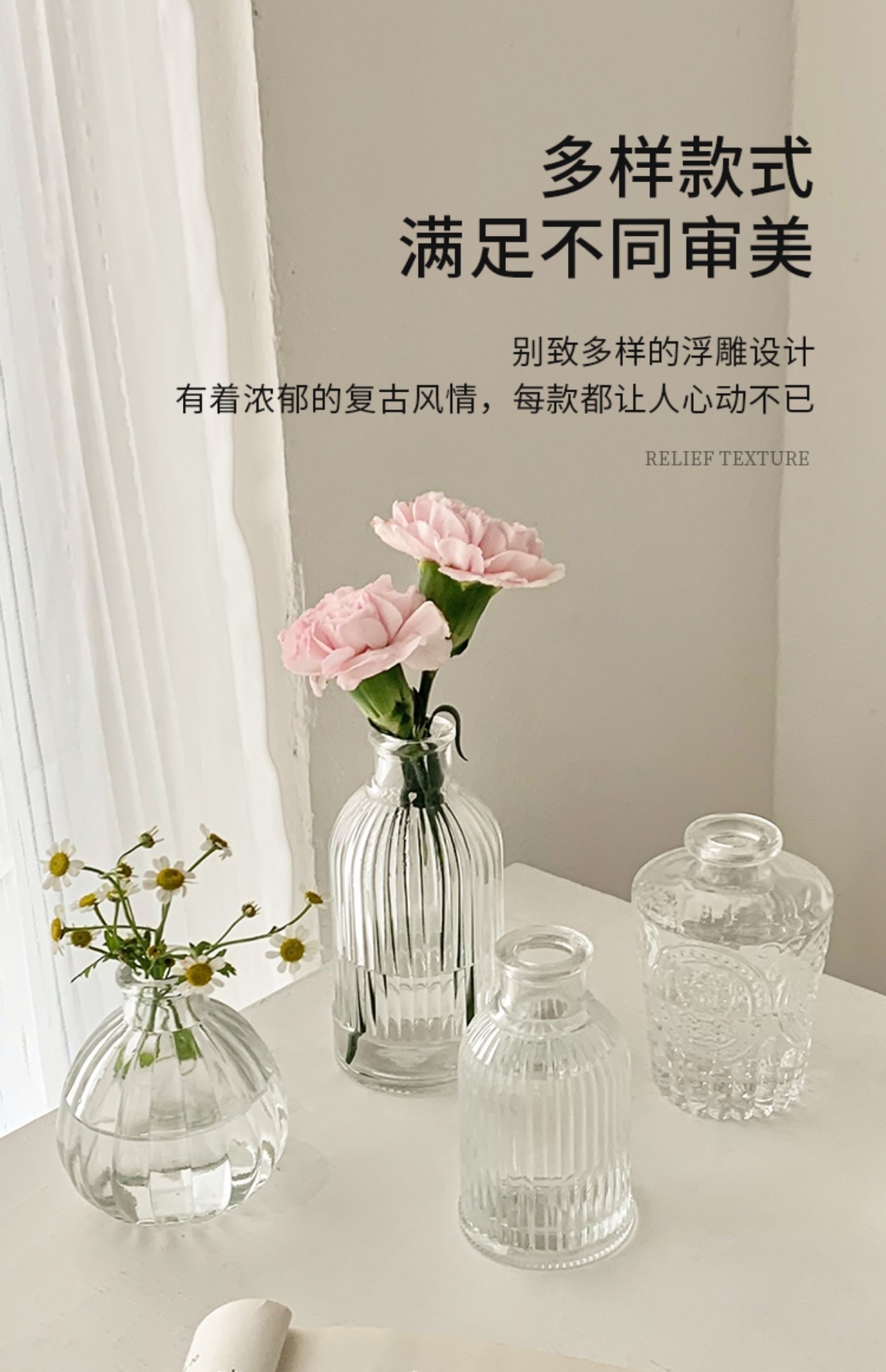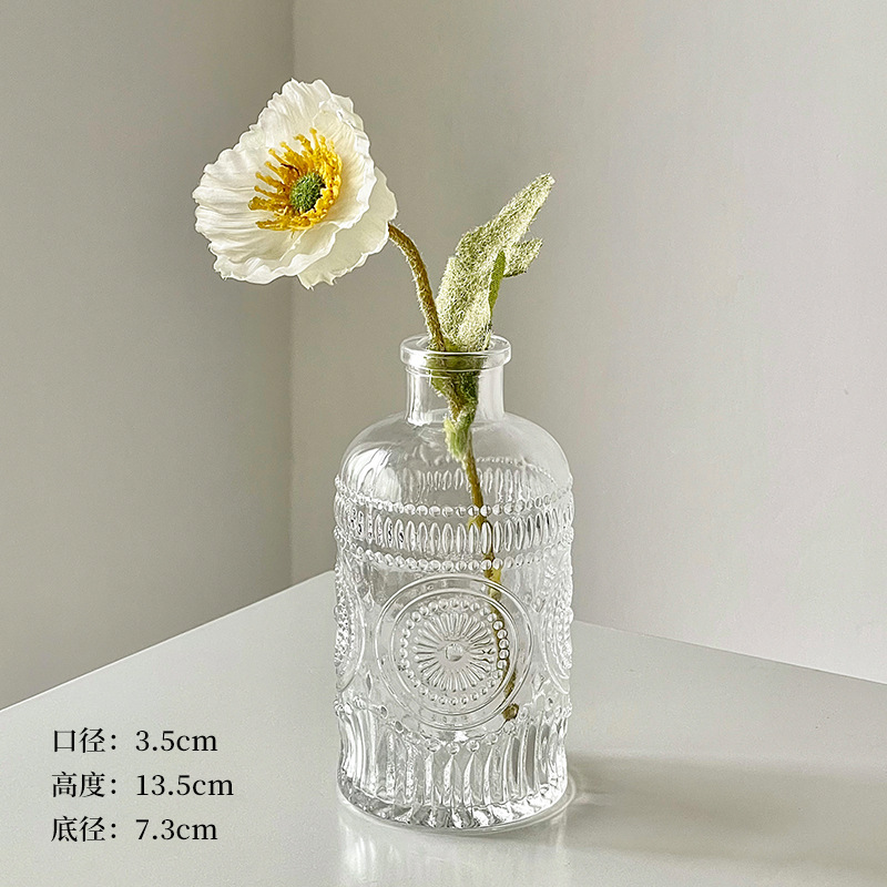 프렌치 스타일의 레트로 양각 유리 꽃병, 수경 꽃꽂이, 투명한 꽃, 탁상 장식, 심플하고 신선한 디자인