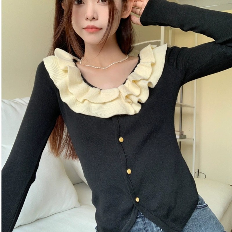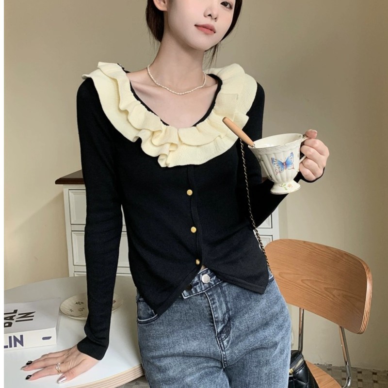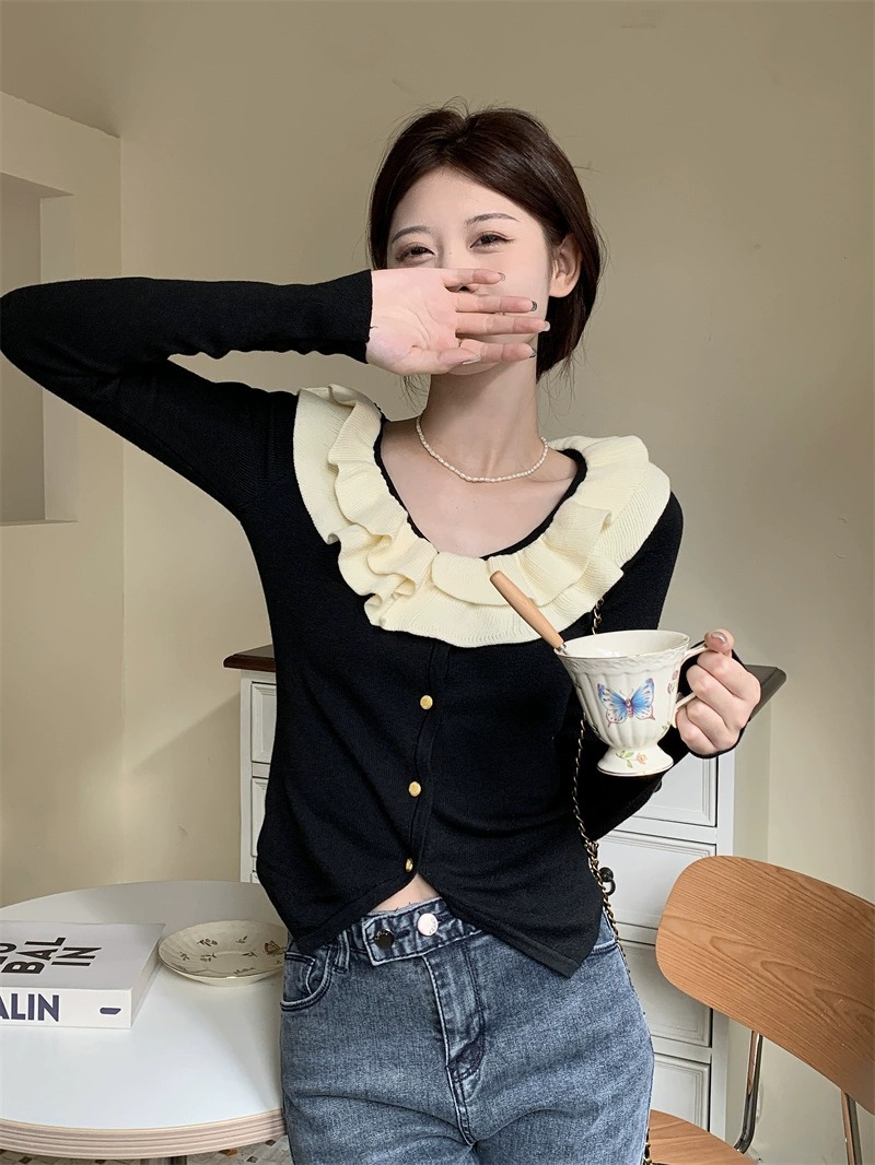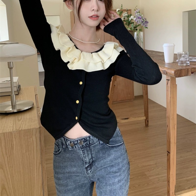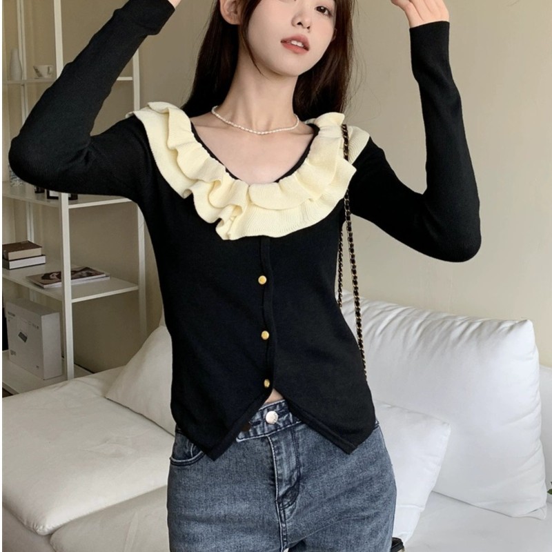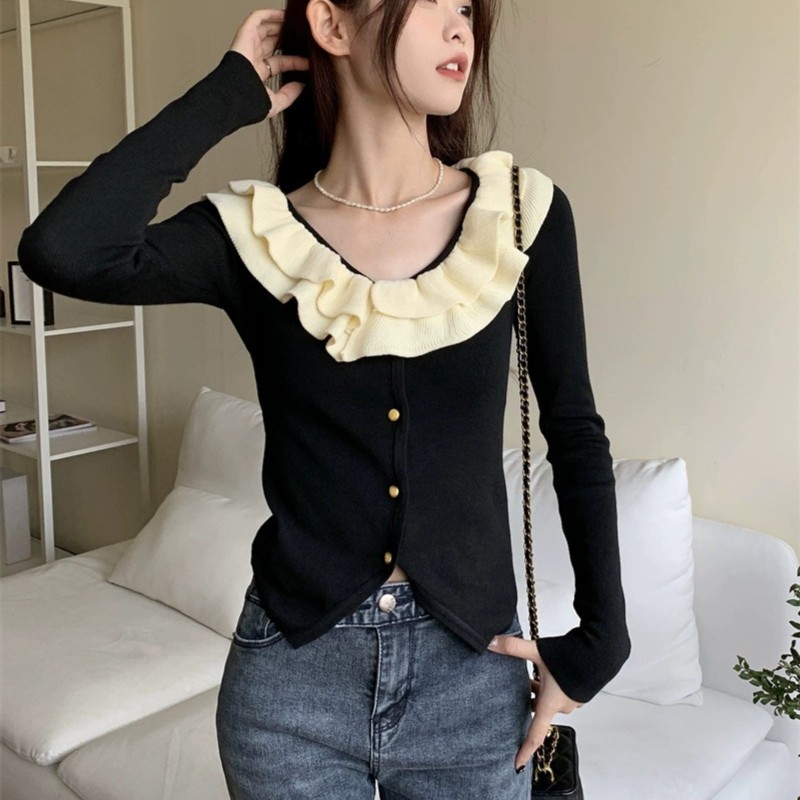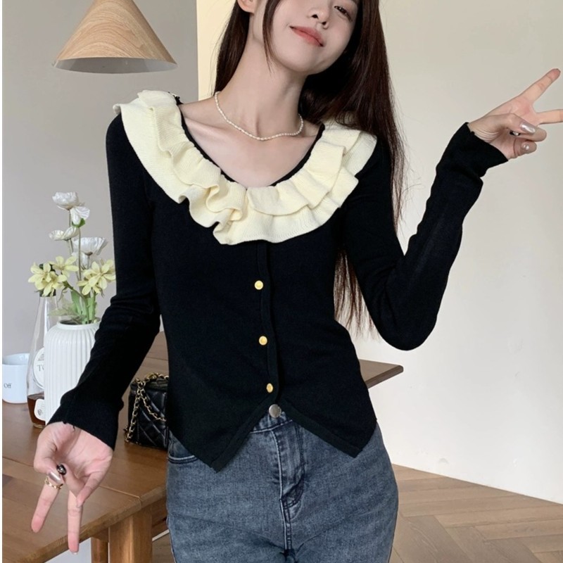 로터스 칼라 컬러 블록 긴팔 니트웨어 여성용 여름 2023 새로운 슬림 핏 슬리밍 프랑스 니치 긴팔 카디건스토어 가기