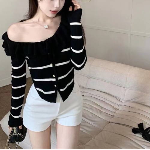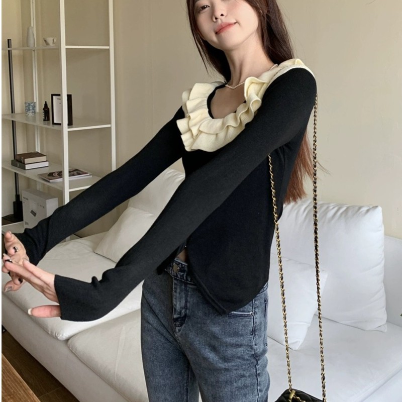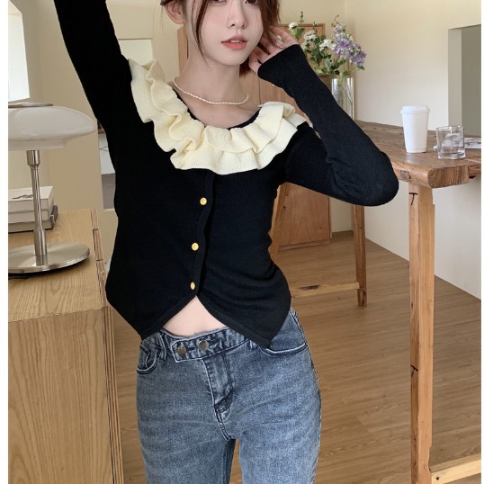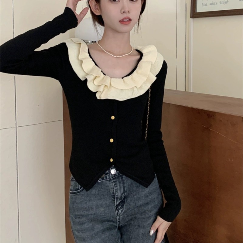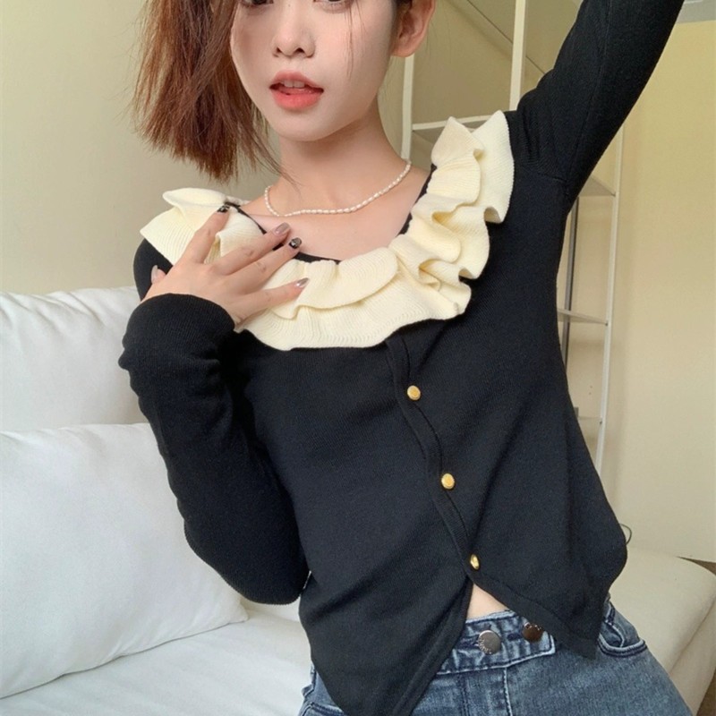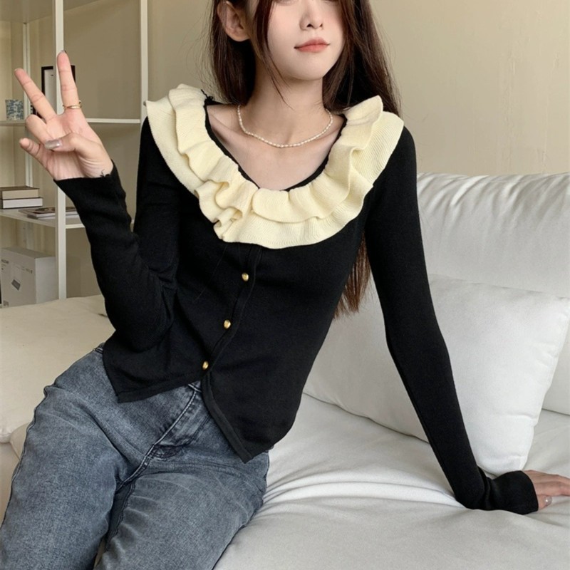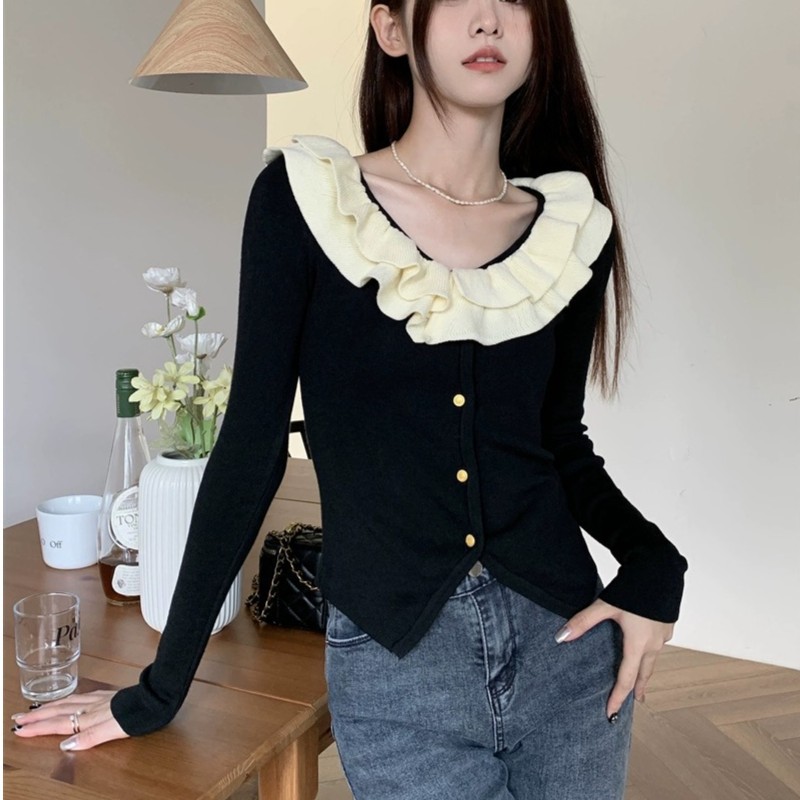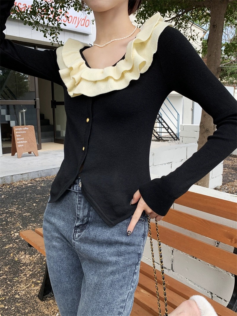 로터스 칼라 컬러 블록 긴팔 니트웨어 여성용 여름 2023 새로운 슬림 핏 슬리밍 프랑스 니치 긴팔 카디건스토어 가기