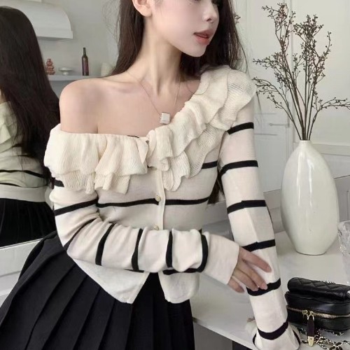로터스 칼라 컬러 블록 긴팔 니트웨어 여성용 여름 2023 새로운 슬림 핏 슬리밍 프랑스 니치 긴팔 카디건