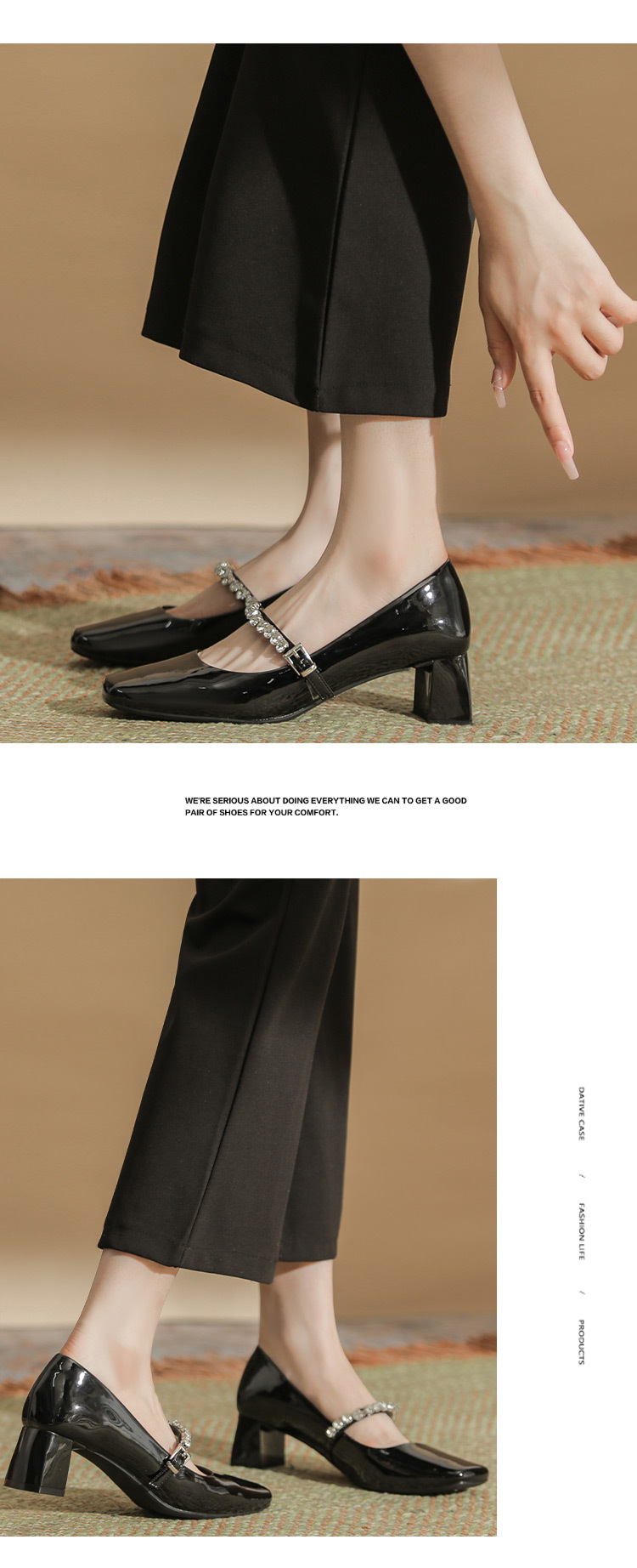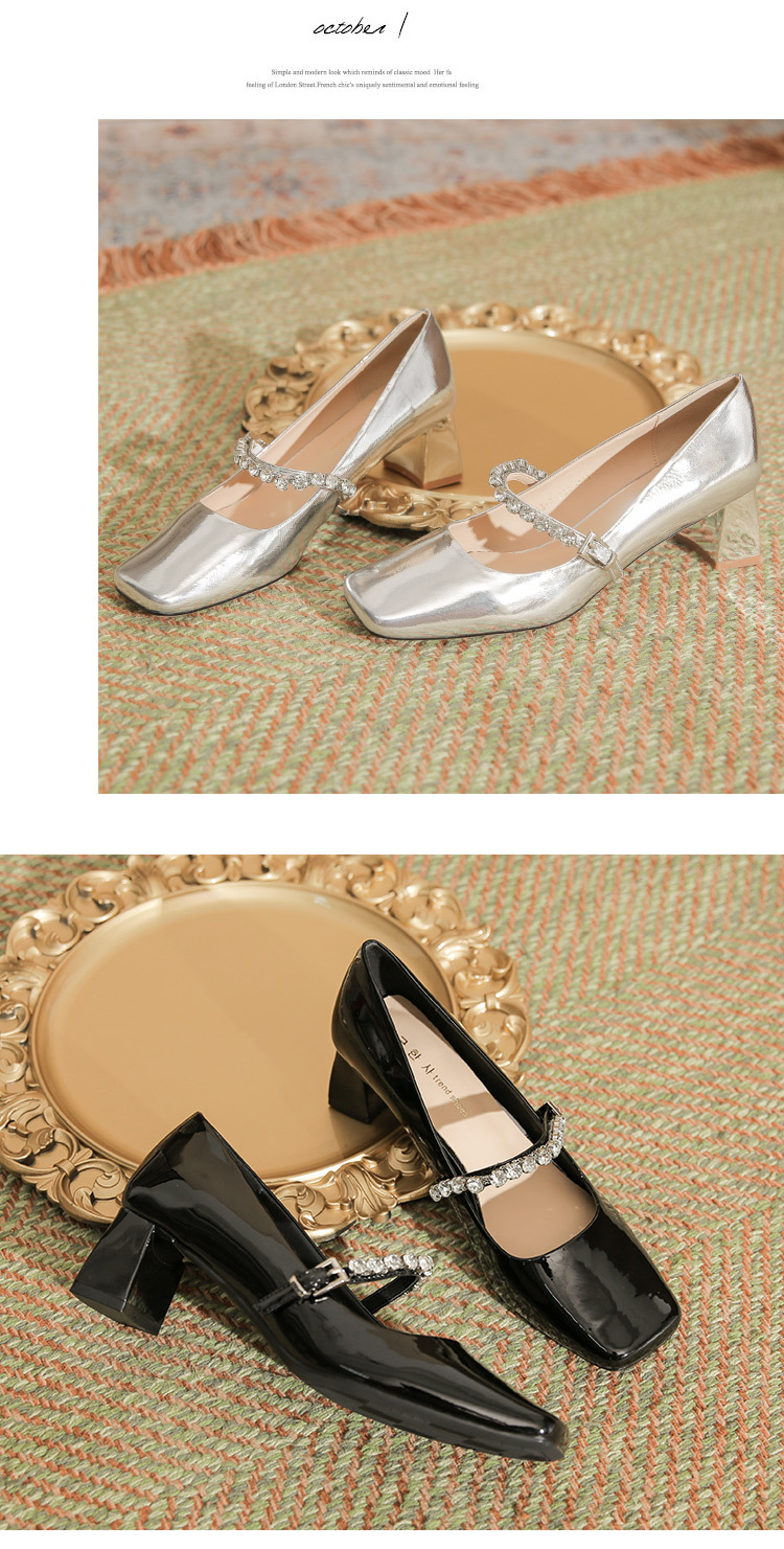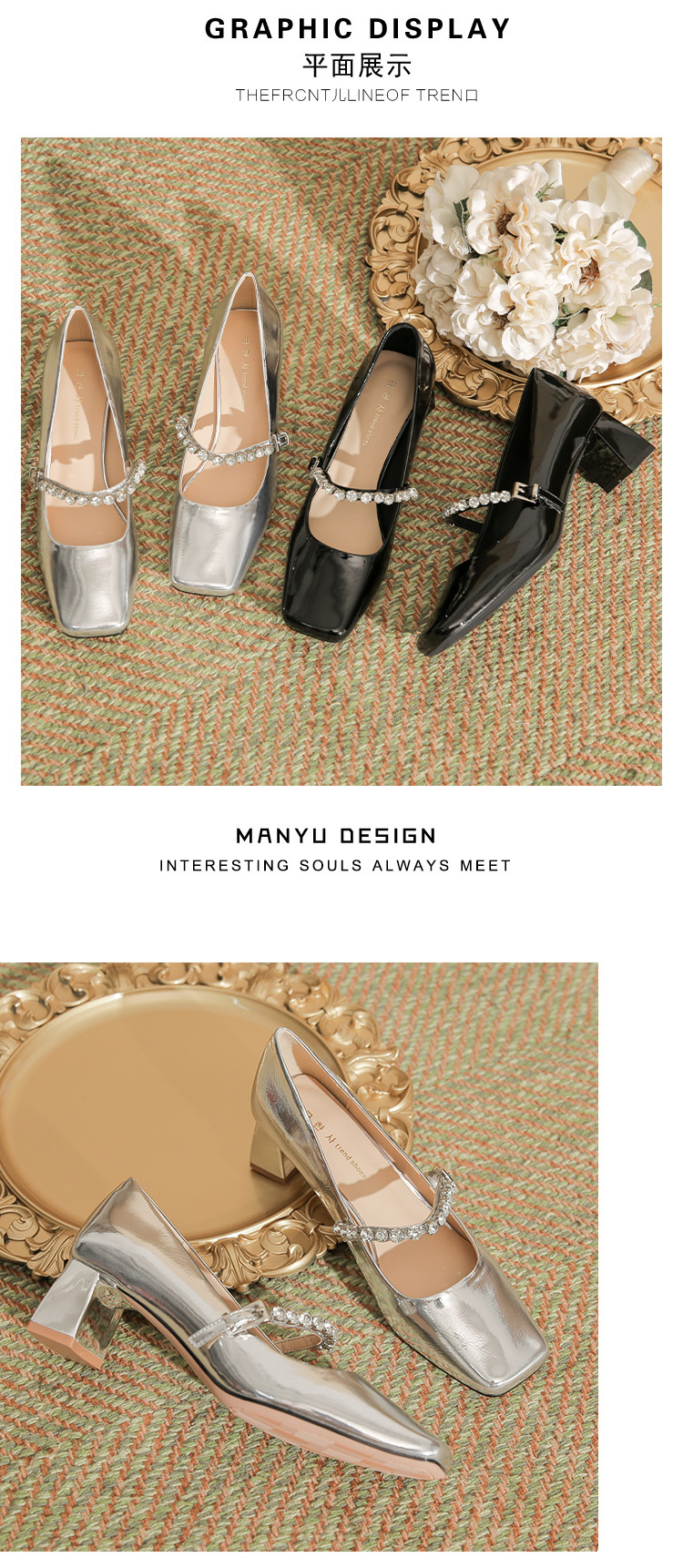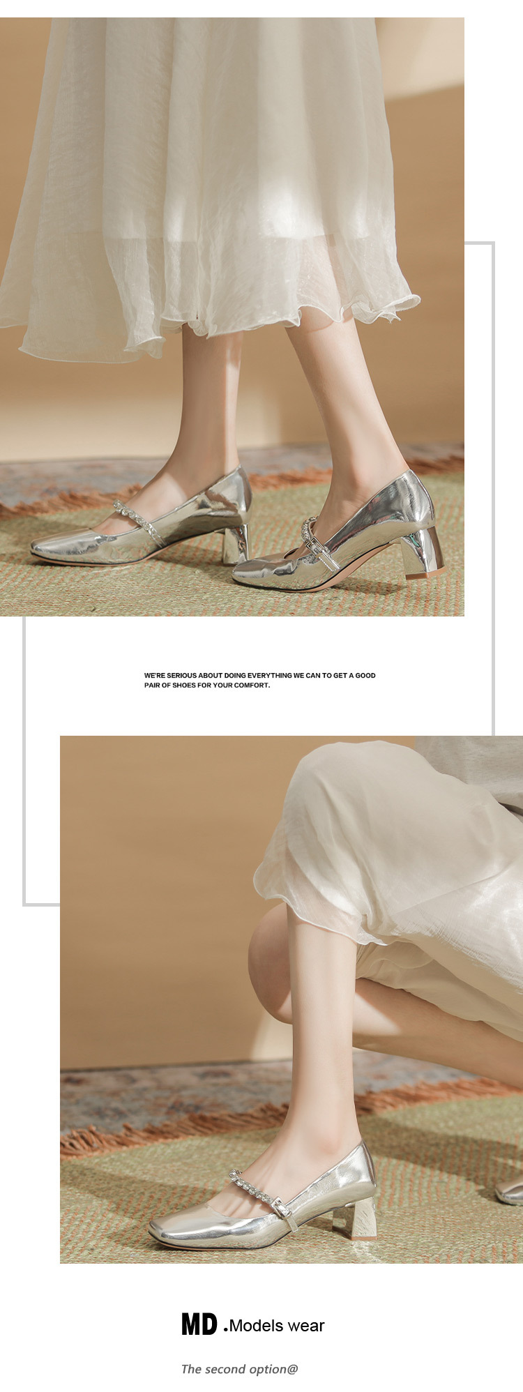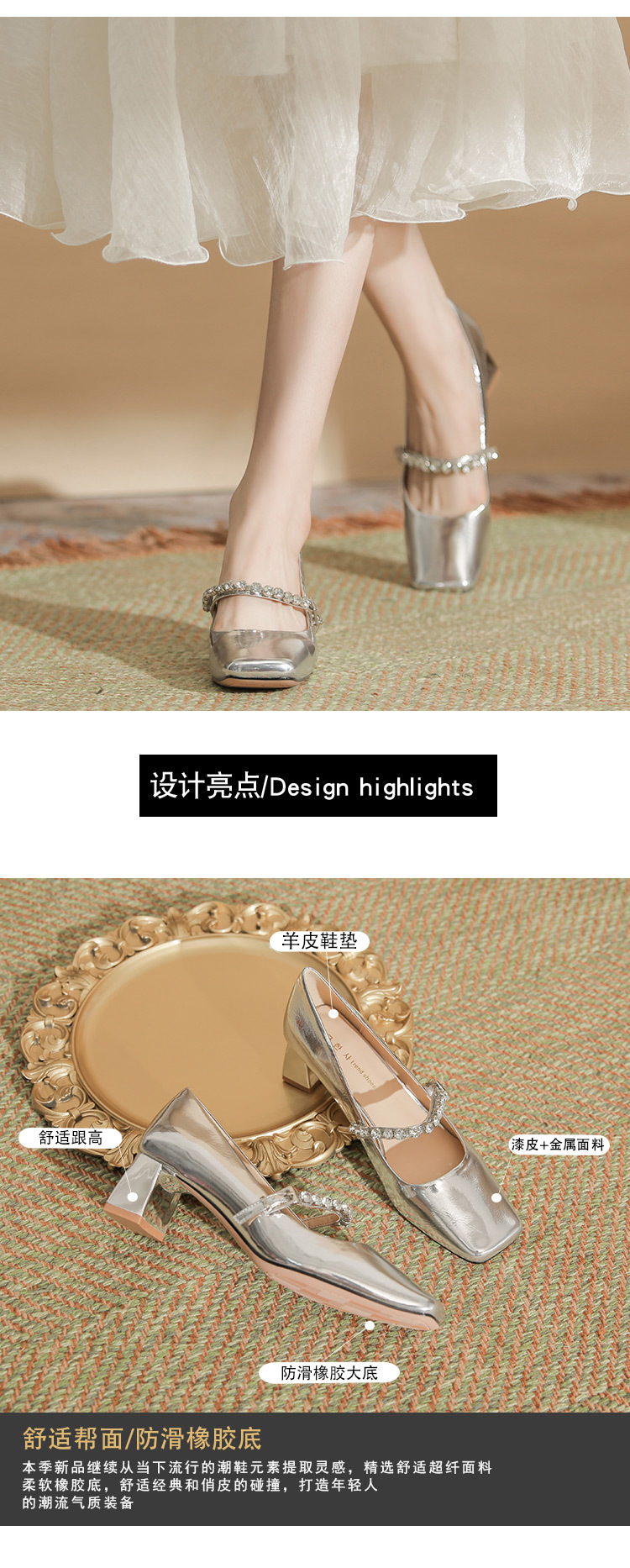 H988-2 빈티지 에나멜 가죽 메리 제인 신발 여성용 실버 싱글 레이어 신발 다이아몬드 벨트와 두꺼운 굽 유행 모든 일치 새로운 여성 신발