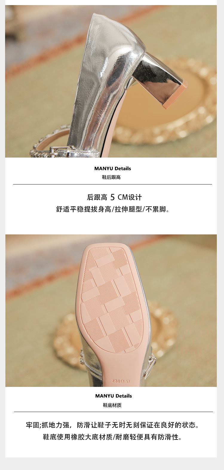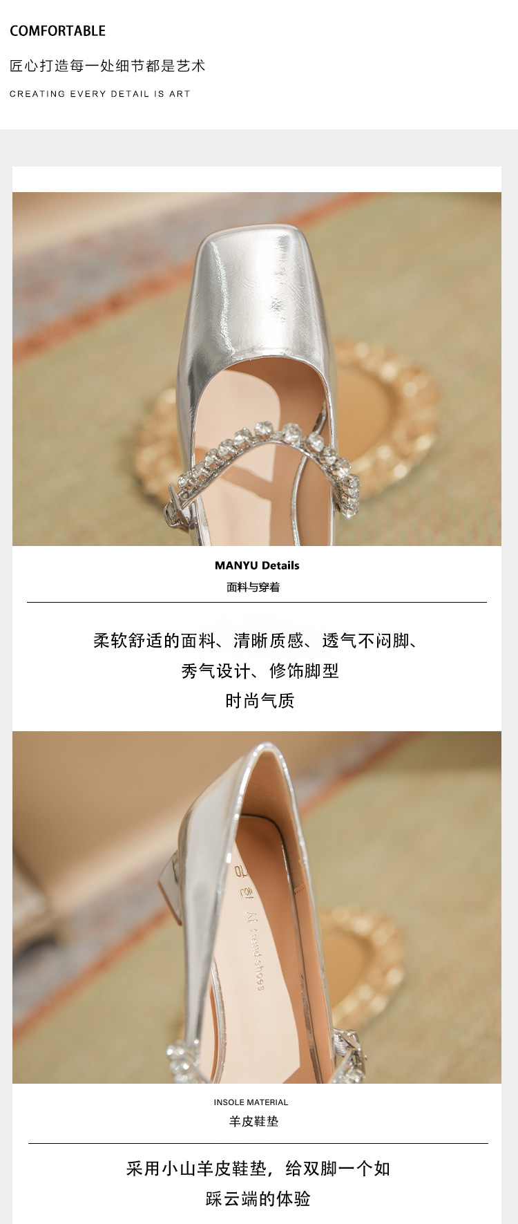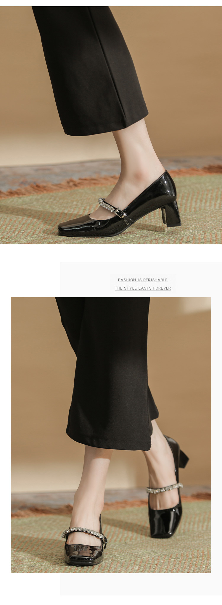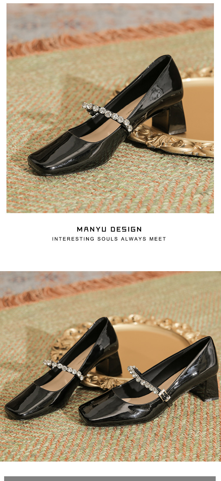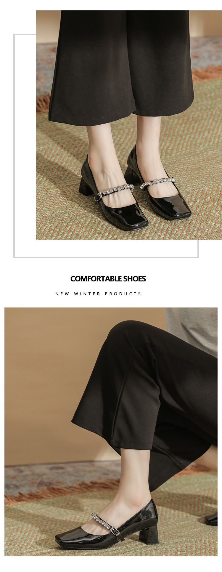 H988-2 빈티지 에나멜 가죽 메리 제인 신발 여성용 실버 싱글 레이어 신발 다이아몬드 벨트와 두꺼운 굽 유행 모든 일치 새로운 여성 신발