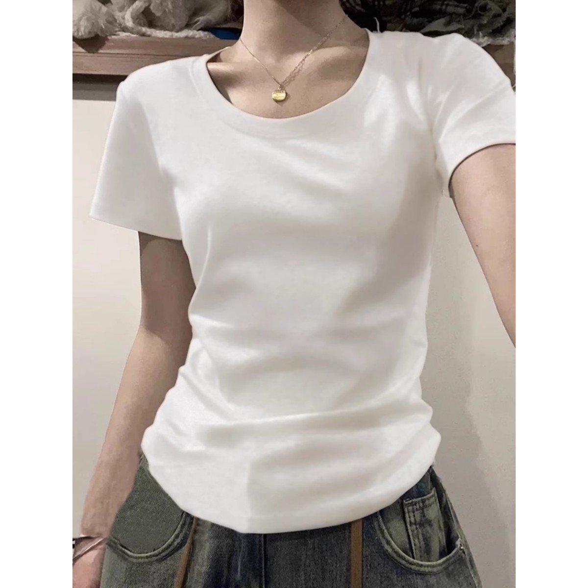 면 반팔 티셔츠 여성용 여름 꽉 끼는 슬림 핏 어깨 T 솔리드 컬러베이스 셔츠 도파민 착용 아메리칸 스타일 스파이스 탑스토어 가기