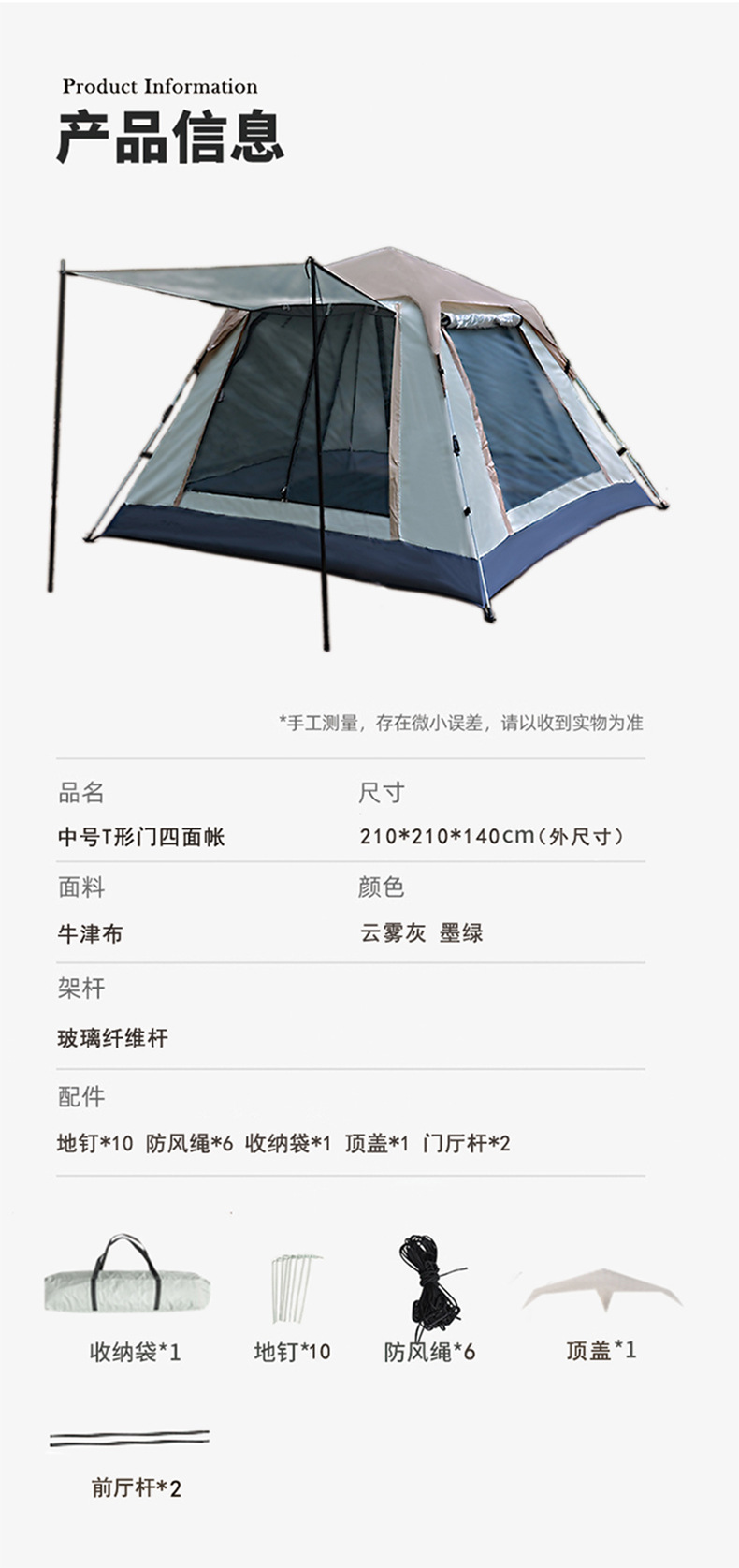 • 5-8 명 (240*240*160) 퀵 샌드 골드 주문 구름 회색 t 자형 4 면 계정 [수납 가방 홀 장대 방풍 로프 채광창 커버 네일]