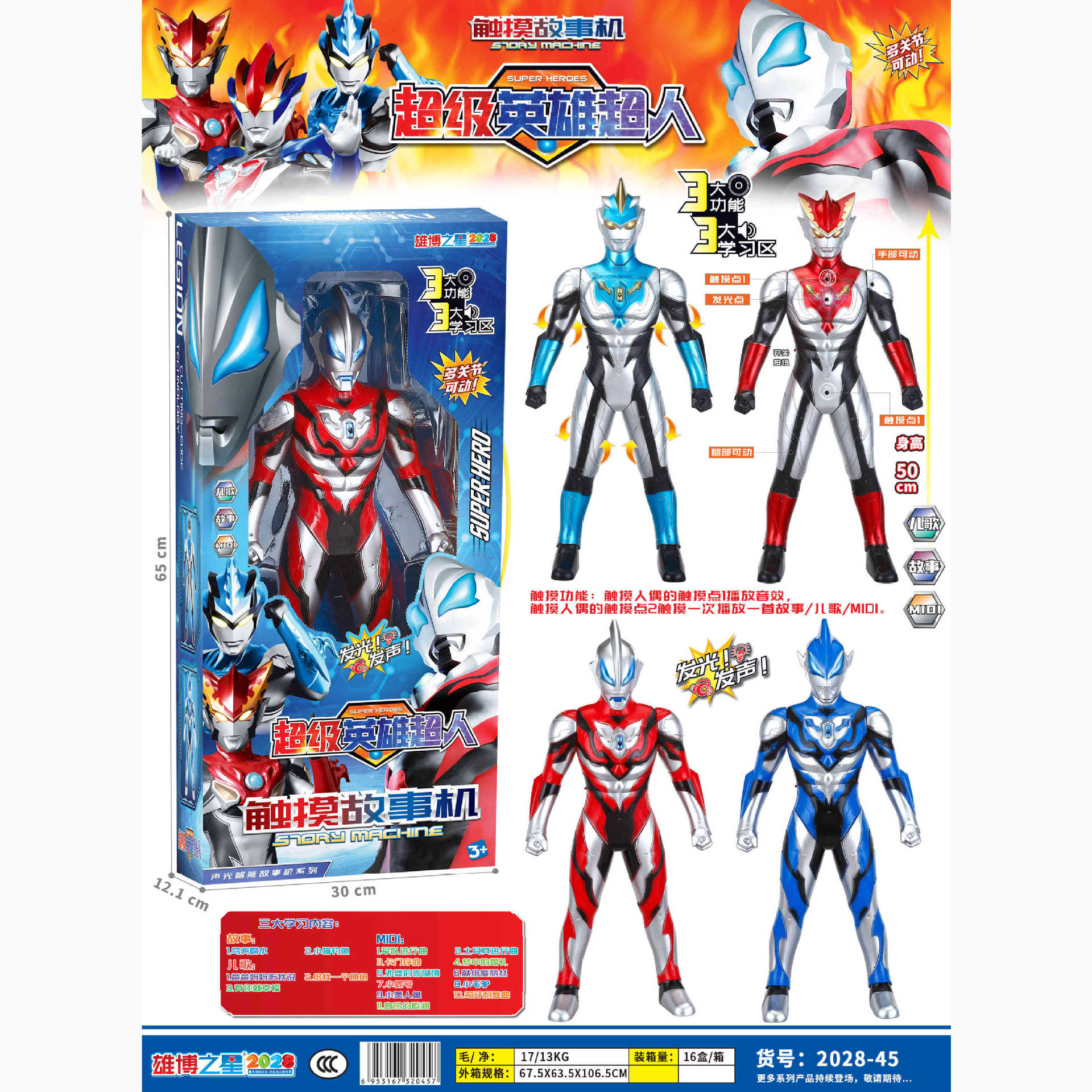 어린이 음향 효과 어린이 노래 발광 사운드 50CM 영웅 슈퍼맨 터치 스토리 로봇 모델 인형 장난감