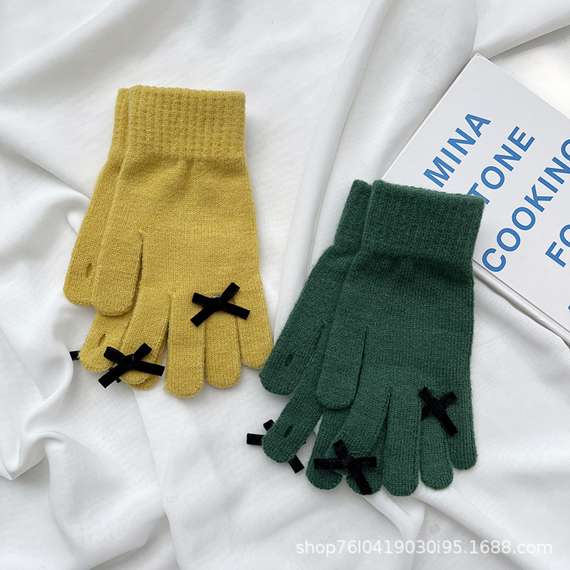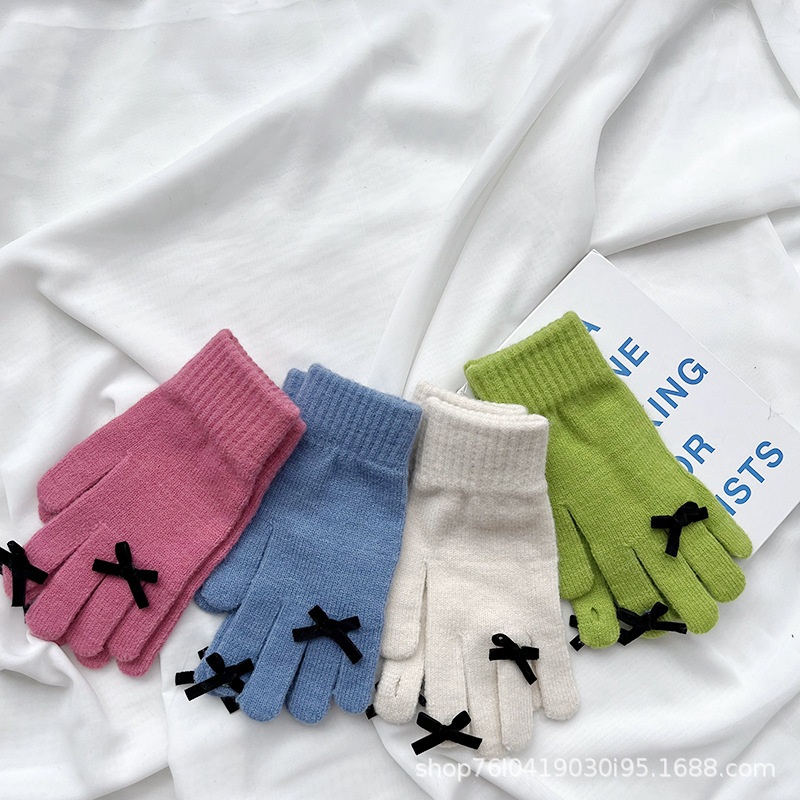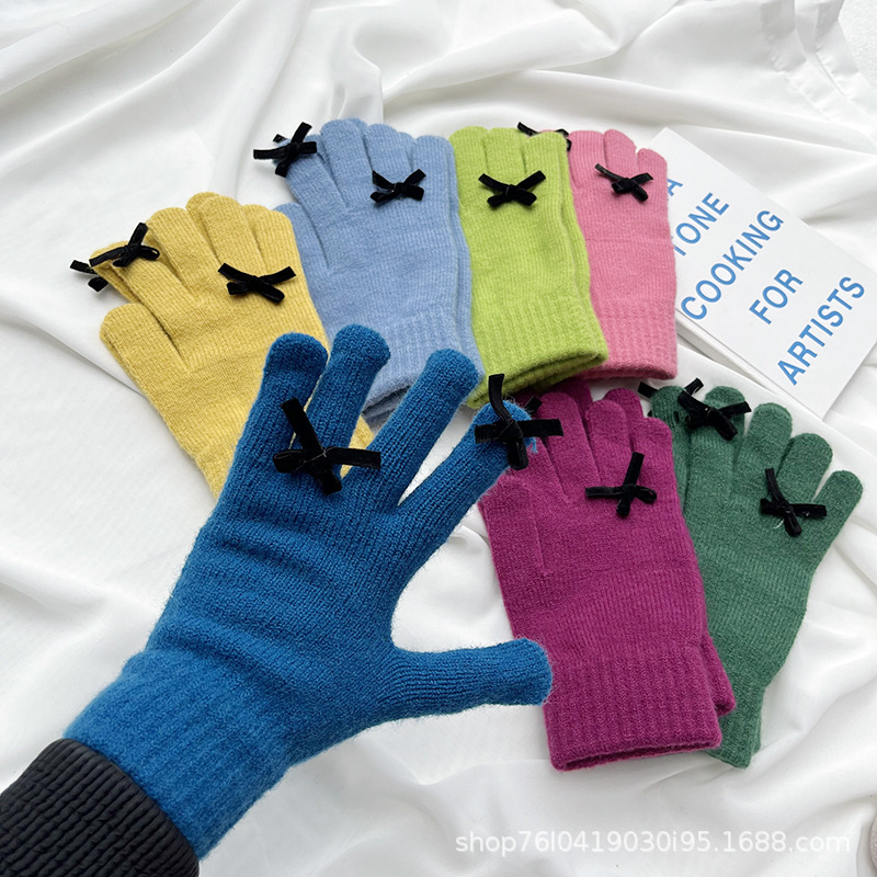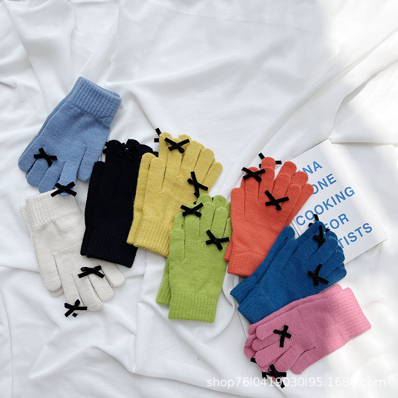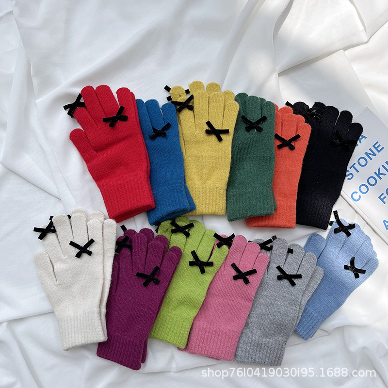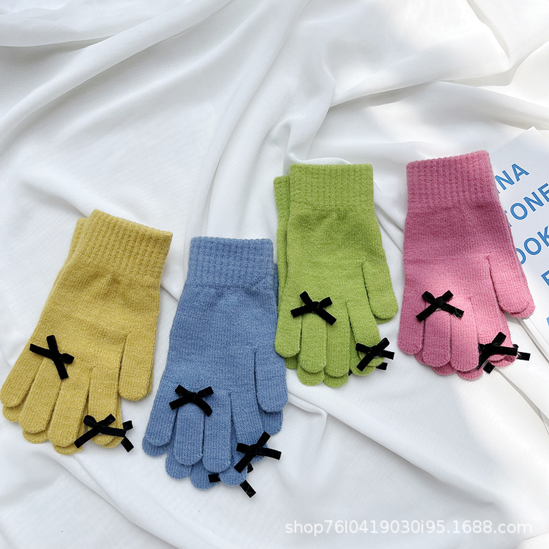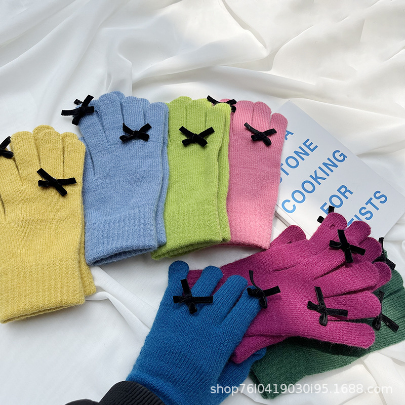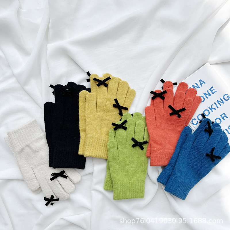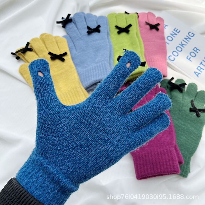 새로운 가을과 겨울 니트 장갑 여성용 슈퍼 귀여운 활 새는 손가락 터치 스크린 캔디 컬러 소녀를위한 모든 경기 장갑