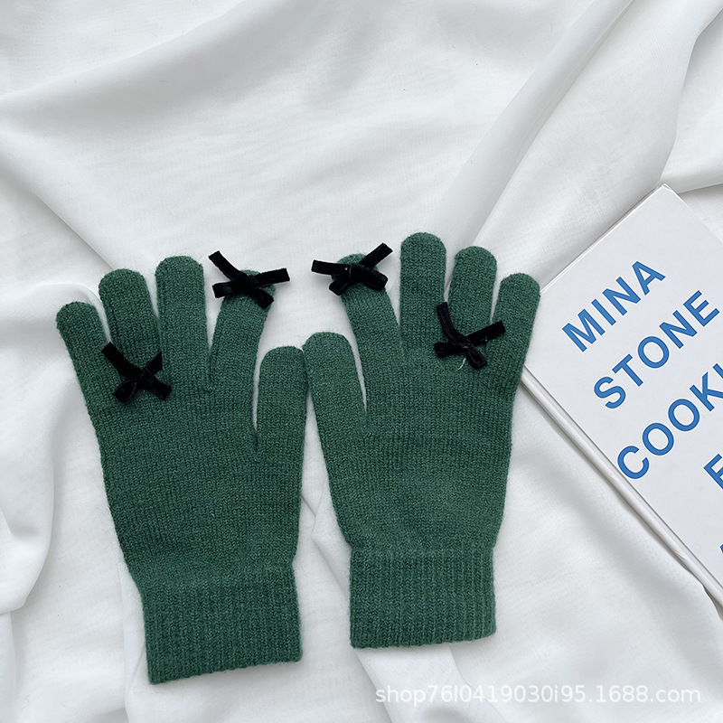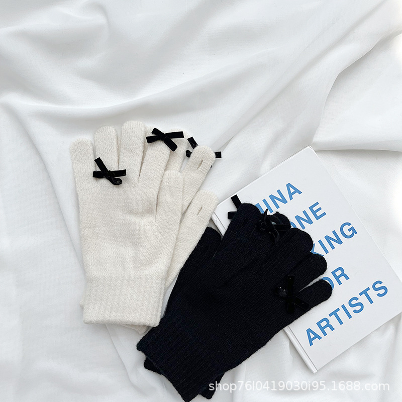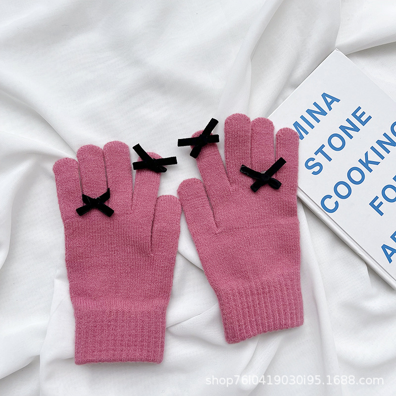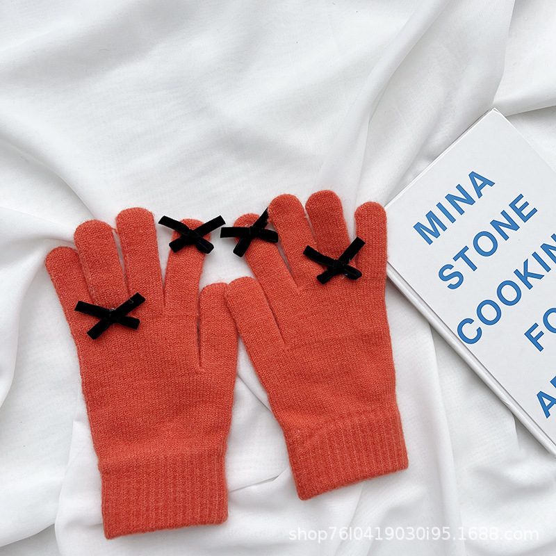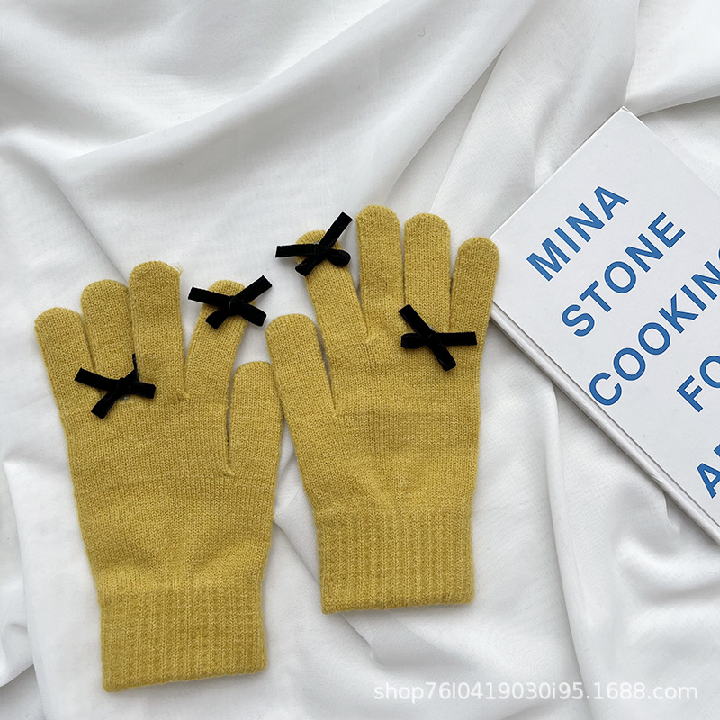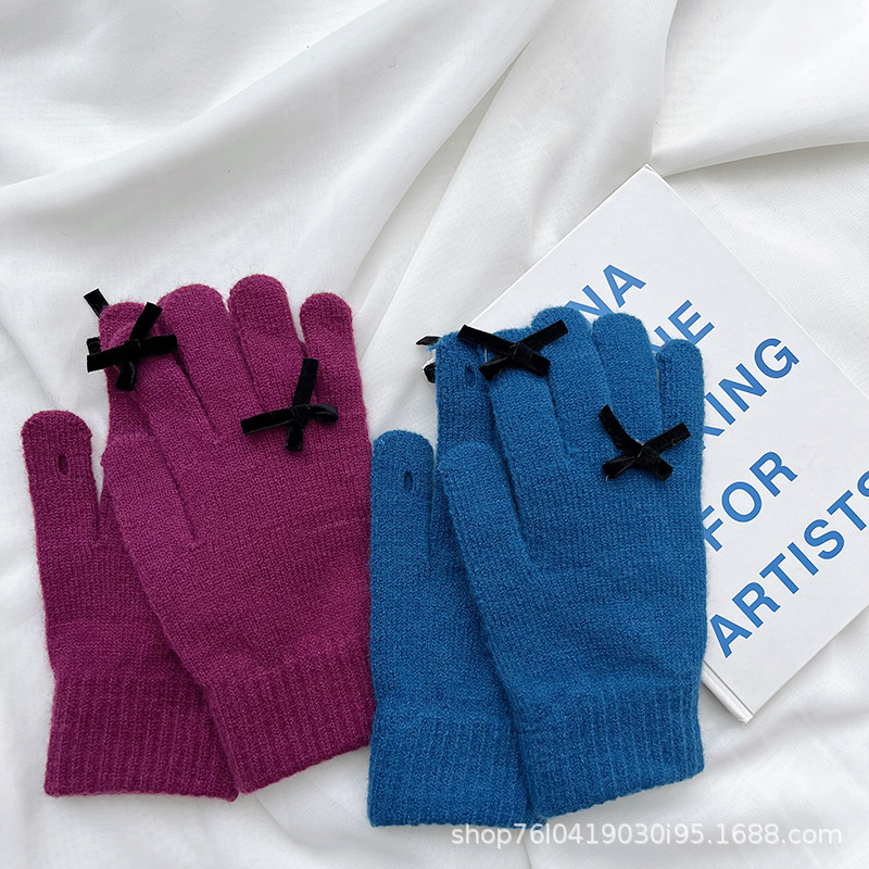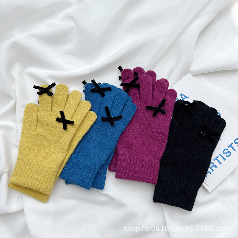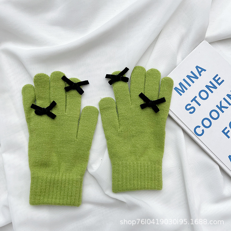 새로운 가을과 겨울 니트 장갑 여성용 슈퍼 귀여운 활 새는 손가락 터치 스크린 캔디 컬러 소녀를위한 모든 경기 장갑