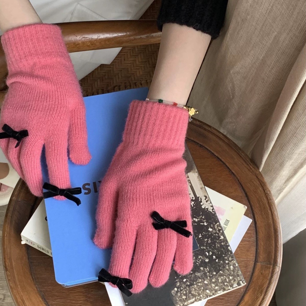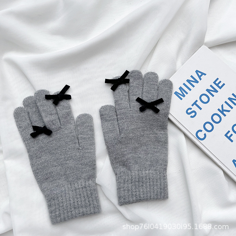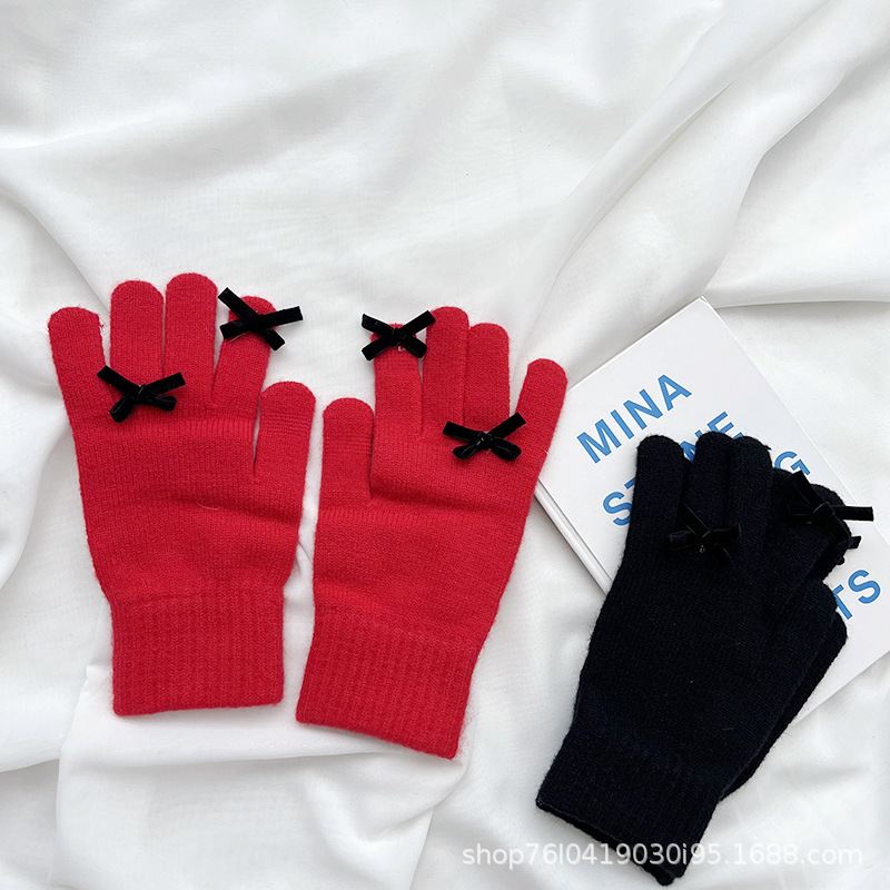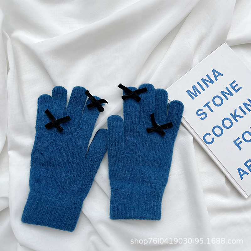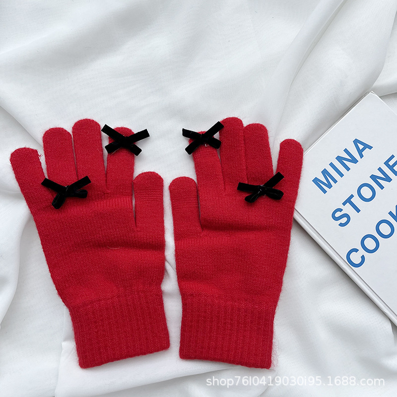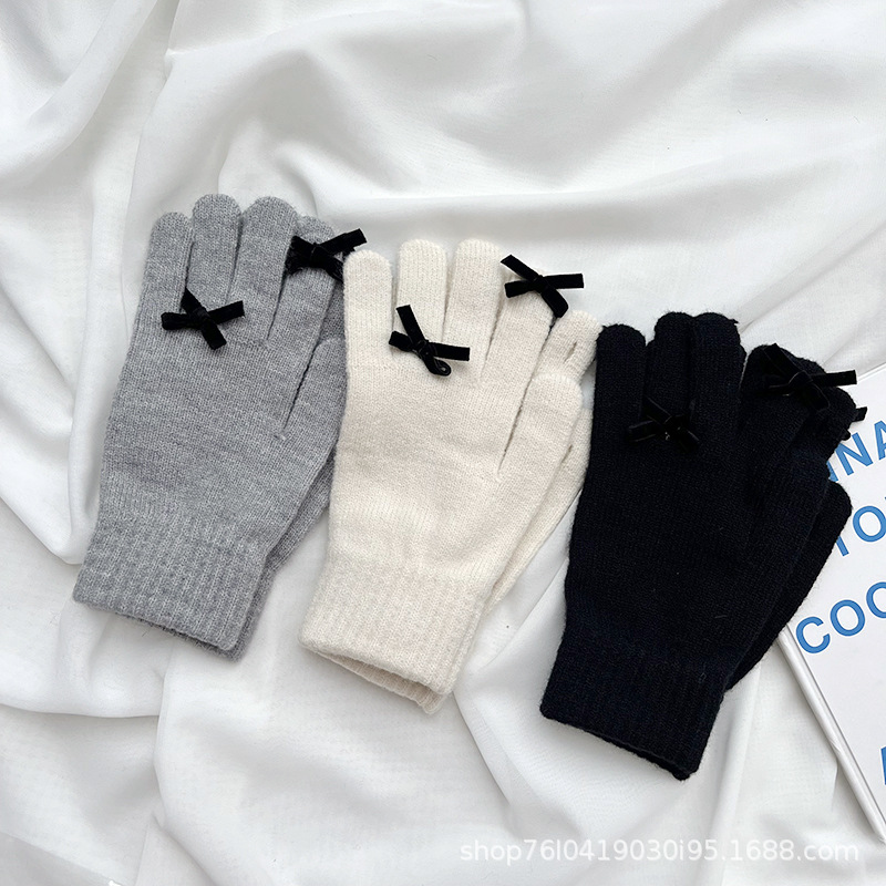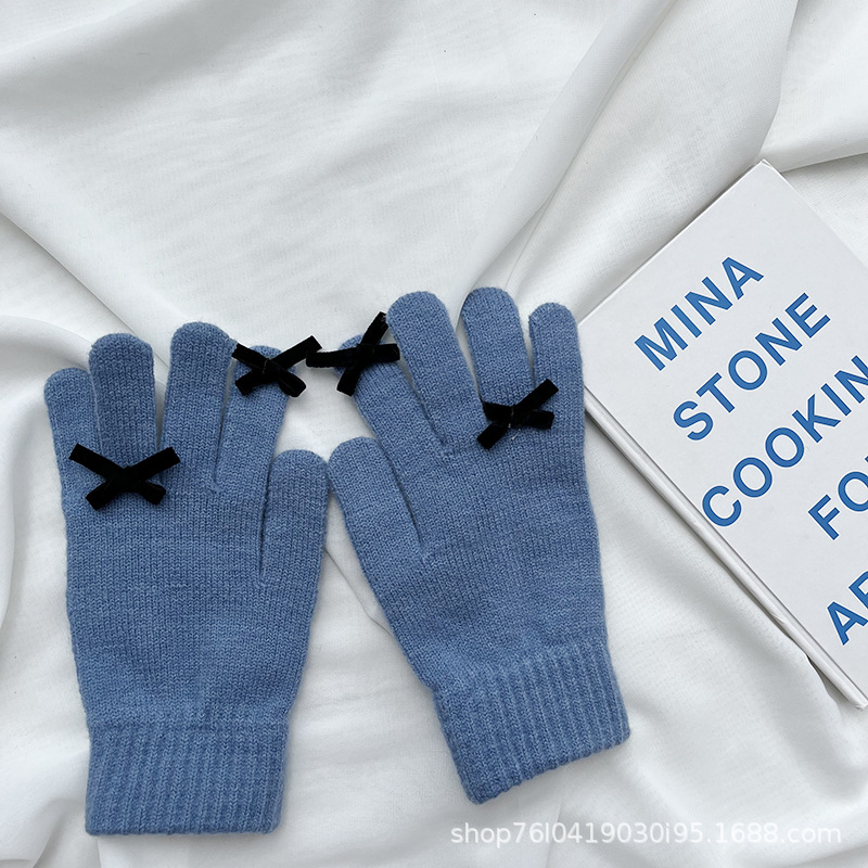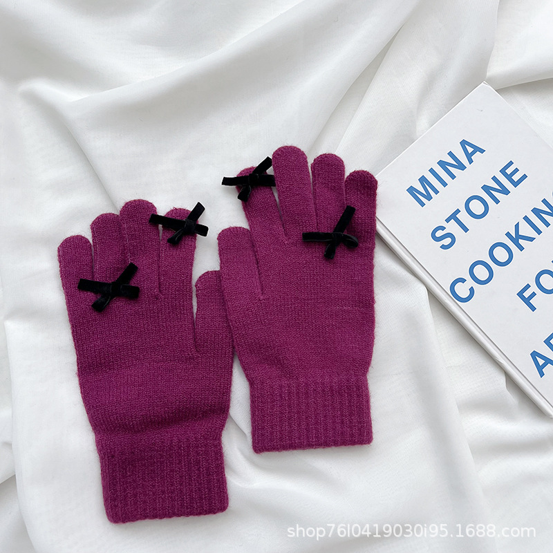새로운 가을과 겨울 니트 장갑 여성용 슈퍼 귀여운 활 새는 손가락 터치 스크린 캔디 컬러 소녀를위한 모든 경기 장갑
