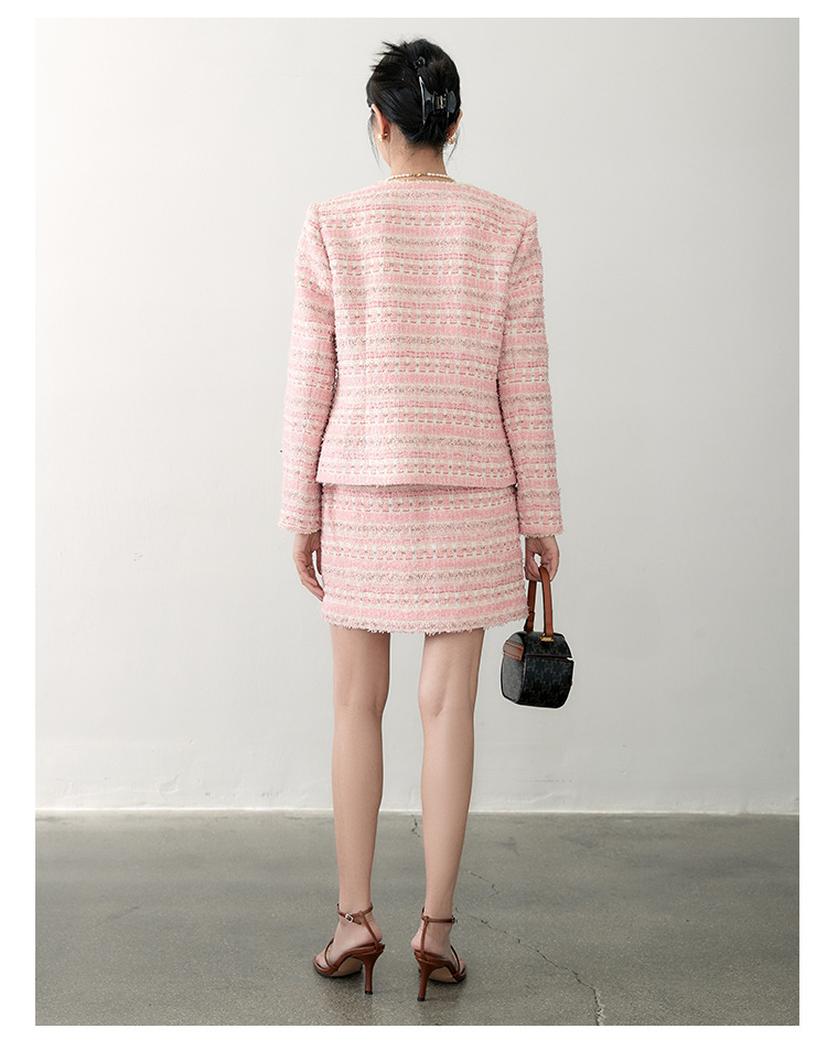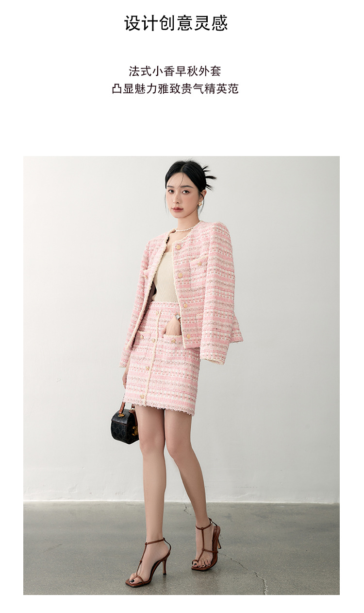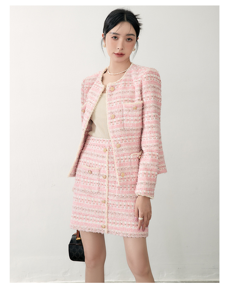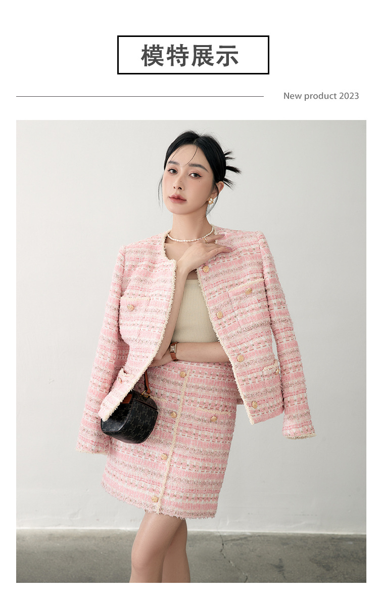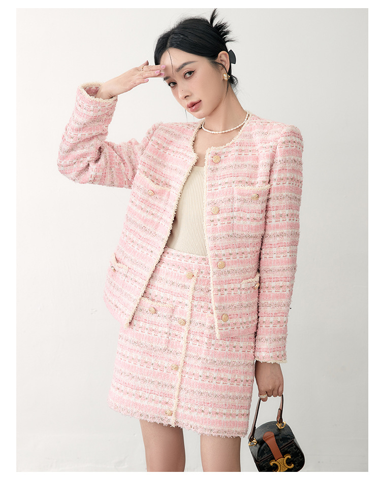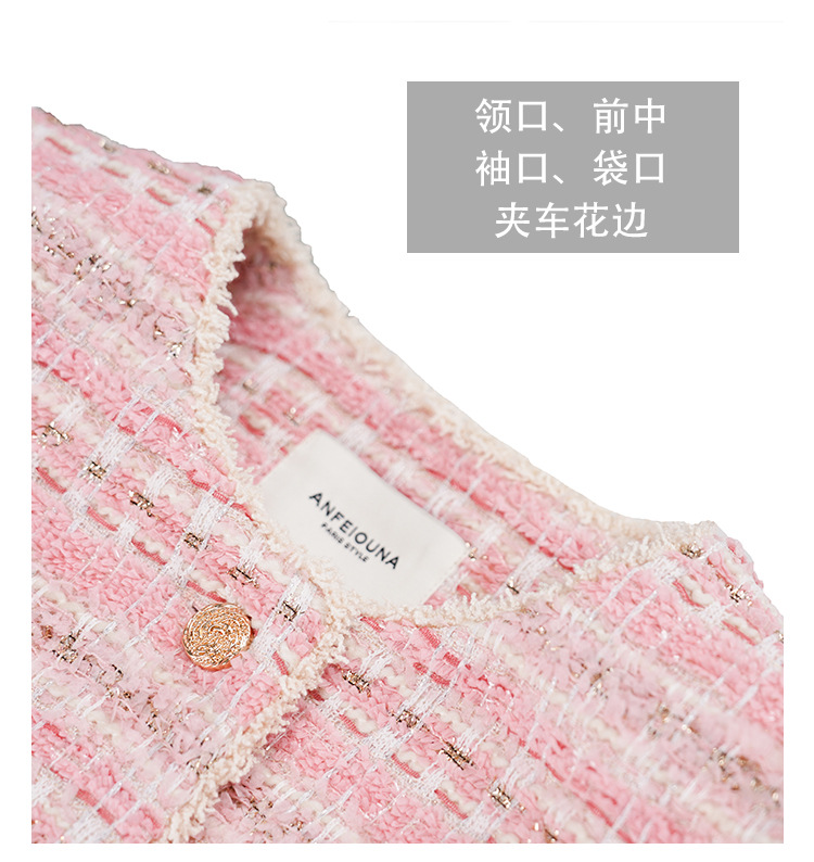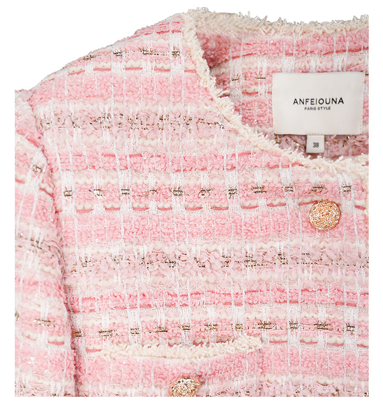 안페오나 봄 가을 신상 프렌치 스타일 모헤어 폴리에스터 트위드 핑크 화이트닝 상의와 스커트 여성 세트 패셔너블스토어 가기