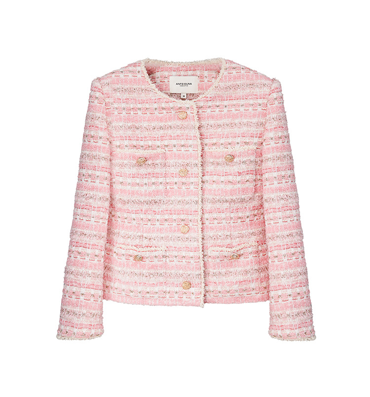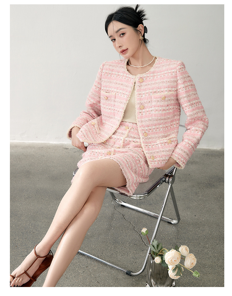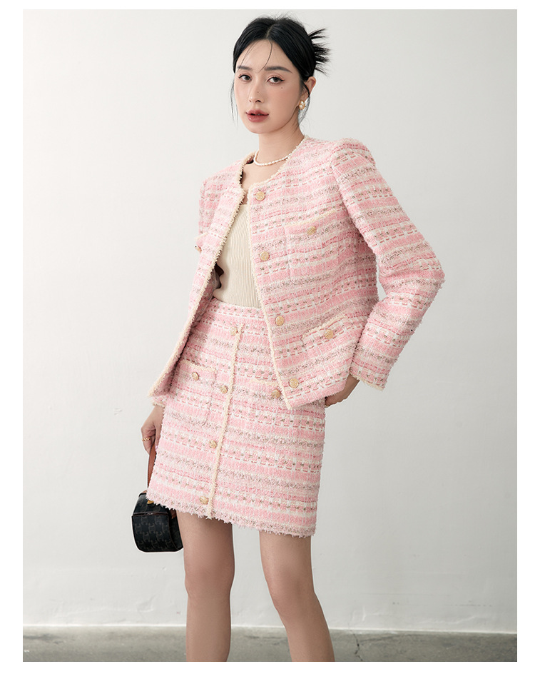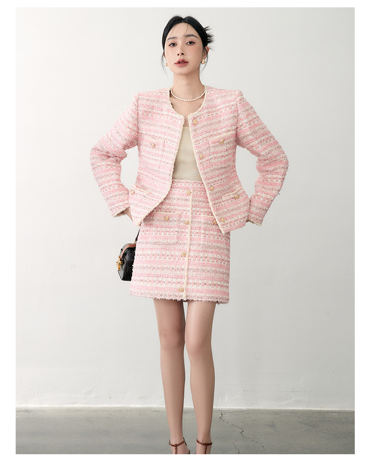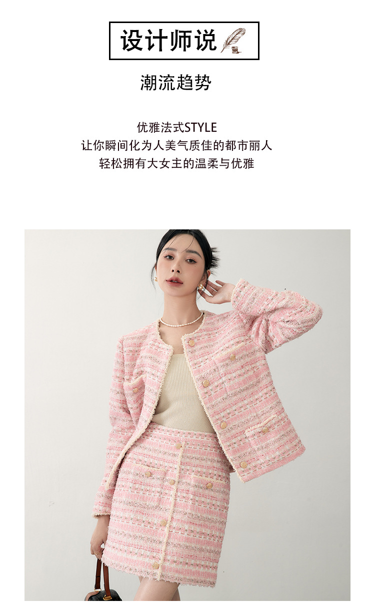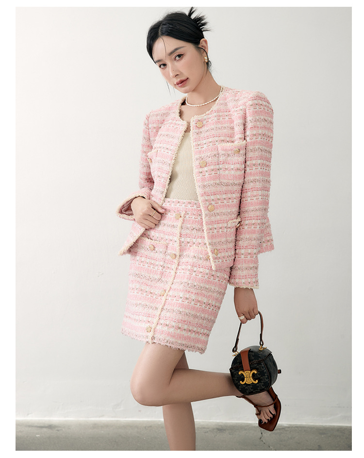 안페오나 봄 가을 신상 프렌치 스타일 모헤어 폴리에스터 트위드 핑크 화이트닝 상의와 스커트 여성 세트 패셔너블스토어 가기
