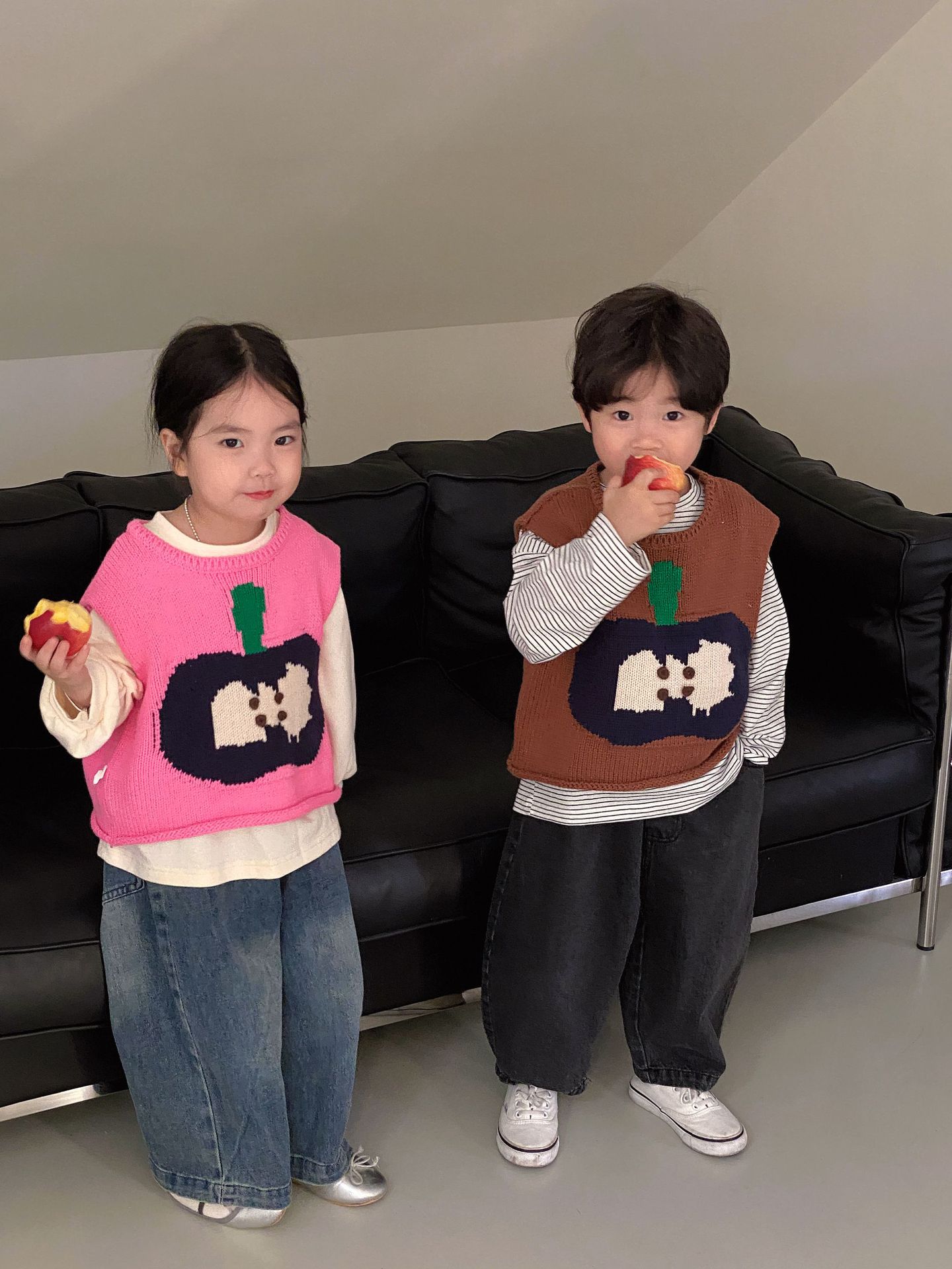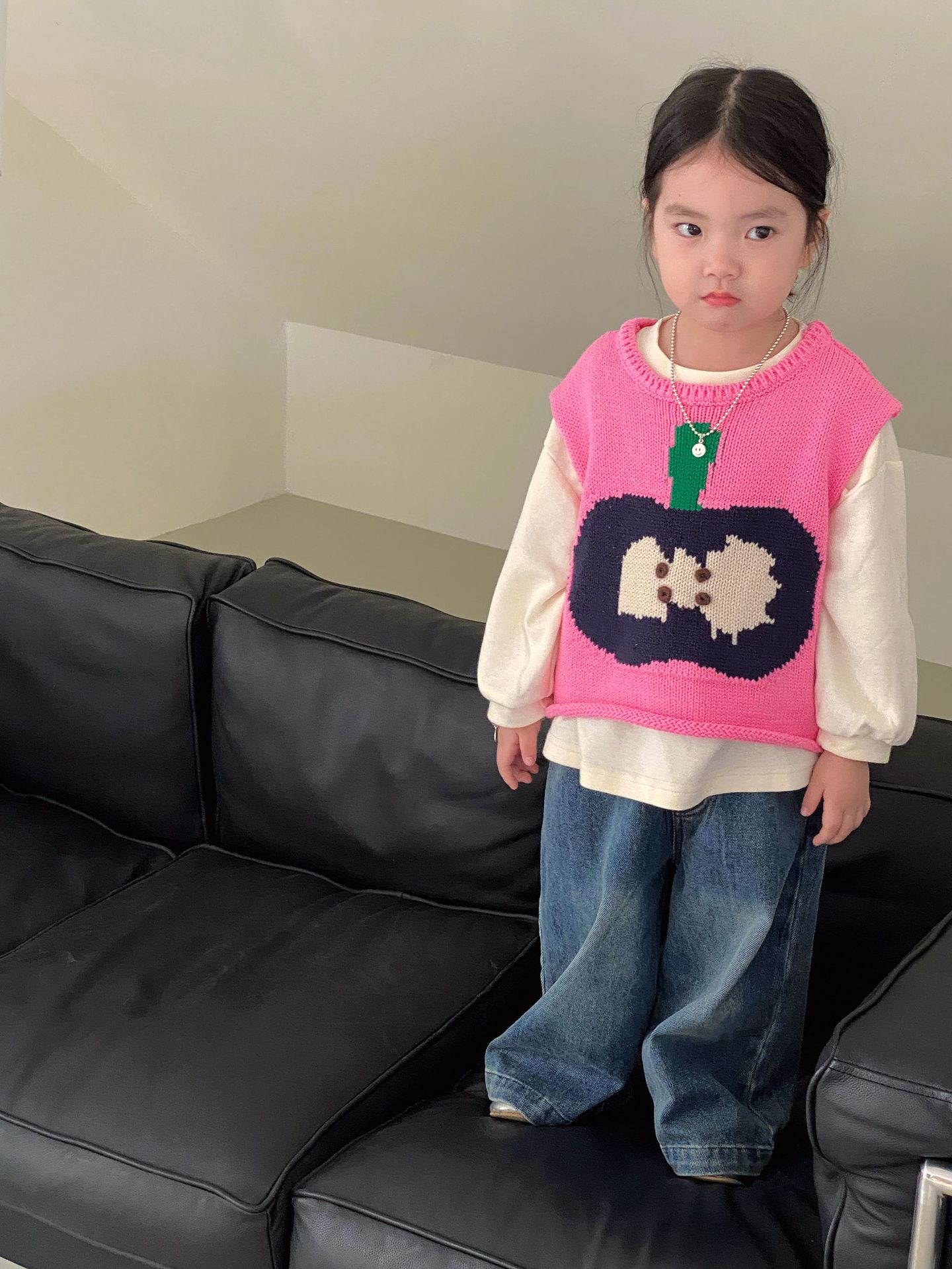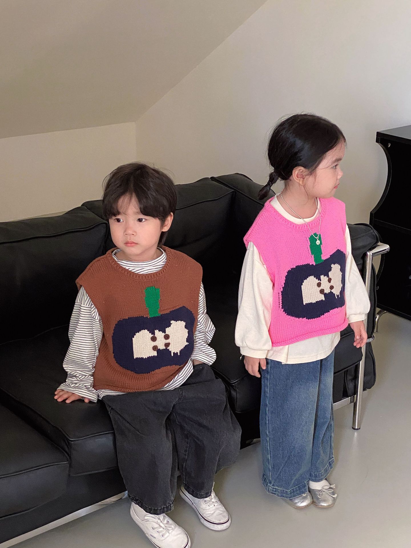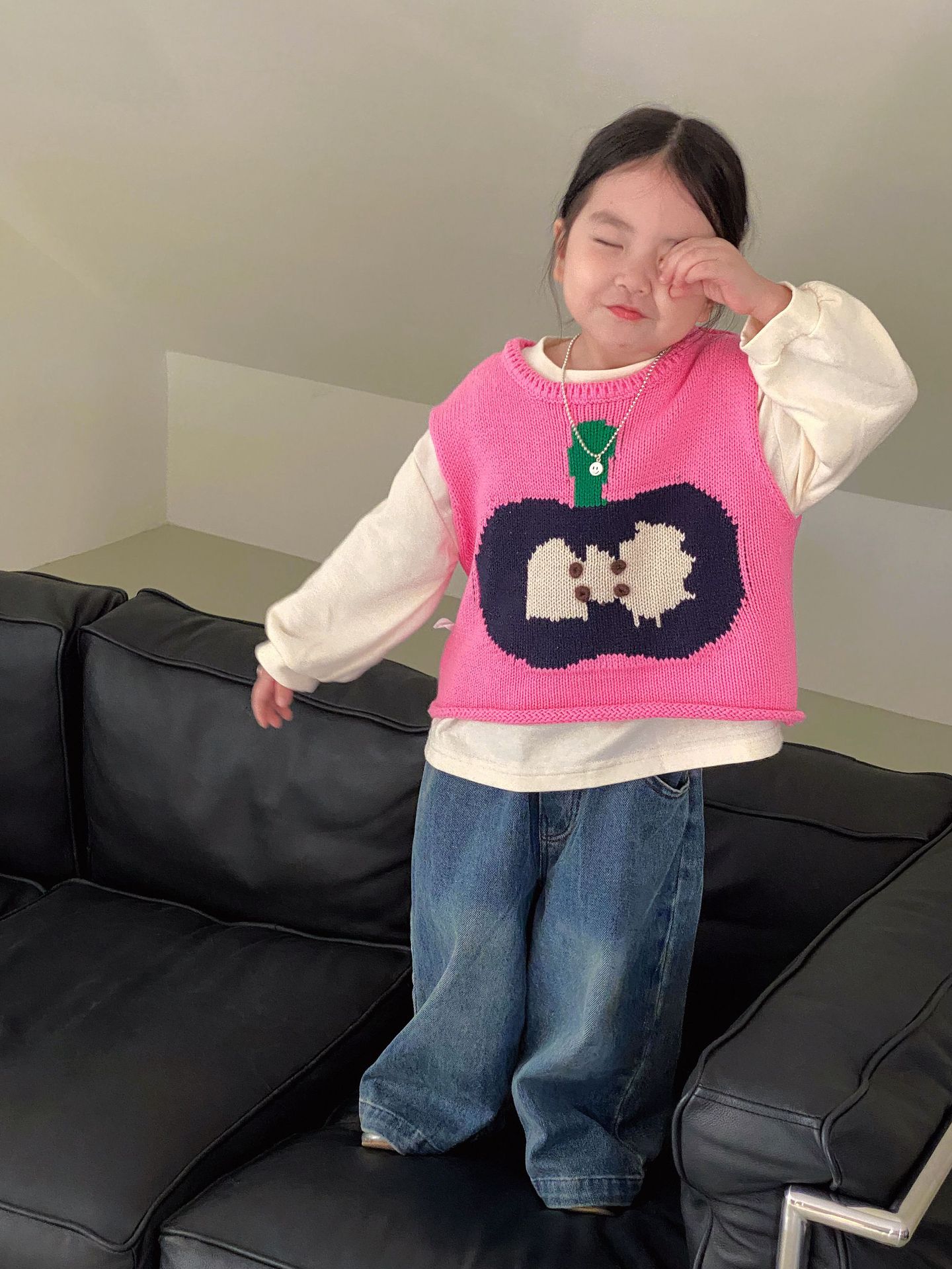 새로운 한국판 남아 여아용 만화 애플 니트 스웨터, 중소형 아동용 모직 조끼, 세련된 아동복스토어 가기