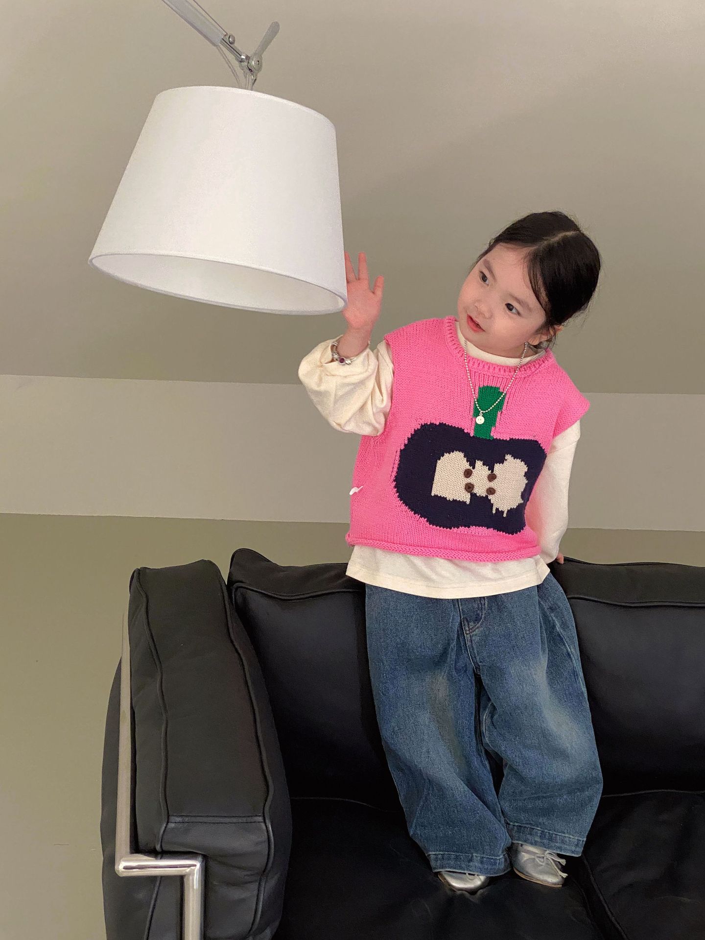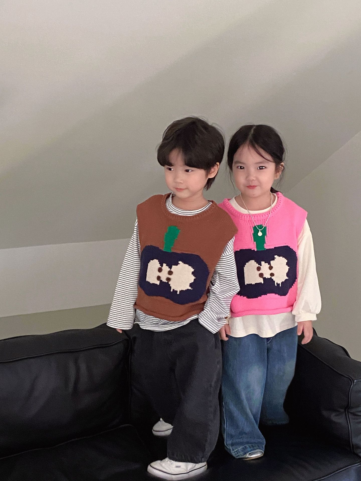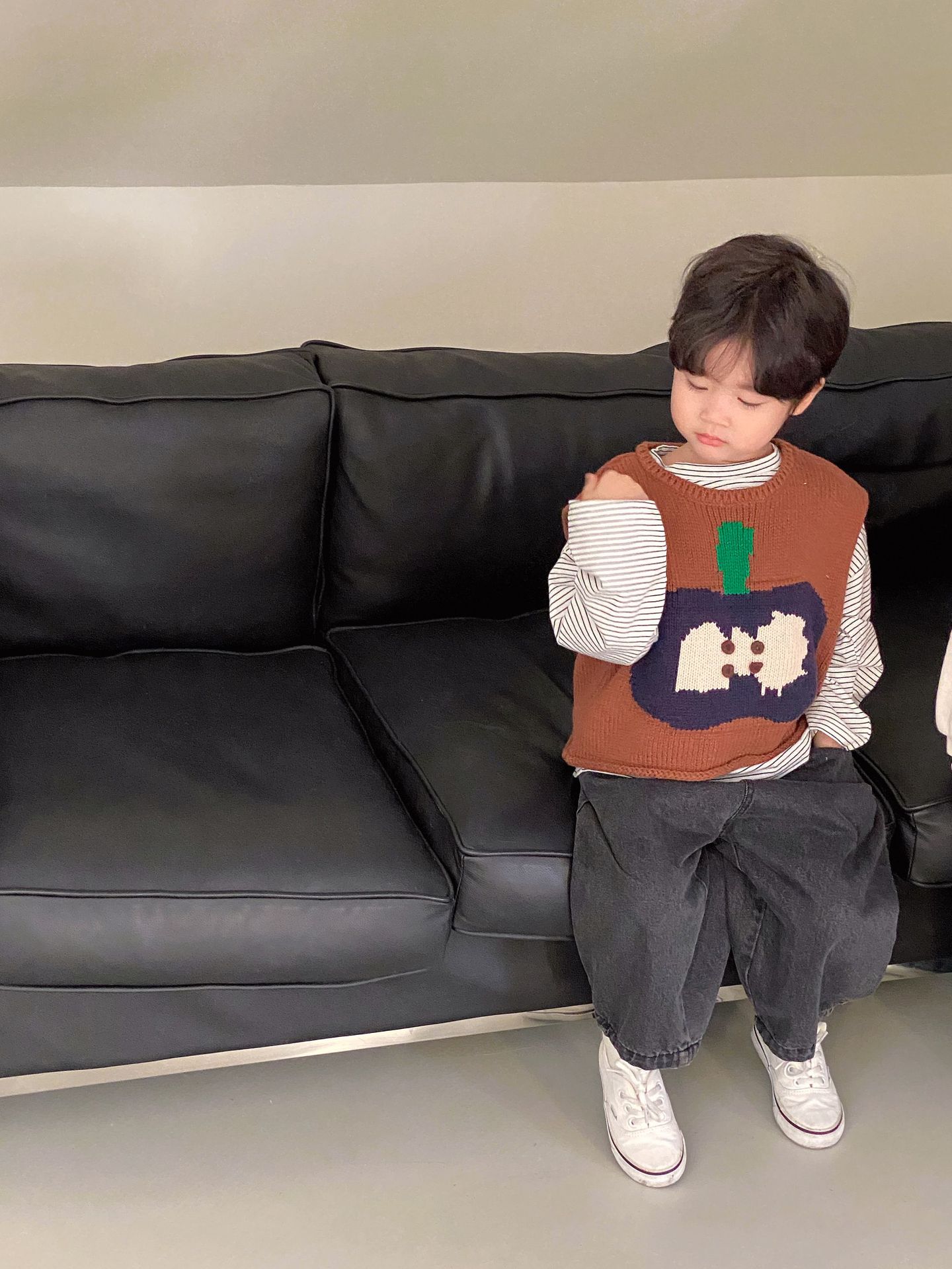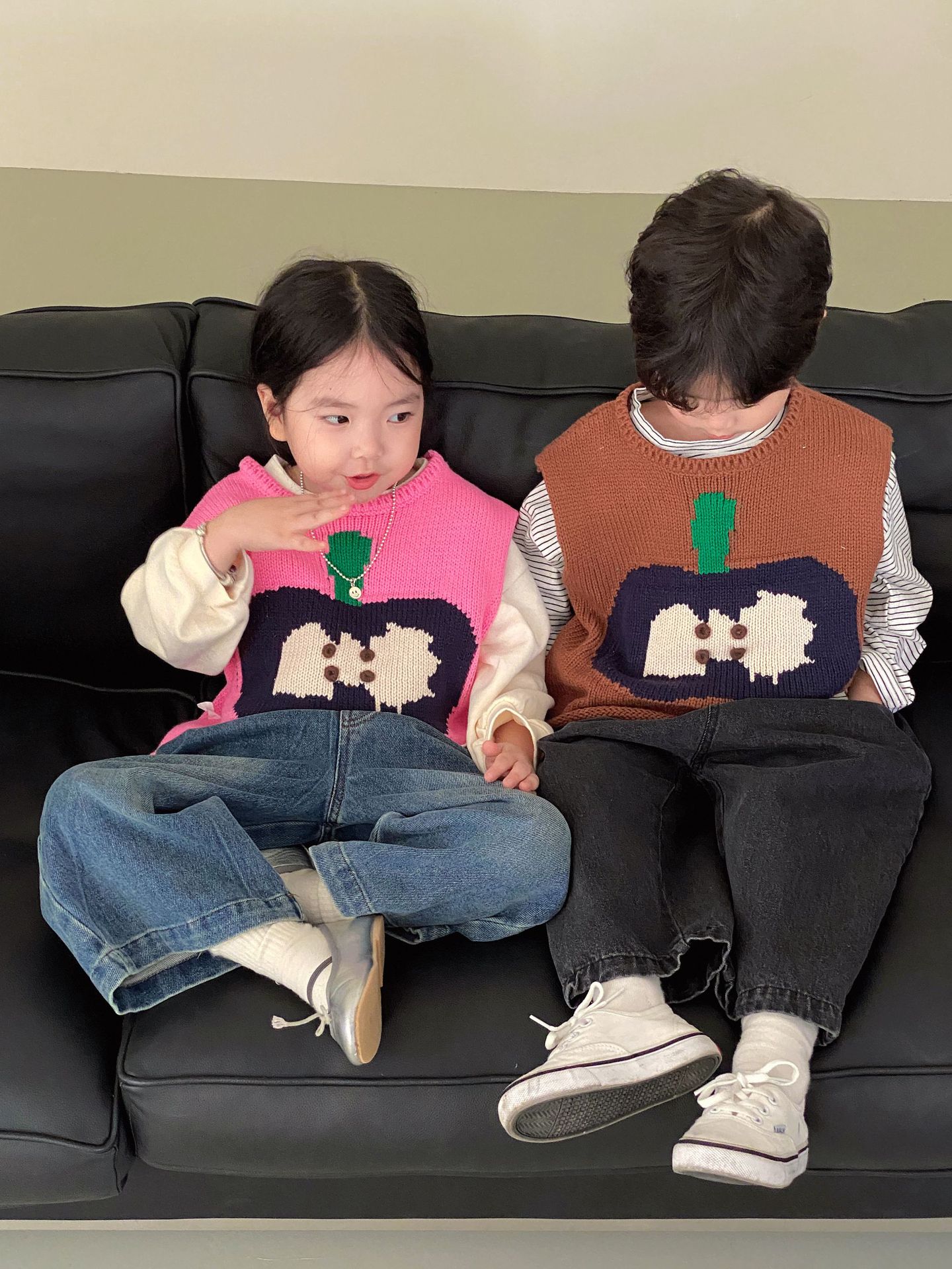 새로운 한국판 남아 여아용 만화 애플 니트 스웨터, 중소형 아동용 모직 조끼, 세련된 아동복스토어 가기
