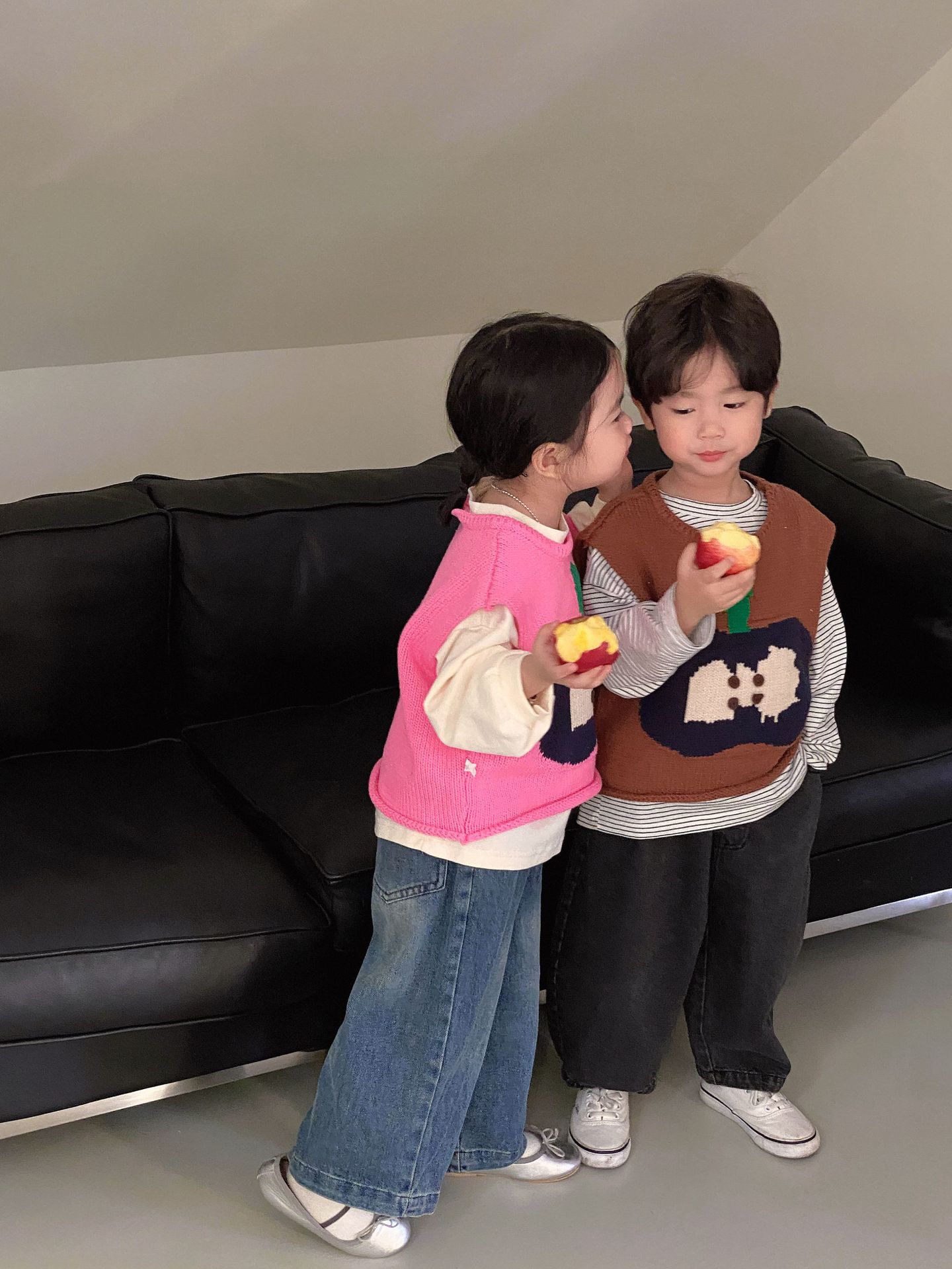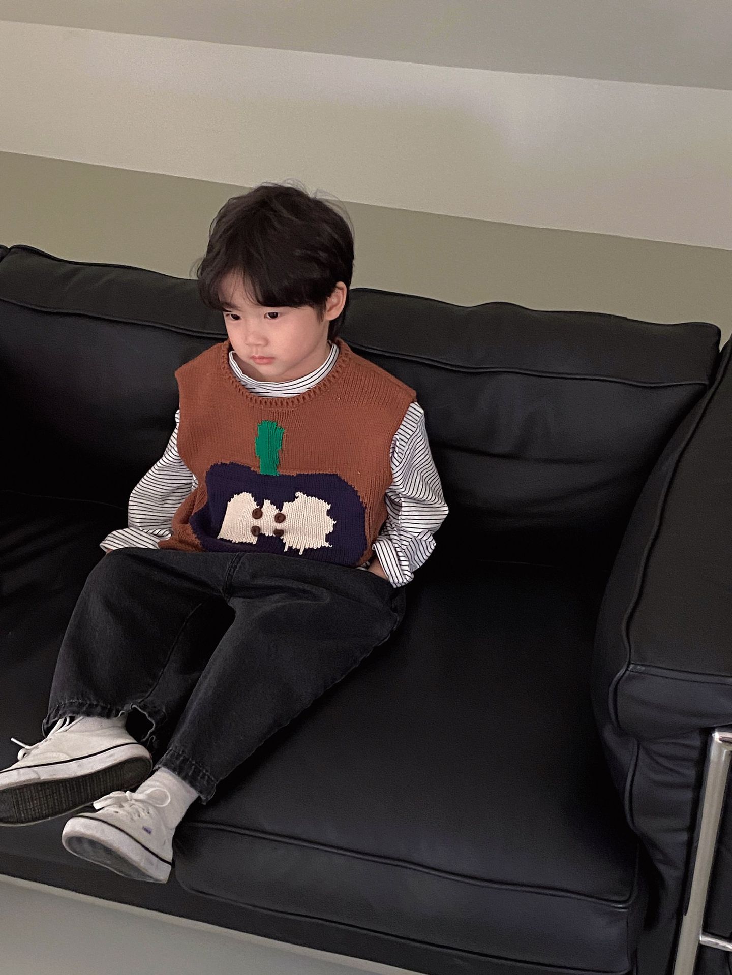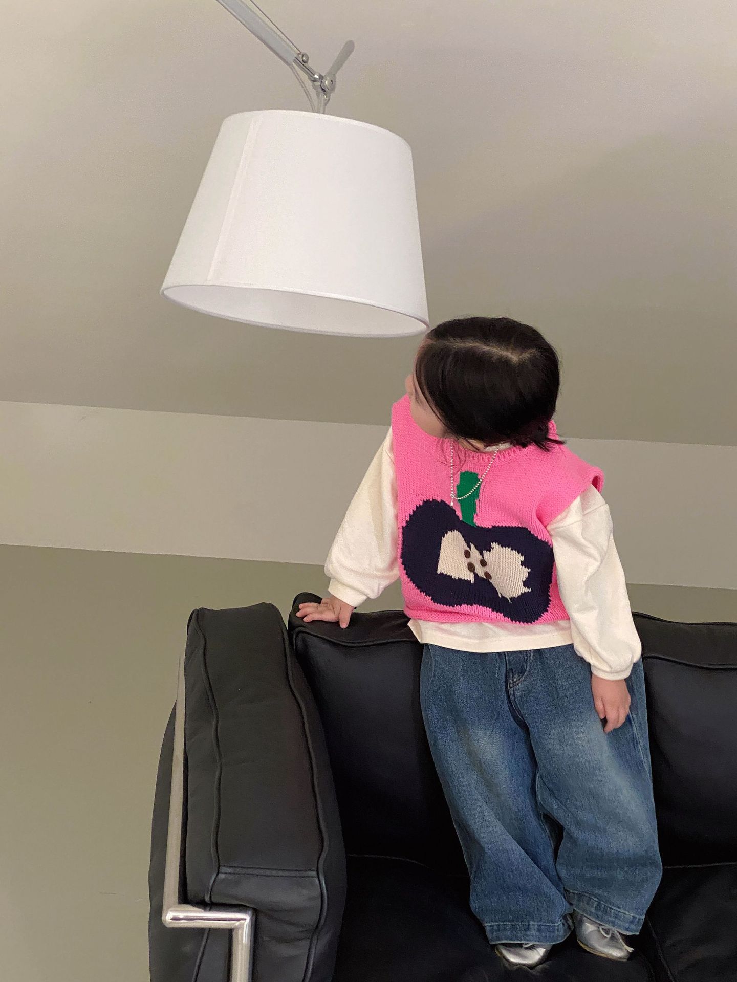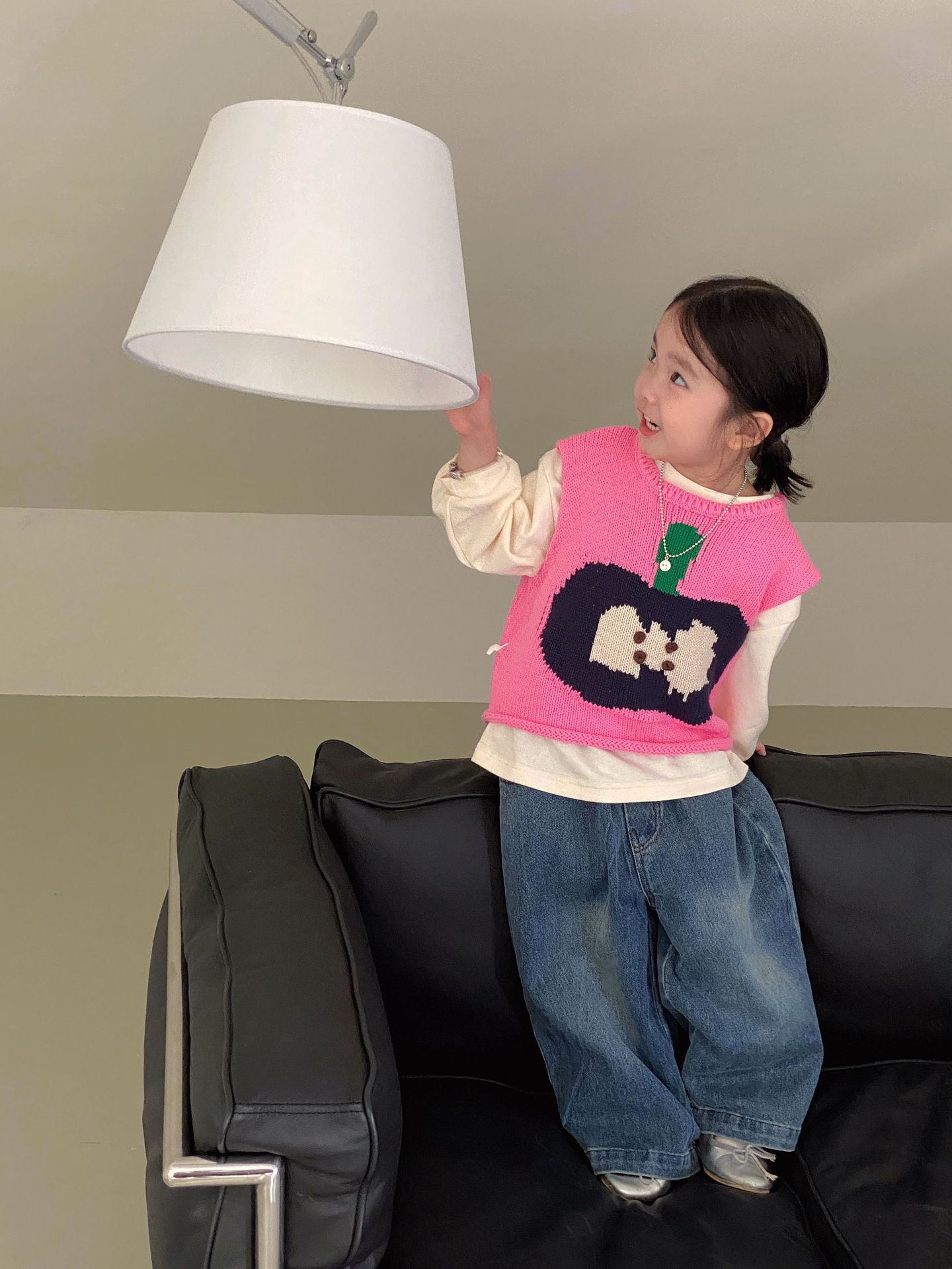 새로운 한국판 남아 여아용 만화 애플 니트 스웨터, 중소형 아동용 모직 조끼, 세련된 아동복스토어 가기