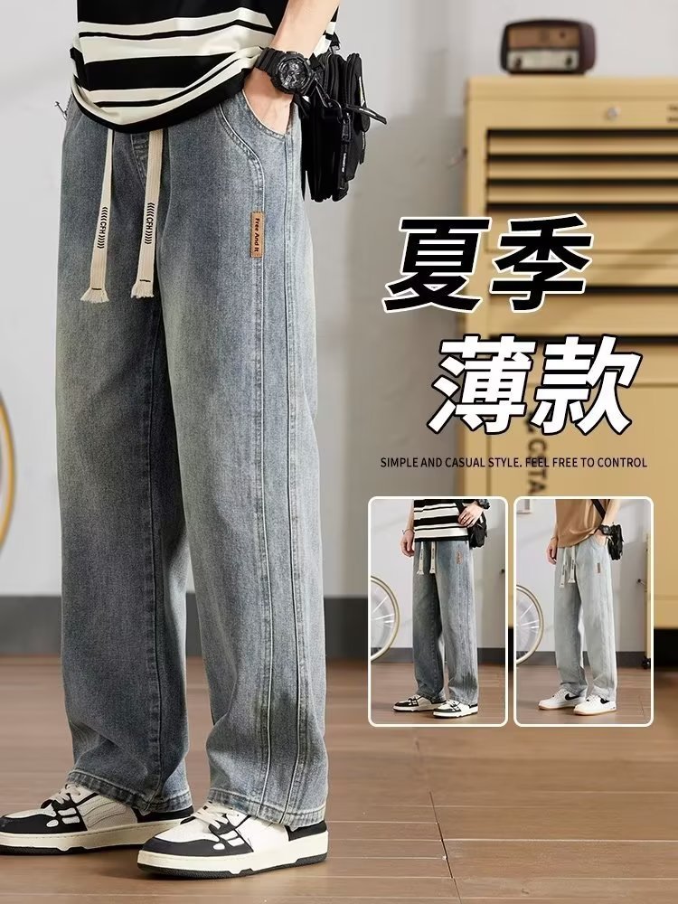 청바지 남성 여름 얇은 2023 트렌디 브랜드 아메리칸 스타일 하이 스트리트 느슨한 스트레이트 캐주얼 와이드 레그 롱 팬츠