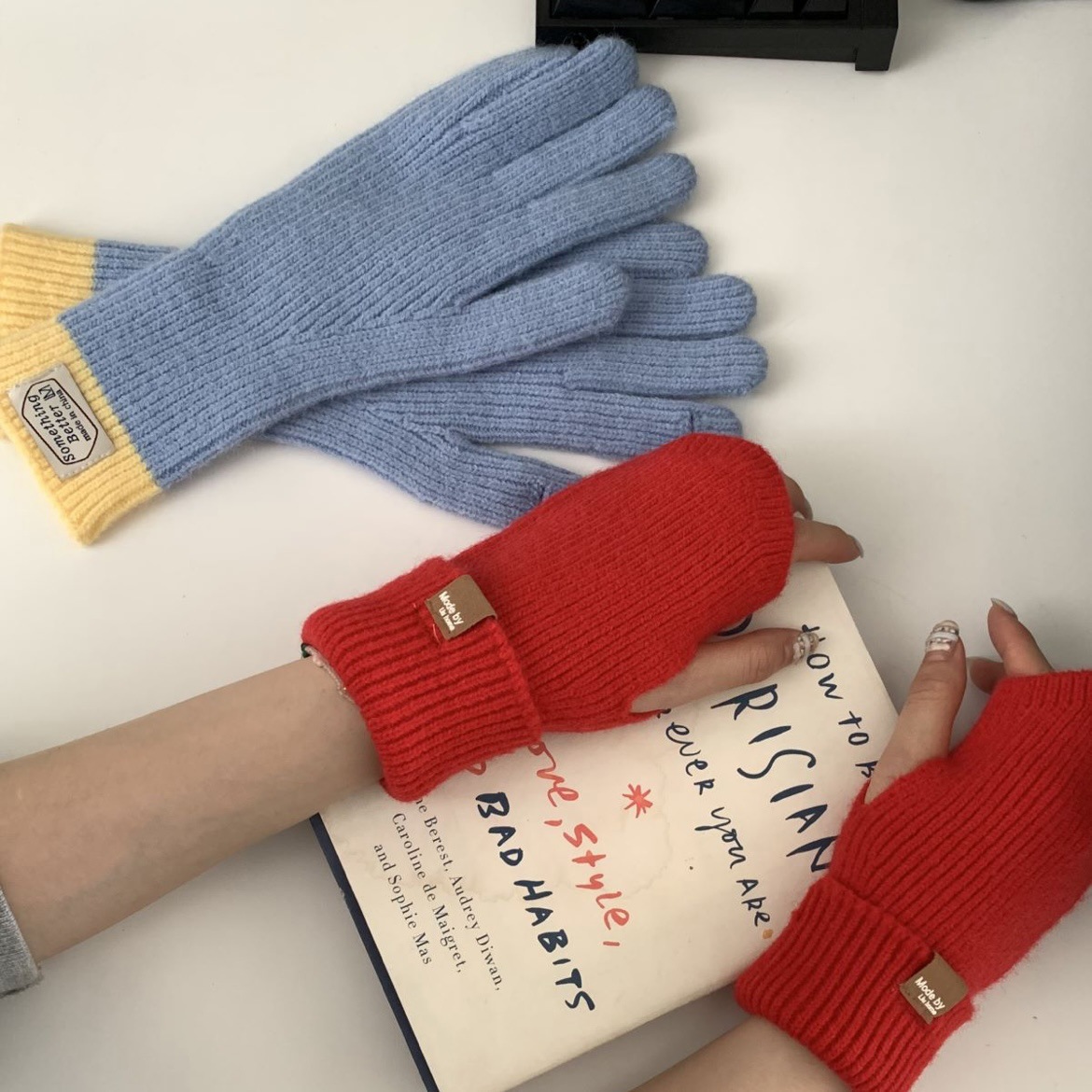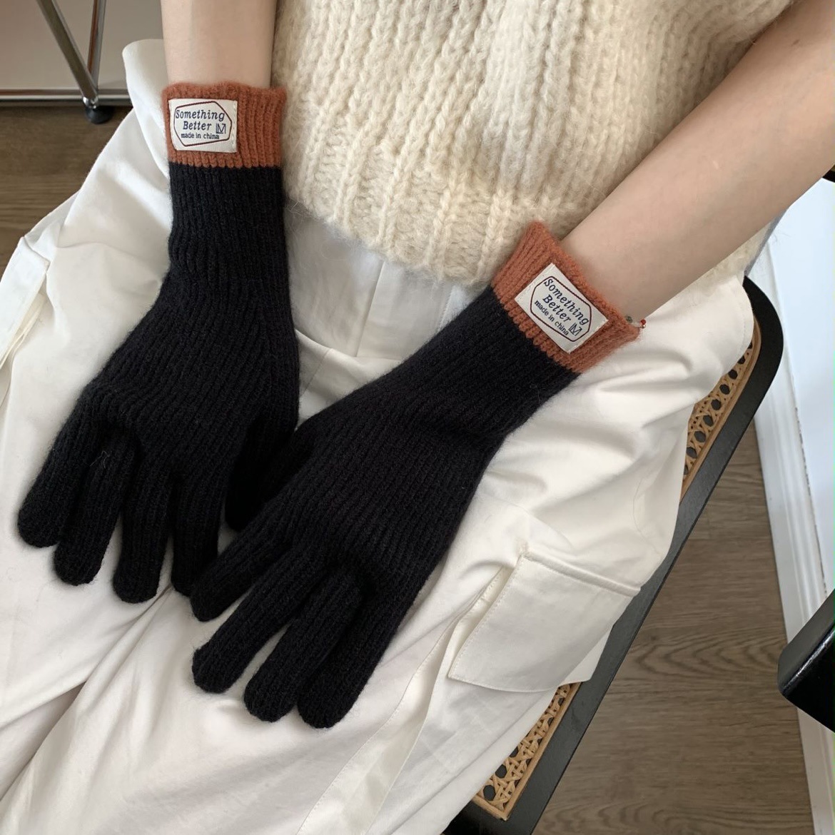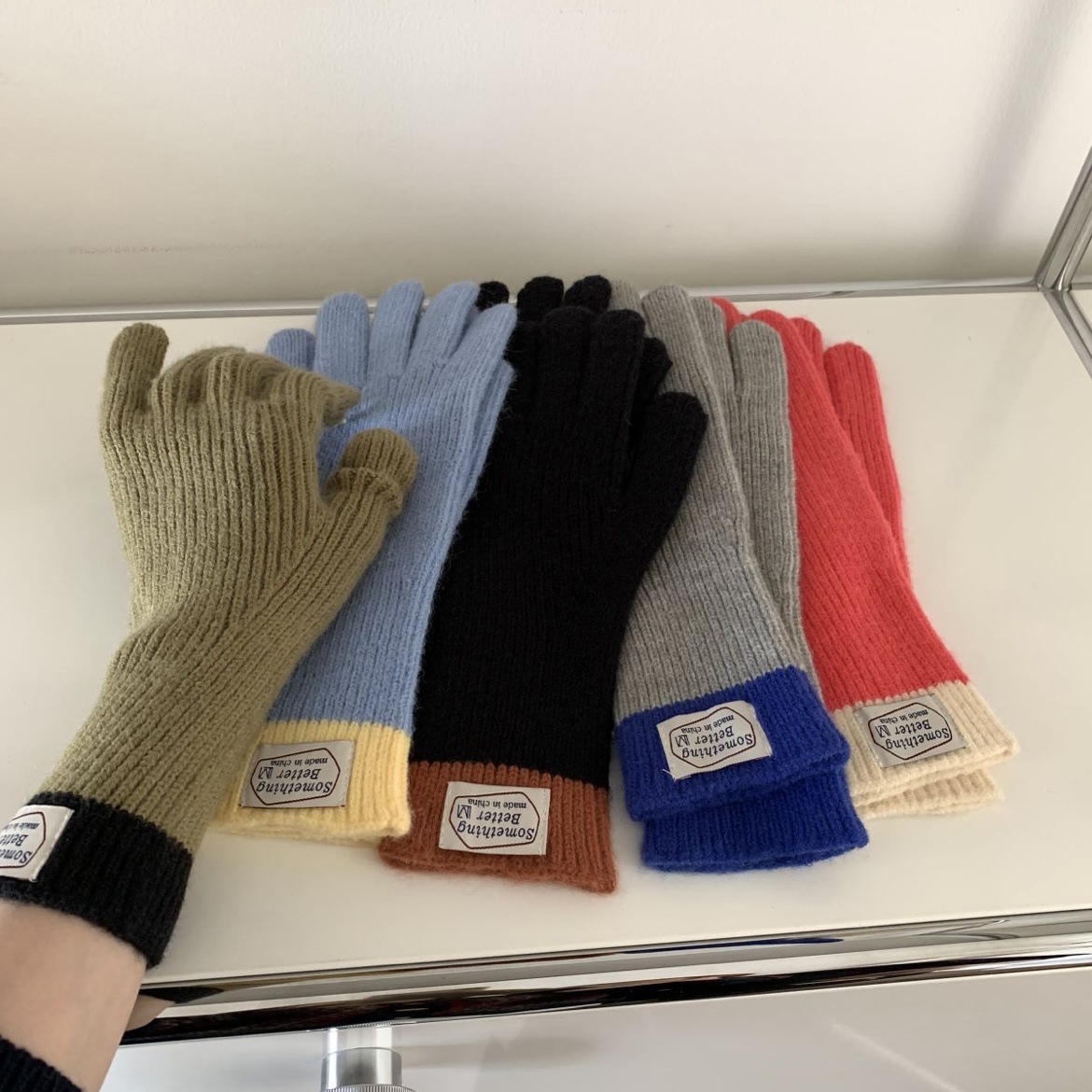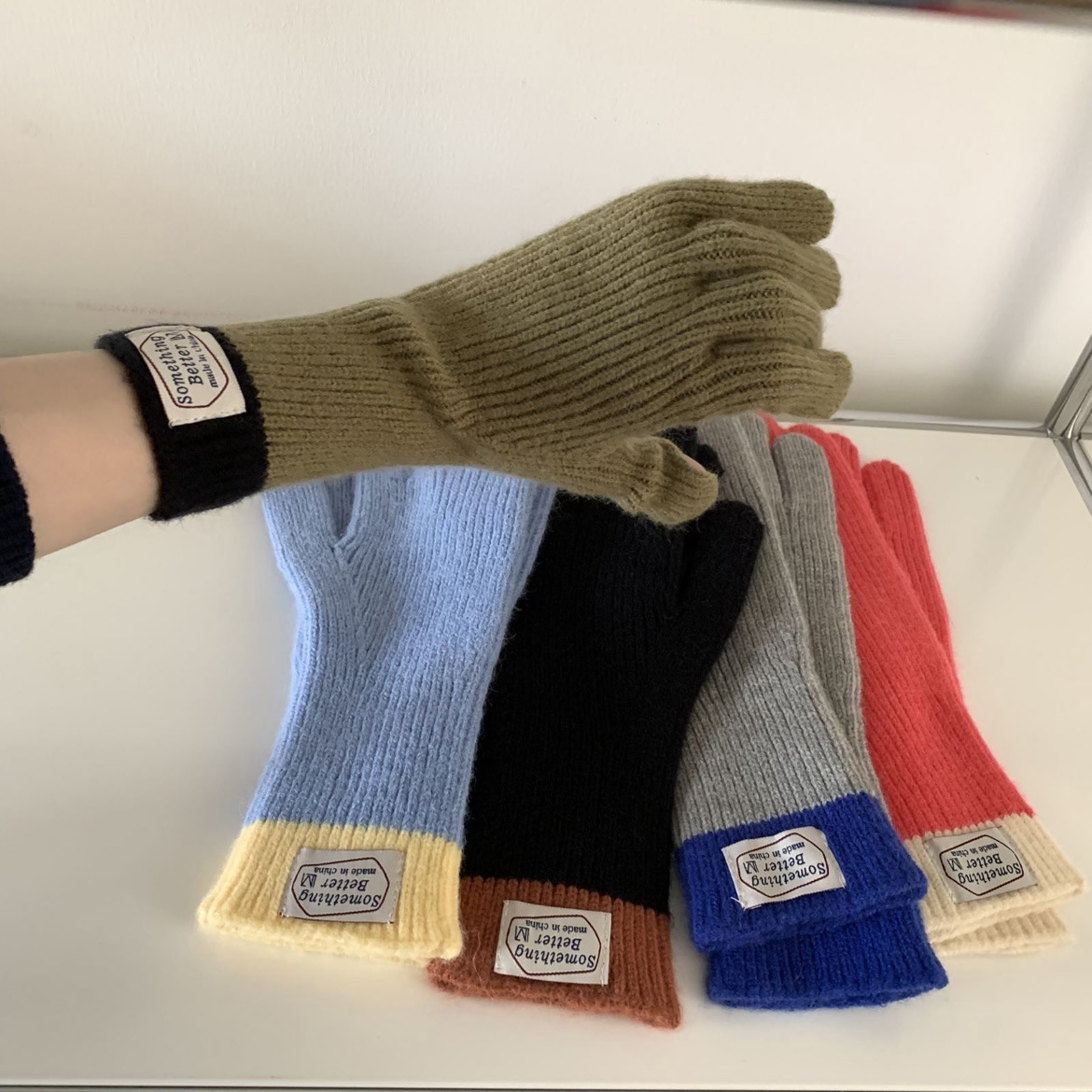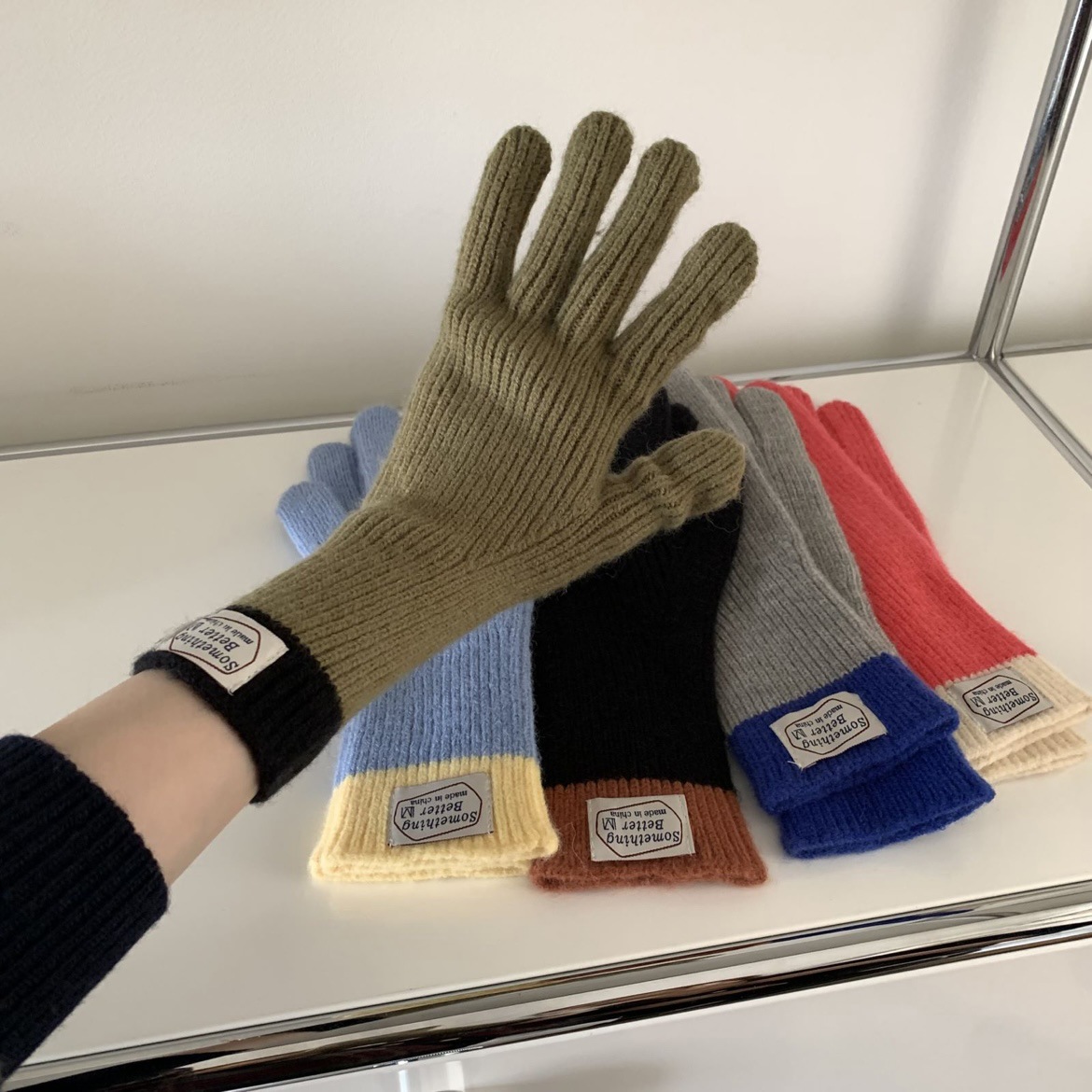 한국 컬러 매칭 터치 스크린 손가락 다섯 손가락 장갑 2023 새로운 가을과 겨울 따뜻한 여성의 색상 대비 블로거스토어 가기