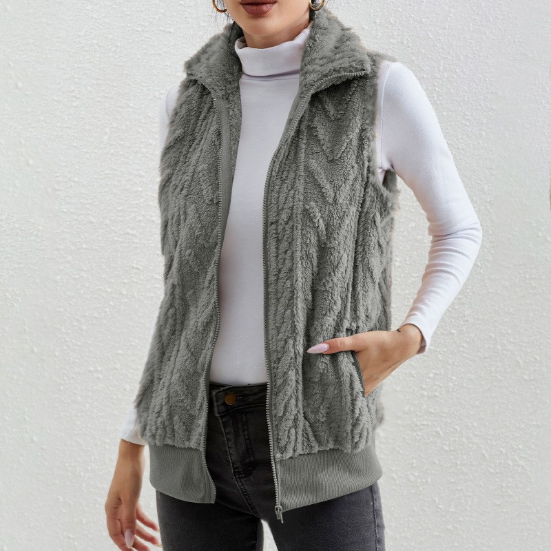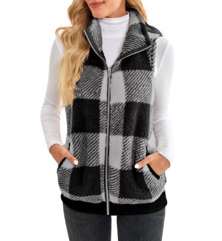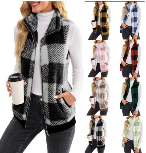 유럽과 미국 여성 양복 조끼 2024 새로운 아마존 격자 무늬 편안한 벨벳 카디건 조끼 스탠드 칼라 민소매 여성 코트