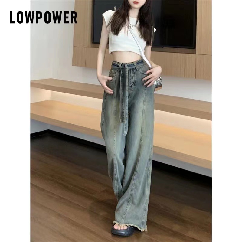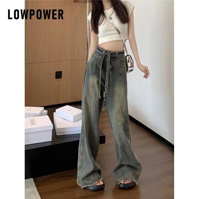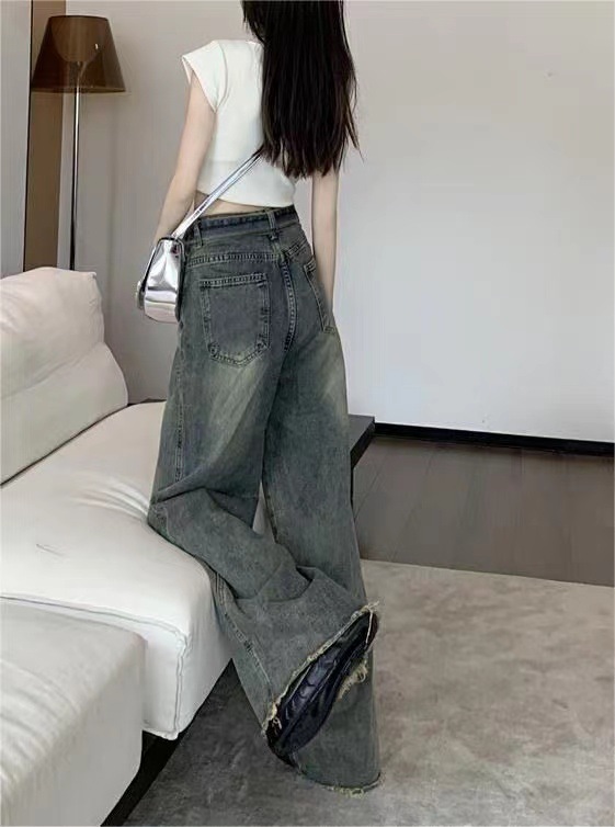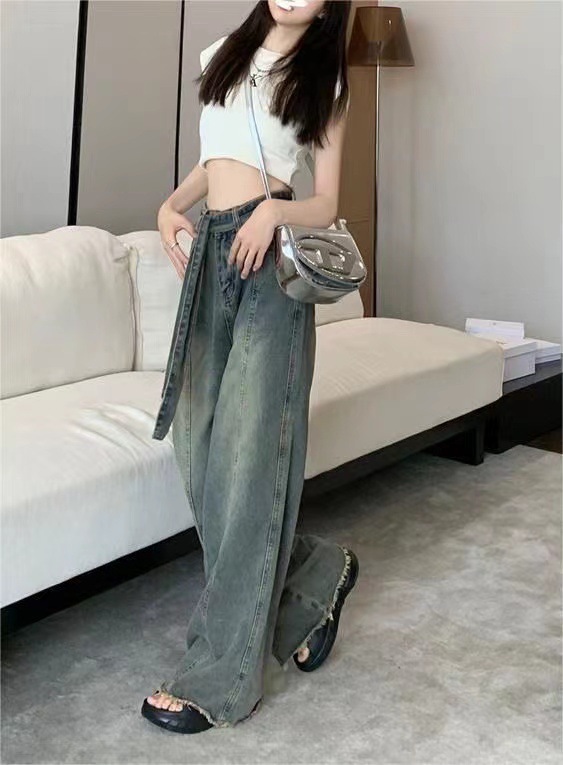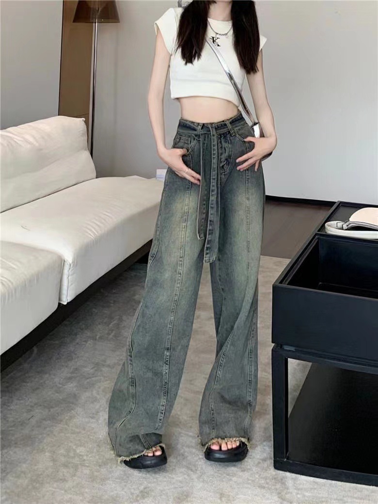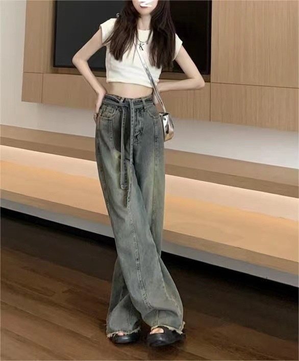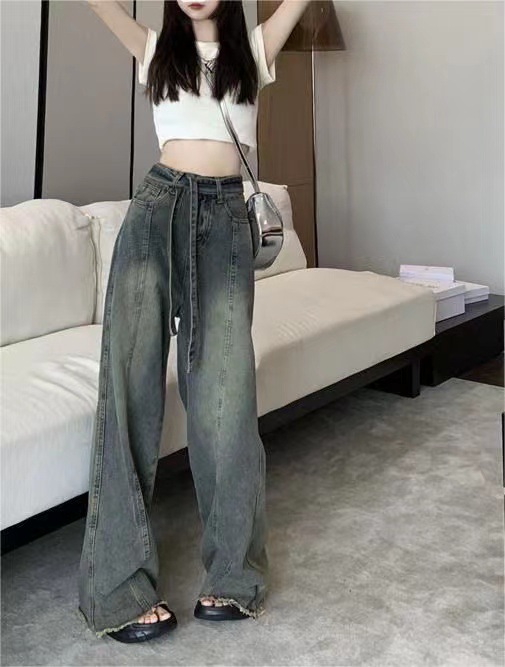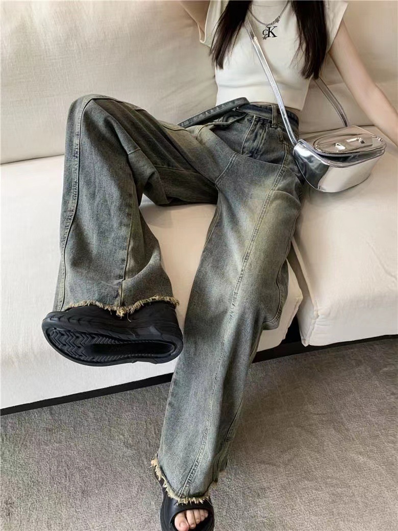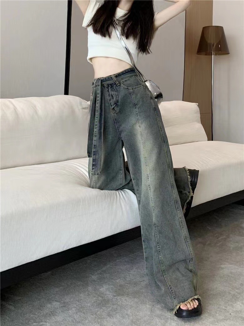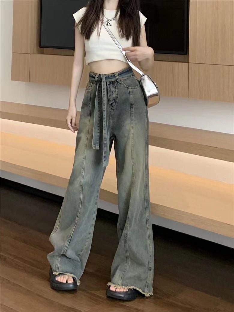 쁘띠 빈티지 스트랩 러프 걸레 청바지 여성의 봄과 여름 새로운 스트레이트 슬림 룩 느슨한 와이드 레그 트렌디 한 바지스토어 가기